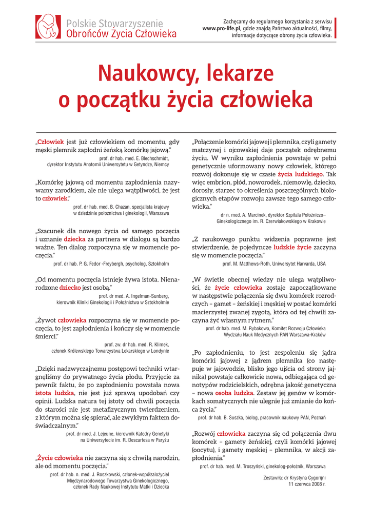 Zachęcamy do regularnego korzystania z serwisu www.pro-life.pl, gdzie znajdą Państwo aktualności, filmy, informacje dotyczące obrony życia człowieka. Naukowcy, lekarze o początku życia człowieka „Człowiek jest już człowiekiem od momentu, gdy męski plemnik zapłodni żeńską komórkę jajową.” prof. dr hab. med. E. Blechschmidt, dyrektor Instytutu Anatomii Uniwersytetu w Getyndze, Niemcy „Komórkę jajową od momentu zapłodnienia nazywamy zarodkiem, ale nie ulega wątpliwości, że jest to człowiek.” prof. dr hab. med. B. Chazan, specjalista krajowy w dziedzinie położnictwa i ginekologii, Warszawa „Szacunek dla nowego życia od samego poczęcia i uznanie dziecka za partnera w dialogu są bardzo ważne. Ten dialog rozpoczyna się w momencie poczęcia.” prof. dr hab. P. G. Fedor -Freybergh, psycholog, Sztokholm „Od momentu poczęcia istnieje żywa istota. Nienarodzone dziecko jest osobą.” prof. dr med. A. Ingelman-Sunberg, kierownik Kliniki Ginekologii i Położnictwa w Sztokholmie „Żywot człowieka rozpoczyna się w momencie poczęcia, to jest zapłodnienia i kończy się w momencie śmierci.” prof. zw. dr hab. med. R. Klimek, członek Królewskiego Towarzystwa Lekarskiego w Londynie „Dzięki nadzwyczajnemu postępowi techniki wtargnęliśmy do prywatnego życia płodu. Przyjęcie za pewnik faktu, że po zapłodnieniu powstała nowa istota ludzka, nie jest już sprawą upodobań czy opinii. Ludzka natura tej istoty od chwili poczęcia do starości nie jest metafizycznym twierdzeniem, z którym można się spierać, ale zwykłym faktem doświadczalnym.” prof. dr med. J. Lejeune, kierownik Katedry Genetyki na Uniwersytecie im. R. Descartesa w Paryżu „Życie człowieka nie zaczyna się z chwilą narodzin, ale od momentu poczęcia.” prof. dr hab. n. med. J. Roszkowski, członek-współzalożyciel Międzynarodowego Towarzystwa Ginekologicznego, członek Rady Naukowej Instytutu Matki i Dziecka „Połączenie komórki jajowej i plemnika, czyli gamety matczynej i ojcowskiej daje początek odrębnemu życiu. W wyniku zapłodnienia powstaje w pełni genetycznie uformowany nowy człowiek, którego rozwój dokonuje się w czasie życia ludzkiego. Tak więc embrion, płód, noworodek, niemowlę, dziecko, dorosły, starzec to określenia poszczególnych biologicznych etapów rozwoju zawsze tego samego człowieka.” dr n. med. A. Marcinek, dyrektor Szpitala Położniczo– Ginekologicznego im. R. Czerwiakowskiego w Krakowie „Z naukowego punktu widzenia poprawne jest stwierdzenie, że pojedyncze ludzkie życie zaczyna się w momencie poczęcia.” prof. M. Matthews-Roth, Uniwersytet Harvarda, USA „W świetle obecnej wiedzy nie ulega wątpliwości, że życie człowieka zostaje zapoczątkowane w następstwie połączenia się dwu komórek rozrodczych – gamet – żeńskiej i męskiej w postać komórki macierzystej zwanej zygotą, która od tej chwili zaczyna żyć własnym rytmem.” prof. dr hab. med. M. Rybakowa, Komitet Rozwoju Człowieka Wydziału Nauk Medycznych PAN Warszawa-Kraków „Po zapłodnieniu, to jest zespoleniu się jądra komórki jajowej z jądrem plemnika (co następuje w jajowodzie, blisko jego ujścia od strony jajnika) powstaje całkowicie nowa, odbiegająca od genotypów rodzicielskich, odrębna jakość genetyczna – nowa osoba ludzka. Zestaw jej genów w komórkach somatycznych nie ulegnie już zmianie do końca życia.” prof. dr hab. B. Suszka, biolog, pracownik naukowy PAN, Poznań „Rozwój człowieka zaczyna się od połączenia dwu komórek – gamety żeńskiej, czyli komórki jajowej (oocytu), i gamety męskiej – plemnika, w akcji zapłodnienia.” prof. dr hab. med. M. Troszyński, ginekolog-położnik, Warszawa Zestawiła: dr Krystyna Cygorijni 11 czerwca 2008 r.