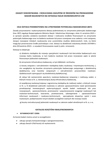 ZASADY DOKONYWANIA I ROZLICZANIA ZAKUPÓW ZE ŚRODKÓW NA PROWADZENIE BADAŃ NAUKOWYCH NA WYDZIALE NAUK EKONOMICZNYCH UW CELE DOTACJI PODMIOTOWEJ NA UTRZYMANIE POTENCJAŁU BADAWCZEGO (BST) Zasady przyznawania i wykorzystywania dotacji podmiotowej na utrzymanie potencjału badawczego (tzw. BST) reguluje Rozporządzenie Ministra Nauki i Szkolnictwa Wyższego z dnia 11 września 2015 r. w sprawie sposobu ustalania wysokości dotacji i rozliczania środków finansowych na utrzymanie potencjału badawczego oraz na badania naukowe lub prace rozwojowe oraz zadania z nimi związane, służące rozwojowi młodych naukowców oraz uczestników studiów doktoranckich. Cele, na które mogą być przeznaczone środki pochodzące z tzw. dotacji na działalność statutową określa USTAWA z dnia 30 kwietnia 2010 r. o zasadach finansowania nauki (z późn. zmianami). Dotacja ta obejmuje: a) działania niezbędne do rozwoju specjalności naukowych lub kierunków badawczych oraz rozwoju kadry naukowej, w tym badania naukowe lub prace rozwojowe ujęte w planie finansowym jednostek naukowych, b) utrzymanie infrastruktury badawczej, w tym bibliotek i archiwów, c) koszty związane z zatrudnieniem niezbędnej kadry naukowej i inżynieryjno-technicznej, (, nie uwzględnia się kosztów utrzymania potencjału badawczego związanego z działalnością dydaktyczną oraz kosztów związanych z zatrudnieniem pracowników naukowodydaktycznych zajmujących się działalnością dydaktyczną), d) zakup lub wytworzenie aparatury naukowo-badawczej związanej z realizacją zadań, o których mowa w lit. a, niestanowiącej dużej infrastruktury badawczej, e) współpracę naukową krajową i zagraniczną niezbędną do realizacji zadań, o których mowa w lit. a, f) działalność jednostki naukowej w zakresie upowszechniania nauki (promowanie przedsięwzięć innowacyjnych wykorzystujących wyniki badań naukowych lub prac rozwojowych, upowszechnianie, promowanie i popularyzowanie osiągnięć naukowych lub naukowo-technicznych, tworzenie, przetwarzanie, udostępnianie i upowszechnianie informacji naukowych i naukowo-technicznych, sporządzanie ekspertyz, opinii i ocen naukowych, podejmowanie innych działań szczególnie ważnych dla rozwoju nauki) g) koszty restrukturyzacji jednostek naukowych w zakresie zadań określonych w lit. a, c–e; KATALOG KOSZTÓW KWALIFIKOWANYCH W RAMACH BST I DSM: Za koszty badań można uznać w szczególności: zakupy sprzętu komputerowego z oprogramowaniem, zakupy danych i/lub koszty ich wytworzenia koszty związane z udziałem w konferencjach naukowych i współpracą naukową, w tym: opłaty konferencyjne, koszty wyjazdów krajowych i zagranicznych, koszty związane z udziałem w szkołach letnich i stażach, zakupy literatury, opłaty za tłumaczenia artykułów, recenzje, publikacje, materiały biurowe i eksploatacyjne, inne koszty, których poniesienie jest niezbędne do prowadzenia badań. Koszty te powinny cechować się związkiem z badaniami i mieć do nich adekwatną skalę (biorąc pod uwagę też liczbę osób zaangażowanych w badania). W RAMACH INNYCH PROGRAMÓW: Koszty kwalifikowane w ramach projektów finansowanych przez Narodowe Centrum Nauki to: koszty wynagrodzeń, stypendiów zakupy aparatury naukowo-badawczej, sprzętu komputerowego, oprogramowania pozostałe koszty bezpośrednie, w tym: koszty usług zlecanych podmiotom zewnętrznym niezbędne do realizacji projektu, wydatki związane z podróżami służbowymi wykonawców projektu oraz kosztami przyjazdu współpracujących zewnętrznych ekspertów, zakup danych, opłaty publikacyjne, zakup literatury naukowej, drobne materiały eksploatacyjne materiały biurowe. Szczegółowy wykaz kosztów, które mogą być ponoszone w ramach projektów NCN, jest publikowany w dokumentacji ogłaszanych konkursów. Dokumentacja ta stanowi podstawę konstrukcji budżetu wniosków przygotowywanych przez pracowników na konkurs. Koszty ponoszone na wykonanie konkretnego, przyznanego projektu badawczego muszą odpowiadać założeniom zapisanym we wniosku. W niektórych projektach NCN dopuszcza ograniczone zmiany zaplanowanych wydatków. To, jakie są możliwości zmian, wskazują warunki konkretnego projektu. Zmiany zawsze wymagają zgody rektora, a często również aneksu do umowy o wykonanie projektu, o który występuje się do NCN za pośrednictwem rektora. Ze strony WNE wystąpienia obsługuje Dziekanat – sekcja ds. badań. Zakupy powinny być dopasowane do harmonogramu projektu, czyli w szczególności zakup sprzętu i oprogramowania powinien poprzedzać wykonywane na nim analizy. Wydatki ponoszone w projektach finansowanych przez Komisję Europejską, Ministerstwo Nauki i Szkolnictwa Wyższego czy Narodowe Centrum Badań i Rozwoju, powinny być zgodne z wytycznymi zapisanymi w dokumentacji konkursu, w ramach którego jest realizowany dany projekt. Wszelkie zmiany wynikłe w trakcie trwania projektu, w tym dotyczące budżetu projektu powinny być dokonywane na podstawie umowy projektu, jak również regulaminu konkursu. Zwykle zmiany (od pewnego progu) wymagają wnioskowania o akceptację do grantodawcy za pośrednictwem rektora. Ze strony WNE wystąpienia obsługuje Dziekanat – sekcja ds. badań. ZAKUP SPRZĘTU, MATERIAŁÓW BIUROWYCH I KSIĄŻEK 1. Wszystkie zakupy muszą być dokonywane zgodnie z procedurami obowiązującymi na UW. Należy sprawdzić, czy planowany zakup musi zostać dokonany w firmie wybranej w przetargu. Dotyczy to przede wszystkim zakupu sprzętu, artykułów biurowych, papieru ksero i biletów lotniczych. Informacje na temat prowadzonych postępowań przetargowych znajdują się na stronie http://www.uw.edu.pl/zamowienia-publiczne/. 2. Zakup usług i sprzętu wymaga podpisania umowy, w której zawarte są postanowienia dotyczące cech kupowanej usługi lub sprzętu, terminy dostaw, zasady udzielanej gwarancji i inne istotne postanowienia dopasowane do przedmiotu umowy. Każda umowa musi być zaop