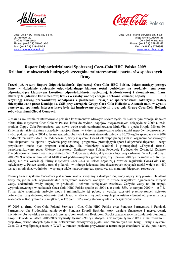 Coca-Cola HBC Polska sp. z o.o. ul. Annopol 20 03-236 Warszawa Phone: (+48 22) 519-51-00 Fax: (+48 22) 519-55-55 www.coca-colahellenic.pl Coca-Cola Poland Services Sp. z o.o. Aleja Armii Ludowej 26 00 - 609 Warszawa Phone: (+48 22) 579 68 68 Fax: (+4822) 5796869 www.cocacola.com.pl Raport Odpowiedzialności Społecznej Coca-Cola HBC Polska 2009 Działania w obszarach budzących szczególne zainteresowanie partnerów społecznych firmy Trzeci już, roczny Raport Odpowiedzialności Społecznej Coca-Cola HBC Polska, dokumentujący postępy firmy w dziedzinie społecznie odpowiedzialnego biznesu został podzielony na rozdziały tematyczne, odpowiadające kluczowym kwestiom odpowiedzialności społecznej, środowiskowej i ekonomicznej firmy. Obszary te (zdrowie konsumentów; troska o zasoby wodne; energia i ochrona klimatu; odpady i recykling; rozwój pracowników; współpraca z partnerami; relacje ze społecznościami lokalnymi) zostały zidentyfikowane przez Komisję ds. CSR przy zarządzie Grupy Coca-Cola Hellenic w Atenach m.in. w wyniku panelowego spotkania interesariuszy; były też inspirowane przyjętymi przez całą Grupę Coca-Cola Hellenic zobowiązaniami Global Compact. Z roku na rok rośnie zainteresowanie polskich konsumentów zdrowym stylem życia. W ślad za tym rozwija się także oferta firm z systemu Coca-Cola w Polsce, która do wyboru napojów niegazowanych dołączyła w 2009 r. m.in. produkt Cappy Cała Pomarańcza, czy nową wodę średniozmineralizowaną MultiVita z ujęcia Kropla Minerałów. Zmienia się także struktura sprzedaży napojów firmy, w której systematycznie rośnie udział napojów niegazowanych i wód: podczas, gdy w 2004 r. łączna sprzedaż obu tych kategorii stanowiła zaledwie 16,7% ogółu sprzedaży – w 2009 r. odsetek ten wzrósł do 31%. Jednocześnie, firmy z systemu Coca-Cola współpracują z m.in. organami państwowymi oraz ekspertami ds. sportu i żywienia przy realizacji programów promujących sport i aktywność fizyczną – czego przykładem może być program edukacyjny dla młodzieży szkolnej i gimnazjalnej „Trzymaj formę”, współorganizowany przez Główny Inspektorat Sanitarny oraz Polską Federację Producentów Żywności Związek Pracodawców w ramach realizacji strategii WHO dotyczącej diety, aktywności fizycznej i zdrowia. W roku szkolnym 2008/2009 wzięło w nim udział 6188 szkół podstawowych i gimnazjów, czyli prawie 780 tys. uczniów – o 160 tys. więcej niż rok wcześniej. Firmy z systemu Coca-Cola w Polsce organizują również regularnie Coca-Cola Cup, największy w Polsce szkolny turniej piłkarski, w którego jedenastu dotychczasowych edycjach udział wzięło ok. 450 tysięcy młodych zawodników - wspierają także masowe imprezy sportowe, np. maratony biegowe i rowerowe. Rozwój firm z systemu Coca-Cola jest nierozerwalnie związany z dostępnością wody najwyższej jakości. Działania firmy mające na celu odpowiedzialne zarządzanie zasobami wodnymi to przede wszystkim: ograniczanie zużycia wody, uzdatnianie wody zużytej w produkcji i ochrona istniejących zasobów. Zużycie wody na litr napoju wyprodukowanego w zakładach Coca-Cola HBC Polska spadło od 2001 r. o około 35%, w samym 2009 r. – o 7 %. Firma stale monitoruje zużycie wody i minimalizuje jej pobór, a wysoką czystość przetworzonych ścieków potwierdza, przykładowo, obecność dzikich ryb w stawach wybudowanych jako ostatni element oczyszczalni przy zakładach w Radzyminie i Staniątkach, w których 100% wody stanowią właśnie oczyszczone ścieki. W 2005 r. firmy Coca-Cola Poland Services i Coca-Cola HBC Polska oraz Fundusz Partnerstwa i Fundacja Partnerstwo dla Środowiska zainicjowały Fundusz Kropli Beskidu, który wspiera finansowo i merytorycznie inicjatywy obywatelskie na rzecz ochrony zasobów wodnych Beskidów. Środki przeznaczone na działalność Funduszu Kropli Beskidu w latach 2005-2009 wyniosły łącznie 690 tys. złotych, a w samym tylko 2009 r. sfinalizowano 10 projektów, wśród których było m.in. odtworzenie historycznej pijalni wód mineralnych św. Kingi. Firmy z systemu Coca-Cola współpracują także z WWF w ramach projektu przywracania naturalnego charakteru Wisły, pod nazwą Coca-Cola HBC Polska sp. z o.o. ul. Annopol 20 03-236 Warszawa Phone: (+48 22) 519-51-00 Fax: (+48 22) 519-55-55 www.coca-colahellenic.pl Coca-Cola Poland Services Sp. z o.o. Aleja Armii Ludowej 26 00 - 609 Warszawa Phone: (+48 22) 579 68 68 Fax: (+4822) 5796869 www.cocacola.com.pl „Rzeki dla Życia”, który ma na celu przywrócenie naturalnego charakteru największej polskiej rzeki i jej dopływów. W jego ramach w latach 2007-2009 do górskich strumieni trafiło ponad 740 tys. sztuk narybku łososia. W ciągu ostatnich lat jednym z najistotniejszych problemów w skali międzynarodowej i krajowej stały się kwestie związane z globalnymi zmianami klimatycznymi. W 2009 r. najważniejszą inwestycją w obszarze oszczędzania energii w Coca-Cola HBC Polska było rozpoczęcie budowy trigeneracyjnego bloku elektrociepłowniczego (CHP) przy zakładzie produkcyjnym w Radzyminie, który pozwoli zakładowi zmniejszyć o ponad 75% tzw. ślad węglowy całkowitą sumę emisji gazów cieplarnianych wywołanych bezpośrednio lub pośrednio podczas produkcji energii elektrycznej, ciepła i chłodu. W 2009 r. Coca-Cola HBC Polska kontynuowała także programy oszczędzania energii, redukując jej zużycie we wszystkich fabrykach w Polsce w 2009 r. do 0,45 MJ na litr produkowanego napoju. Celem firm z systemu Coca-Cola HBC jest stworzenie zamkniętego obiegu opakowań, w którym wszystkie zużyte opakowania będą przetwarzane na nowe. Firmy co roku zmniejszają ilość generowanych odpadów, poddając jednocześnie coraz więcej odpadów recyklingowi. W 2009 r. waga opakowań wód w butelkach 0,5 l PET została zmniejszona o 20%, natomiast recyklingowi poddano 97% odpadów wytworzonych w zakładach produkcyjnych; tworzywa z 