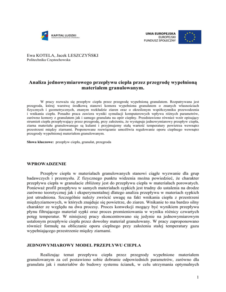 Ewa KOTELA, Jacek LESZCZYŃSKI Politechnika Częstochowska Analiza jednowymiarowego przepływu ciepła przez przegrodę wypełnioną materiałem granulowanym. W pracy rozważa się przepływ ciepła przez przegrodę wypełnioną granulatem. Rozpatrywana jest przegroda, której warstwę środkową stanowi komora wypełniona granulatem o znanych własnościach fizycznych i geometrycznych, znanym rozkładzie ziaren oraz o określonym współczynniku przewodzenia i wnikania ciepła. Ponadto praca zawiera wyniki symulacji komputerowych wpływu różnych parametrów, zarówno komory z granulatem jak i samego granulatu na opór cieplny. Przedstawiono również wzór opisujący strumień ciepła przepływający przez przegrodę, przy założeniu, że występuje jednowymiarowy przepływ ciepła, ziarna materiału granulowanego są kulami i przyjmujemy stałą wartość temperatury powietrza wewnątrz przestrzeni między ziarnami. Proponowane rozwiązanie umożliwia regulowanie oporu cieplnego wewnątrz przegrody wypełnionej materiałem granulowanym. Słowa kluczowe: przepływ ciepła, granulat, przegroda WPROWADZENIE Przepływ ciepła w materiałach granulowanych stanowi ciągłe wyzwanie dla grup badawczych i przemysłu. Z fizycznego punktu widzenia można powiedzieć, że charakter przepływu ciepła w granulacie zbliżony jest do przepływu ciepła w materiałach porowatych. Ponieważ profil przepływu w samych materiałach sypkich jest trudny do ustalenia na drodze zarówno teoretycznej jak i eksperymentalnej dlatego analiza przepływu w materiach sypkich jest utrudniona. Szczególnie należy zwrócić uwagę na fakt wnikania ciepła z przestrzeni międzyziarnowych, w których znajduje się powietrze, do ziaren. Wnikanie to ma bardzo silny charakter ze względu na dwa procesy. Proces konwekcji mogący być wynikiem przepływu płynu filtrującego materiał sypki oraz proces promieniowania w wyniku różnicy czwartych potęg temperatur. W niniejszej pracy skoncentrowano się jedynie na jednowymiarowym ustalonym przepływie ciepła przez dowolny materiał granulowany. W pracy zaproponowano również formułę na obliczanie oporu cieplnego przy założeniu stałej temperatury gazu wypełniającego przestrzenie między ziarnami. JEDNOWYMIAROWY MODEL PRZEPŁYWU CIEPŁA Realizując temat przepływu ciepła przez przegrody wypełnione materiałem granulowanym za cel postawiono sobie dobranie odpowiednich parametrów, zarówno dla granulatu jak i materiałów do budowy systemu ścianek, w celu utrzymania optymalnych 1 warunków temperaturowych po jednej stronie przegrody bez względu na warunki panujące po drugiej stronie. Rozważa się przegrodę o zmiennym oporze cieplnym, która charakteryzuje się tym, że wewnątrz niej znajduje się materiał granulowany o dużym współczynniku przewodzenia λzz , natomiast niewielkim współczynniku wnikania ciepła z otoczenia dla tego materiału αzz, którym może być np. guma piankowa, gazogips, żwir pumeksowy. Granulat jest ograniczony po obu stronach systemem ścianek zewnętrznych. Ścianki te mają określone szerokości δj i współczynniki przewodzenia ciepła λj. Przestrzenie między ziarnami materiału granulowanego w wewnętrznej objętości komory określa współczynnik porowatości przegrody ε i współczynnik przewodzenia ciepła λg dla powietrza filtrującego. Powietrze przepływające między pustymi miejscami w przestrzeni wypełnionej materiałem granulowanym wymienia ciepło zarówno z ziarnami granulatu jak i z przegrodami ograniczającymi granulat. Wymiana ciepła następuje w taki sposób, iż ciepło o znanej temperaturze po jednej stronie przegrody przenika przez system kolejnych ścianek aż do komory wypełnionej materiałem granulowanym, w której następuje modyfikacja wymiany ciepła spowodowana oddziaływaniem powietrza zewnętrznego (doprowadzonego przez nas) o regulowanej temperaturze Tp i prędkości wp. W dalszej kolejności ciepło przenika przez system ścianek po drugiej stronie przegrody, a ostatecznie zostaje oddane na drugą stronę przegrody kształtując tam temperaturę T2. Rys.1 Przekrój poprzeczny przegrody, na której dokonywano symulacji komputerowych 2 Zakładając, że występuje jednowymiarowy przepływ ciepła oraz ziarna materiału granulowanego są kulami i przyjmując stałą wartość temperatury powietrza wewnątrz przestrzeni między ziarnami można wyznaczyć strumień ciepła przepływający w kierunku od zewnątrz do wewnątrz pomieszczenia jako • Q= A ⋅ (T1 − T2 ) R (1.1) gdzie A jest powierzchnią, przez którą płynie ciepło [m2], T1 jest temperaturą panującą na zewnątrz pomieszczenia [K], T2 jest temperaturą panującą wewnątrz pomieszczenia [K] oraz R jest oporem cieplnym przegrody [(m2K)/W] określonym jako 2 1 i =1 αi R=∑ δj 1 + α ⎞ ε ⋅ λ g + (1 − ε ) ⋅ λ zz ⎛ j =1 λ j ε ⎜ α pz + α pw + zz ⋅ 3 36π (1 − ε )V 2 ⎟ + A δp ⎝ ⎠ n +∑ (1.2) W powyższym wzorze przyjęto następujące oznaczenia: αi - współczynniki wnikania ciepła dla powietrza oddziałującego na ścianki zewnętrzną i wewnętrzną, (i=1,2) [W/(m2K)] αpw, αpz - współczynniki wnikania ciepła dla powietrza filtrującego materiał granulowany i oddziałującego na ścianki ograniczające ruch ziaren [W/(m2K)] αzz - współczynnik wnikania ciepła do ziaren dla powietrza filtrującego materiał granulowany [W/(m2K)] λg - współczynnik przewodzenia ciepła w powietrzu filtrującym materiał granulowany [W/(mK)] λj - współczynniki przewodzenia ciepła dla ścianek otaczających materiał granulowany, (j=1,…,n) [W/(mK)] λzz - współczynnik przewodzenia ciepła dla ziaren materiału granulowanego [W/(mK)] δj - szerokości poszczególnych ścianek otaczających materiał granulowany, (j=1,…,n) [m] δp - szerokość przegrody wypełnionej materiałem granulowanym [m] ε - porowatość złoża powstałego z wypełnienia materiałem granulowanym wewnętrznej 