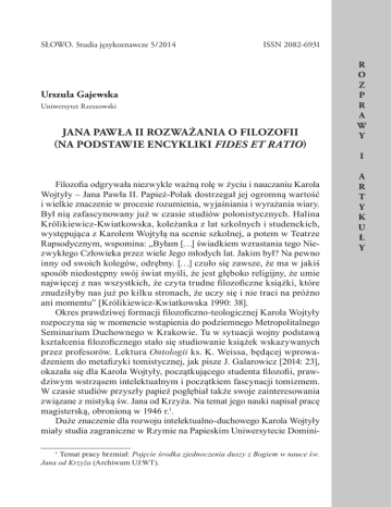SŁOWO. Studia językoznawcze 5 / 2014 ISSN 2082-6931 Urszula Gajewska Uniwersytet Rzeszowski JANA PAWŁA II ROZWAŻANIA O FILOZOFII (NA PODSTAWIE ENCYKLIKI FIDES ET RATIO) R O Z P R A W Y I Filozofia odgrywała niezwykle ważną rolę w życiu i nauczaniu Karola Wojtyły – Jana Pawła II. Papież-Polak dostrzegał jej ogromną wartość i wielkie znaczenie w procesie rozumienia, wyjaśniania i wyrażania wiary. Był nią zafascynowany już w czasie studiów polonistycznych. Halina Królikiewicz-Kwiatkowska, koleżanka z lat szkolnych i studenckich, występująca z Karolem Wojtyłą na scenie szkolnej, a potem w Teatrze Rapsodycznym, wspomina: „Byłam […] świadkiem wzrastania tego Niezwykłego Człowieka przez wiele Jego młodych lat. Jakim był? Na pewno inny od swoich kolegów, odrębny. […] czuło się zawsze, że ma w jakiś sposób niedostępny swój świat myśli, że jest głęboko religijny, że umie najwięcej z nas wszystkich, że czyta trudne filozoficzne książki, które znudziłyby nas już po kilku stronach, że uczy się i nie traci na próżno ani momentu” [Królikiewicz-Kwiatkowska 1990: 38]. Okres prawdziwej formacji filozoficzno-teologicznej Karola Wojtyły rozpoczyna się w momencie wstąpienia do podziemnego Metropolitalnego Seminarium Duchownego w Krakowie. Tu w sytuacji wojny podstawą kształcenia filozoficznego stało się studiowanie książek wskazywanych przez profesorów. Lektura Ontologii ks. K. Weissa, będącej wprowadzeniem do metafizyki tomistycznej, jak pisze J. Galarowicz [2014: 23], okazała się dla Karola Wojtyły, początkującego studenta filozofii, prawdziwym wstrząsem intelektualnym i początkiem fascynacji tomizmem. W czasie studiów przyszły papież pogłębiał także swoje zainteresowania związane z mistyką św. Jana od Krzyża. Na temat jego nauki napisał pracę magisterską, obronioną w 1946 r.1. Duże znaczenie dla rozwoju intelektualno-duchowego Karola Wojtyły miały studia zagraniczne w Rzymie na Papieskim Uniwersytecie Domini1 Temat pracy brzmiał: Pojęcie środka zjednoczenia duszy z Bogiem w nauce św. Jana od Krzyża (Archiwum UJ:WT). A R T Y K U Ł Y 36 URSZULA GAJEWSKA kańskim – Angelicum, w trakcie których wzbogacał swą filozoficzno-teologiczną wiedzę o tomizmie i w dalszym ciągu o myśli św. Jana od Krzyża. Tu napisał po łacinie rozprawę doktorską dotyczącą jego teologii wiary2. Po powrocie do kraju po dwóch latach pracy duszpasterskiej (w parafiach: Niegowić oraz św. Floriana w Krakowie) ks. dr Karol Wojtyła otrzymał urlop na napisanie pracy habilitacyjnej. Rezultatem dwuletniego studium była filozoficzna rozprawa na temat etyki Maxa Schelera3. Pozytywny wynik kolokwium habilitacyjnego umożliwił Karolowi Wojtyle rozpoczęcie pracy w Metropolitalnym Seminarium Duchownym w Krakowie oraz na Uniwersytecie Jagiellońskim. Wkrótce zaczął współpracować także z Katolickim Uniwersytetem Lubelskim, by w 1957 r. objąć Katedrę Etyki [por. Galarowicz 2014: 24–25]4. Podejmując pracę akademicką na KUL-u, stwierdza J. Galarowicz [2005: 53–54], ks. Karol Wojtyła był już myślicielem dojrzałym. Decydującą rolę w jego formacji filozoficznej odegrały cztery spotkania: z mistyką św. Jana od Krzyża, na temat którego napisał rozprawę doktorską Doctrina de fide apud S. Joannem a Cruce, z tomizmem, który studiował na Wydziale Teologicznym w Krakowie i w Angelicum w Rzymie, z fenomenologią Maxa Schelera, w której to dziedzinie się habilitował, oraz z etyką Immanuela Kanta. W centrum myśli filozoficznej i działalności Karola Wojtyły, a potem w samym sercu jego nauczania jako papieża znajduje się człowiek jako osoba, jego wyjątkowa wartość i godność5. Kardynał Joseph Ratzinger pisze, że nie uprawia on filozofii jako wiedzy podręcznikowej. Jego myśl jest mozolną pracą konieczną do trwania w obliczu rzeczywistości; jest wysiłkiem zrozumienia tego, co to znaczy prawdziwe życie, prawdziwe dobro człowieka, prawdziwa miłość; i jest spotkaniem ze współczesnym człowiekiem poszukującym i zadającym pytania [Ratzinger 1999: 14]. Odkrywanie prawdy o człowieku, odsłanianie tajemnicy jego istnienia, wielkości i nieskończonej wartości, wyjaśnianie celu i sensu życia ludzkiego, stało się jednym z motywów przewodnich pontyfikatu Jana Pawła II. Personalistyczna wizja człowieka Karola Wojtyły, filozoficzna koncepcja osoby ludzkiej, jej wolności i moralności, zaprezentowane przede wszystkim w pracach Miłość odpowiedzialność (1960), Osoba i czyn (1969), Wykłady lubelskie (1968), Człowiek w polu odpowiedzialności (1991), Mężczyzną i niewiastą stworzył ich (1986), rozbrzmiewają głoś2 K. Wojtyła, Zagadnienie wiary w dziełach św. Jana od Krzyża, tłum. O. Leonard od Męki Pańskiej, Kraków 1990. 3 K. Wojtyła, Ocena możliwości zbudowania etyki chrześcijańskiej przy założeniach systemu Maxa Schelera, Lublin 1959. 4 H. Bortnowska [1979: 8], uczennica Karola Wojtyły, pisze: „W przeciwieństwie do uprawiania teologii filozofowanie jest zajęciem bardziej polskim. […] w sposób dla polskiej formacji typowy kleryk i ksiądz Wojtyła, mając głębokie zainteresowania religijne, karmił je od początku także filozofią i w końcu został wykładowcą filozofii, a nie teologii”. 5 O papieskiej wizji godności człowieka zob. U. Gajewska [2014]. Jana Pawła II rozważania o filozofii (na podstawie encykliki „Fides et ratio”) 37 nym echem w całym nauczaniu Polskiego Papieża, w jego kazaniach, orędziach, listach pasterskich, adhortacjach, a szczególnie w encyklikach. Przedmiotem niniejszego artykułu nie jest jednak analiza personalizmu antropologicznego Karola Wojtyły – Jana Pawła II jako koncepcji filozoficznej, jako filozoficznego języka jego nauczania, czy też klucza do zrozumienia jego przesłania. Zainteresowanych tą szczególnie pociągającą tematyką odsyłam do prac J. Galarowicza [2000, 2005, 2014], J.