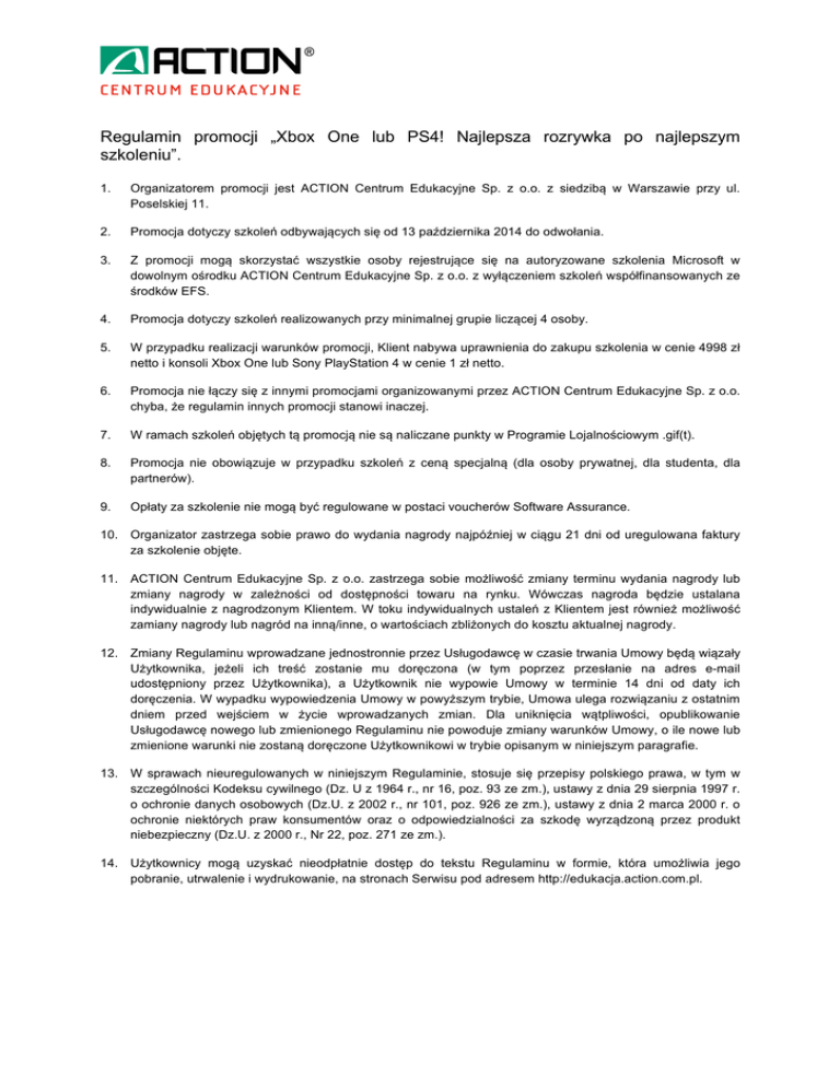 Regulamin promocji „Xbox One lub PS4! Najlepsza rozrywka po najlepszym szkoleniu”. 1. Organizatorem promocji jest ACTION Centrum Edukacyjne Sp. z o.o. z siedzibą w Warszawie przy ul. Poselskiej 11. 2. Promocja dotyczy szkoleń odbywających się od 13 października 2014 do odwołania. 3. Z promocji mogą skorzystać wszystkie osoby rejestrujące się na autoryzowane szkolenia Microsoft w dowolnym ośrodku ACTION Centrum Edukacyjne Sp. z o.o. z wyłączeniem szkoleń współfinansowanych ze środków EFS. 4. Promocja dotyczy szkoleń realizowanych przy minimalnej grupie liczącej 4 osoby. 5. W przypadku realizacji warunków promocji, Klient nabywa uprawnienia do zakupu szkolenia w cenie 4998 zł netto i konsoli Xbox One lub Sony PlayStation 4 w cenie 1 zł netto. 6. Promocja nie łączy się z innymi promocjami organizowanymi przez ACTION Centrum Edukacyjne Sp. z o.o. chyba, że regulamin innych promocji stanowi inaczej. 7. W ramach szkoleń objętych tą promocją nie są naliczane punkty w Programie Lojalnościowym .gif(t). 8. Promocja nie obowiązuje w przypadku szkoleń z ceną specjalną (dla osoby prywatnej, dla studenta, dla partnerów). 9. Opłaty za szkolenie nie mogą być regulowane w postaci voucherów Software Assurance. 10. Organizator zastrzega sobie prawo do wydania nagrody najpóźniej w ciągu 21 dni od uregulowana faktury za szkolenie objęte. 11. ACTION Centrum Edukacyjne Sp. z o.o. zastrzega sobie możliwość zmiany terminu wydania nagrody lub zmiany nagrody w zależności od dostępności towaru na rynku. Wówczas nagroda będzie ustalana indywidualnie z nagrodzonym Klientem. W toku indywidualnych ustaleń z Klientem jest również możliwość zamiany nagrody lub nagród na inną/inne, o wartościach zbliżonych do kosztu aktualnej nagrody. 12. Zmiany Regulaminu wprowadzane jednostronnie przez Usługodawcę w czasie trwania Umowy będą wiązały Użytkownika, jeżeli ich treść zostanie mu doręczona (w tym poprzez przesłanie na adres e-mail udostępniony przez Użytkownika), a Użytkownik nie wypowie Umowy w terminie 14 dni od daty ich doręczenia. W wypadku wypowiedzenia Umowy w powyższym trybie, Umowa ulega rozwiązaniu z ostatnim dniem przed wejściem w życie wprowadzanych zmian. Dla uniknięcia wątpliwości, opublikowanie Usługodawcę nowego lub zmienionego Regulaminu nie powoduje zmiany warunków Umowy, o ile nowe lub zmienione warunki nie zostaną doręczone Użytkownikowi w trybie opisanym w niniejszym paragrafie. 13. W sprawach nieuregulowanych w niniejszym Regulaminie, stosuje się przepisy polskiego prawa, w tym w szczególności Kodeksu cywilnego (Dz. U z 1964 r., nr 16, poz. 93 ze zm.), ustawy z dnia 29 sierpnia 1997 r. o ochronie danych osobowych (Dz.U. z 2002 r., nr 101, poz. 926 ze zm.), ustawy z dnia 2 marca 2000 r. o ochronie niektórych praw konsumentów oraz o odpowiedzialności za szkodę wyrządzoną przez produkt niebezpieczny (Dz.U. z 2000 r., Nr 22, poz. 271 ze zm.). 14. Użytkownicy mogą uzyskać nieodpłatnie dostęp do tekstu Regulaminu w formie, która umożliwia jego pobranie, utrwalenie i wydrukowanie, na stronach Serwisu pod adresem http://edukacja.action.com.pl.