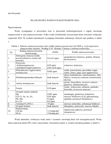 Jan Drzymała WŁAŚCIWOŚCI WODNYCH ROZTWORÓW SOLI Wprowadzenie Wody występujące w przyrodzie oraz w procesach technologicznych z reguły zawierają rozpuszczone w niej zanieczyszczenia. Tylko woda wielokrotnie oczyszczana może zawierać wyłącznie cząsteczki H2O. W wodach naturalnych występują różnorakie substancje, których spis podano w tabeli 1. Tabela 1. Główne zanieczyszczenia wód, źródła zanieczyszczeń oraz ich NDS-y, czyli najwyższe dopuszczalne stężenie. Według N.W. Skinder, Chemia a ochrona środowiska Rodzaj zanieczyszczenia Lp. (NDS) Źródło zanieczyszczenia chemicznego Detergenty (inaczej środki gospodarstwa domowe, pralnie, flotacje 1. powierzchniowo czynne lub 0,2 0,5 ppm przemysłowe tensydy) Pestycydy 0,02 ppm 2. -fosforoorganioczne rolnictwo, leśnictwo -polichlorowęglowodorowe 0,03 0,05 ppm Policykliczne węglowodory asfalt, petrochemia, przeróbka węgla, 3. 0,002 ppm aromatyczne sadza, smary, papa, dym papierosowy płyny hydrauliczne, transformatory, farb, 4. Polichloropochodne bifenylu brak danych lakiery, tworzywa sztuczne, konserwanty drewna przem. barwników, tworzyw sztuczn. 5. Aminy aromatyczne brak danych gumowy, farmaceutyczny ścieki , koksownie, rafinerie, garbniki, 6. Fenole 0,20 ppm barwniki, tworzywa sztuczne Związki metali ciężkich Hg 0,001 ppm metalurgia, górnictwo, hutnictwo, 7. Cd, Cr, Se, As, Ni, 0,05 ppm nawozy fosforowe (Cd), galwanizacja, Pb, Mn, 0,1ppm spalanie, przemysł zbrojeniowy Cu, Fe 0,5 ppm 8. Azotany(V) (NO3-) 10 ppm nawozy mineralne, substancje białkowe 9. Związki fosforu brak danych detergenty, pestycydy, nawozy fekalia Radioizotopy elektrownie jądrowe, przemysł 10. 226 Ra 111mBq/dm3 zbrojeniowy 90 Sr 370mBq/dm3 Wody naturalne, zwłaszcza wody mórz i oceanów zawierają dużo soli nieorganicznych. Wody słone stanowią około 69% wód w przyrodzie. Zawartości jonów w wodzie morskiej podano w tabeli 2. 1 Tabela 2. Przykładowe zawartości jonów w wodzie morskiej i słodkiej. Według CRC Handbook, 1986 Jony Zawartość [mg/l] woda morska Na+ K+ Mg2+ Ca2+ ClS C 1,05·104 3,80·102 1,35·103 4,00·102 1,9·104 8,85·102 2,80·101 Rozpuszczaniu substancji w wodzie towarzyszą efekty cieplne. Roztwór wodny może obniżać, podwyższać lub nie zmieniać swojej temperatury w wyniku rozpuszczania w nim substancji. Rozpuszczaniu towarzyszą efekty endotermiczne lub egzotermiczne. Reakcja egzotermiczna polega na wydzielaniu się ciepła z układu podczas reakcji, gdy reakcja endotermiczna prowadzi do pochłaniania ciepła. W wyniku zmiany temperatury układu następuje w nim przesunięcie stanu równowagi reakcji chemicznej. O kierunku tych zmian mówi jakościowo reguła Le Chateliera-Brauna. Według niej, gdy warunki układu znajdującego się w stanie równowagi ulegają zmianie, położenie równowagi przesuwa się w takim kierunku, jakby dążyło do przywrócenia pierwotnych warunków. Jeżeli reakcja zapisana ogólnie jako: AB = A+ + B- ( Ho = -12 kJ) (1) jest jak napisano reakcją egzotermiczną, to obniżanie temperatury układu powoduje przesuwanie stanu równowagi w prawo, gdyż układ stara się o dostarczanie ciepła, które jest odbierane przez obniżanie temperatury. Gdyby reakcji (1) była endotermicznej, wtedy obniżanie temperatury powodowałoby przesuwanie się stanu równowagi w lewo. W równaniu 1 Ho oznacza standardową entalpię reakcji. Jeżeli układ oddaje ciepło to Ho jest ujemne (bo układ traci ciepło). Efekty termiczne reakcji chemicznych i procesów opisuje termodynamika chemiczna. Najczęściej używaną funkcją termodynamiczną stosowaną do opisu efektów termodynamicznych jest właśnie entalpia (H). Podaje się ją w postaci zmian tej funkcji czyli Ho gdzie symbol oznacza zmianę (przyrost) a symbol o stan standardowy. Zmiana entalpii w czasie reakcji jest równa zmianie entalpii składników układu biorących udział w reakcji i wyraża się ją przy stałym ciśnieniu i temperaturze. Entalpię egzotermicznej reakcji chemicznej ( Ho)reakcji można opisać za pomocą równania: ( Ho)reakcji= ( Hof)produków - ( Hof)substratów 2 (2), gdzie ( Hof) oznacza standardowe entalpie tworzenia indywiduów chemicznych. Dane termodynamiczne reakcji chemicznych można obliczyć w oparciu o dane, które można znaleźć w tablicach. W tabeli 3 podano przykładowe wartości ( Ho), a także innej funkcji termodynamicznej zwanej entalpią swobodną ( Gof). Tabela 3. Przykładowe wartości standardowych wartości entalpii ( Ho) i entalpii swobodnej ( Go) tworzenia indywiduów chemicznych w temperaturze 298K. Według CRC Handbook, 1986. Substancja Stan skupienia Hof,298, kJ/mol Gof,298, kJ/mol NaCl(s) ciało stałe -411,15 -384,15 Na+(aq) jon w fazie wodnej -240,12 -261,89 Cl (aq) jon w fazie wodnej -167,16 -131,26 MgCl2(s) ciało stałe -641,3 -591,8 CaCl2(s) ciało stałe -795,8 -748,1 2+ Mg (aq) jon w fazie wodnej -466,9 -454,8 Ca2+(aq) jon w fazie wodnej -542,8 -553,5 + H (aq) jon w fazie wodnej 0 0 HCl(g) gaz -92,3 -95,3 KCl(s) ciało stałe -436,75 -409,15 K+(aq) jon w fazie wodnej -252,38 -283,26 Rozpuszczanie soli w wodzie przy stałej temperaturze roztworu wodnego następuje do pewnego momentu, gdy iloczyn stężenia jonów zaczyna przekraczać pewną wartość zwaną iloczynem rozpuszczalności. Iloczyn rozpuszczalności soli można wyznaczyć eksperymentalnie, ale także można obliczyć w oparciu o wspomnianą funkcję termodynamiczną zwaną entalpią swobodną lub potencjałem termodynamicznym Gibbsa. Jest to możliwe ponieważ: ( Go)reakcji= ( Gof)produków - ( Gof)substratów (3) oraz że: ( Go)reakcji = -RT ln K (4), gdzie: R= 8,3143 J/(mol K) T=298.15K RT= 2,4789 kJ/mol. Dla reakcji rozpuszczania, zapisanej ogólnie jako: MmXn(s) = mMn+(aq) + nXm-(aq) ( Go)reakcji= m Gof (Mn+(aq)) + n Gof (Xm-(aq))- Gof (MmXn,s) 3 (5) (6) oraz ln K= - ( Go)reakcji/ RT (7). Należy pamiętać, że wyrażenie na stałą równowagi reakcji K zapisanej równaniem 5 ma postać: K =(cMn+(a