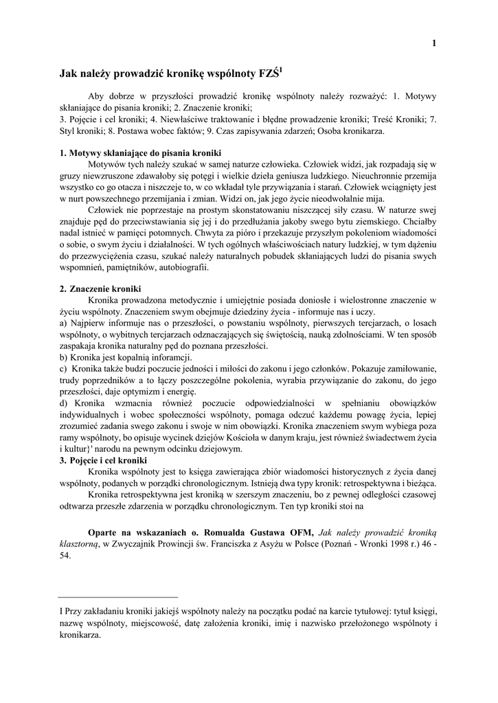 1 Jak należy prowadzić kronikę wspólnoty FZŚI Aby dobrze w przyszłości prowadzić kronikę wspólnoty należy rozważyć: 1. Motywy skłaniające do pisania kroniki; 2. Znaczenie kroniki; 3. Pojęcie i cel kroniki; 4. Niewłaściwe traktowanie i błędne prowadzenie kroniki; Treść Kroniki; 7. Styl kroniki; 8. Postawa wobec faktów; 9. Czas zapisywania zdarzeń; Osoba kronikarza. 1. Motywy skłaniające do pisania kroniki Motywów tych należy szukać w samej naturze człowieka. Człowiek widzi, jak rozpadają się w gruzy niewzruszone zdawałoby się potęgi i wielkie dzieła geniusza ludzkiego. Nieuchronnie przemija wszystko co go otacza i niszczeje to, w co wkładał tyle przywiązania i starań. Człowiek wciągnięty jest w nurt powszechnego przemijania i zmian. Widzi on, jak jego życie nieodwołalnie mija. Człowiek nie poprzestaje na prostym skonstatowaniu niszczącej siły czasu. W naturze swej znajduje pęd do przeciwstawiania się jej i do przedłużania jakoby swego bytu ziemskiego. Chciałby nadal istnieć w pamięci potomnych. Chwyta za pióro i przekazuje przyszłym pokoleniom wiadomości o sobie, o swym życiu i działalności. W tych ogólnych właściwościach natury ludzkiej, w tym dążeniu do przezwyciężenia czasu, szukać należy naturalnych pobudek skłaniających ludzi do pisania swych wspomnień, pamiętników, autobiografii. 2. Znaczenie kroniki Kronika prowadzona metodycznie i umiejętnie posiada doniosłe i wielostronne znaczenie w życiu wspólnoty. Znaczeniem swym obejmuje dziedziny życia - informuje nas i uczy. a) Najpierw informuje nas o przeszłości, o powstaniu wspólnoty, pierwszych tercjarzach, o losach wspólnoty, o wybitnych tercjarzach odznaczających się świętością, nauką zdolnościami. W ten sposób zaspakaja kronika naturalny pęd do poznana przeszłości. b) Kronika jest kopalnią inforamcji. c) Kronika także budzi poczucie jedności i miłości do zakonu i jego członków. Pokazuje zamiłowanie, trudy poprzedników a to łączy poszczególne pokolenia, wyrabia przywiązanie do zakonu, do jego przeszłości, daje optymizm i energię. d) Kronika wzmacnia również poczucie odpowiedzialności w spełnianiu obowiązków indywidualnych i wobec społeczności wspólnoty, pomaga odczuć każdemu powagę życia, lepiej zrozumieć zadania swego zakonu i swoje w nim obowiązki. Kronika znaczeniem swym wybiega poza ramy wspólnoty, bo opisuje wycinek dziejów Kościoła w danym kraju, jest również świadectwem życia i kultur}' narodu na pewnym odcinku dziejowym. 3. Pojęcie i cel kroniki Kronika wspólnoty jest to księga zawierająca zbiór wiadomości historycznych z życia danej wspólnoty, podanych w porządki chronologicznym. Istnieją dwa typy kronik: retrospektywna i bieżąca. Kronika retrospektywna jest kroniką w szerszym znaczeniu, bo z pewnej odległości czasowej odtwarza przeszłe zdarzenia w porządku chronologicznym. Ten typ kroniki stoi na Oparte na wskazaniach o. Romualda Gustawa OFM, Jak należy prowadzić kroniką klasztorną, w Zwyczajnik Prowincji św. Franciszka z Asyżu w Polsce (Poznań - Wronki 1998 r.) 46 54. I Przy zakładaniu kroniki jakiejś wspólnoty należy na początku podać na karcie tytułowej: tytuł księgi, nazwę wspólnoty, miejscowość, datę założenia kroniki, imię i nazwisko przełożonego wspólnoty i kronikarza. 2 pograniczu kroniki właściwej i naukowego opracowania. Brak naocznego śledzenia wypadków wywołuje potrzebę korzystania z różnych źródeł, które podaje się ocenie krytycznej, a odległość opisywanych zdarzeń narzuca zwykle ustalenie współzależności tych źródeł. Kronika w ścisłym znaczeniu jest to księga, w której są spisywane wydarzenia bieżące w kolejnym następstwie czasowym. Nie jest tu konieczny krytycyzm i pragmatyzm historyczny, tj. wydawanie o tych wydarzeniach swego sądu, wskazanie przyczyn i skutków. W praktyce łączy się oba typy kroniki. Zaczynając kronikę bieżącą pisze się zwykle na początku kronikę retrospektywną, przedstawia się zmiany i wypadki, jakie zachodzą w całokształcie życia wspólnotowego w następstwie czasowym. 4. Niewłaściwe traktowanie i biędne prowadzenie kroniki Doniosła znaczenie kroniki nie jest niestety doceniane przez wszystkich w całej rozciągłości, co w konsekwencji powoduje błędne jej traktowanie i prowadzenia lub też jej zaniechanie. a) Jednym z najczystszych przewinień względem kroniki jest jej całkowite lub częściowe niszczenie. Tego rodzaju fakty dowodzące zupełnego niezrozumienia wartości i znaczenia kroniki mają niestety miejsce. b) Innym błędem jest zaniechanie prowadzenia kroniki. c) Nieraz kronikarz przed wizytacją stara się uzupełnić zaległości kroniki z dłuższego okresu. Wówczas kronika nie przyniesie też spodziewanych korzyści przyszłym pokoleniom. Gorączkowe wypełnianie czymkolwiek pustych kart kroniki powoduje luki, które przynoszą wielką szkodę przyszłym pokoleniom interesującym się przeszłością zwłaszcza gdy te opuszczenia nie są później wypełniane choćby krótkim opisem ważniejszych wydarzeń. 5. Wygląd zewnętrzny kroniki a) Format. Kronika powinna być księgą większego formatu, najlepiej in A-4. Wprawdzie kronikarzowi jest niewygodnie wpisywać do księgi o dużym formacie, jednak za jego przyjęciem przemawiają inne względy: księga taka ma poważny wygląd, nie tak łatwo się gubi, a rejestr zdarzeń i podawany wykaz uzyskują w niej większą przejrzystość. b) Materiał. Wszelkie materiały użyte do kroniki powinny być dostatecznie trwałe. Oprawa mocna, skóra lub przynajmniej półskórek, by przez częste używanie nie zniszczyła się. Papier powinien być dobrego gatunku. Należy pisać w kronice tylko atramentem dobrym i trwałym. Nie wklejać do kroniki kart pisanych maszynowo, ani też wycinków z gazet. Wycinki z gazet i fotografie lepiej wkładać w osobny zeszyt, a w kronice odsyłać do niego. Form