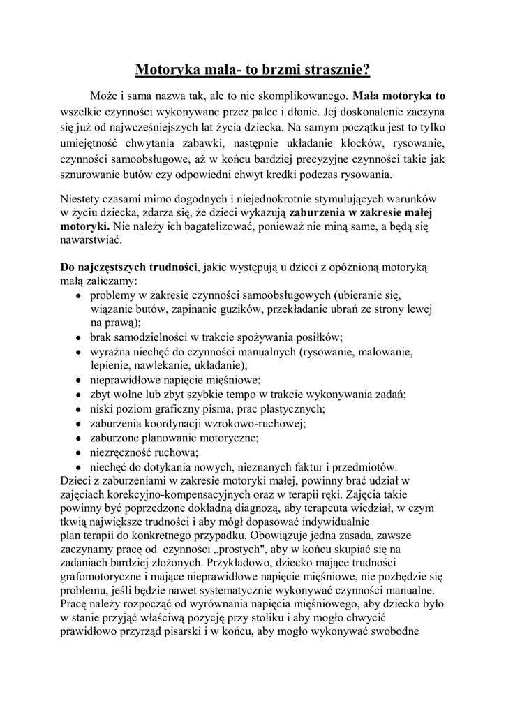 Motoryka mała- to brzmi strasznie? Może i sama nazwa tak, ale to nic skomplikowanego. Mała motoryka to wszelkie czynności wykonywane przez palce i dłonie. Jej doskonalenie zaczyna się już od najwcześniejszych lat życia dziecka. Na samym początku jest to tylko umiejętność chwytania zabawki, następnie układanie klocków, rysowanie, czynności samoobsługowe, aż w końcu bardziej precyzyjne czynności takie jak sznurowanie butów czy odpowiedni chwyt kredki podczas rysowania. Niestety czasami mimo dogodnych i niejednokrotnie stymulujących warunków w życiu dziecka, zdarza się, że dzieci wykazują zaburzenia w zakresie małej motoryki. Nie należy ich bagatelizować, ponieważ nie miną same, a będą się nawarstwiać. Do najczęstszych trudności, jakie występują u dzieci z opóźnioną motoryką małą zaliczamy: problemy w zakresie czynności samoobsługowych (ubieranie się, wiązanie butów, zapinanie guzików, przekładanie ubrań ze strony lewej na prawą); brak samodzielności w trakcie spożywania posiłków; wyraźna niechęć do czynności manualnych (rysowanie, malowanie, lepienie, nawlekanie, układanie); nieprawidłowe napięcie mięśniowe; zbyt wolne lub zbyt szybkie tempo w trakcie wykonywania zadań; niski poziom graficzny pisma, prac plastycznych; zaburzenia koordynacji wzrokowo-ruchowej; zaburzone planowanie motoryczne; niezręczność ruchowa; niechęć do dotykania nowych, nieznanych faktur i przedmiotów. Dzieci z zaburzeniami w zakresie motoryki małej, powinny brać udział w zajęciach korekcyjno-kompensacyjnych oraz w terapii ręki. Zajęcia takie powinny być poprzedzone dokładną diagnozą, aby terapeuta wiedział, w czym tkwią największe trudności i aby mógł dopasować indywidualnie plan terapii do konkretnego przypadku. Obowiązuje jedna zasada, zawsze zaczynamy pracę od czynności „prostych", aby w końcu skupiać się na zadaniach bardziej złożonych. Przykładowo, dziecko mające trudności grafomotoryczne i mające nieprawidłowe napięcie mięśniowe, nie pozbędzie się problemu, jeśli będzie nawet systematycznie wykonywać czynności manualne. Pracę należy rozpocząć od wyrównania napięcia mięśniowego, aby dziecko było w stanie przyjąć właściwą pozycję przy stoliku i aby mogło chwycić prawidłowo przyrząd pisarski i w końcu, aby mogło wykonywać swobodne ruchy ręki. Schemat zajęć z terapii ręki jest stały, ale zawsze ma wyznaczony cel i wszystkie części tych zajęć, pomagają go osiągnąć. Czynności z zakresu motoryki małej pobudzane są przez naśladowanie, percepcję, motorykę dużą, a przede wszystkim koordynację wzrokoworuchową. Podstawowymi umiejętnościami rozwijanymi w trakcie doskonalenia motoryki małej są: kontrolowane ruchy rąk i palców; chwytanie przedmiotów jedną ręką bez pomocy; manipulowanie przedmiotem w celu wykonania zadania; skoordynowane używanie obu rąk. Od rozwoju motoryki małej zależny jest pomyślny rozwój umiejętności samoobsługi, rysowania, pisania i artykulacji. Gdy dziecko będzie lepiej panować nad dłońmi i palcami nauka stanie się mniej frustrująca i da zadowolenie zarówno dziecku jak i nauczycielowi. Proponujemy Państwu kilka ćwiczeń, które pomogą dziecku doskonalić małą motorykę, co jest warunkiem do prawidłowej nauki pisania. swobodne bazgranie na dużych arkuszach papieru, flamastrami, kredkami świecowymi, pastelami nawlekanie koralików, przewlekanie sznurków, tasiemek, sznurowadeł przez różne rzeczy i otwory zamalowywanie obrazków w książkach do malowania kalkowanie obrazków strząsanie wody z palców zgniatanie kartki papieru jedną ręką w małą kulkę układanie z elementów geometrycznych postaci ludzkich, zwierząt, domków itp. układanie z patyczków, np. płotów. ćwiczenia dłoni- wymachy, krążenia, uderzenia, pocierania, otwierania, zamykania ściskanie piłeczek zwijanie palcami chusteczek, apaszek rysowanie patykiem po ziemi obrysowywanie szablonów wciskanie w tablicę korkową pinezek- wyjmowanie ich zbieranie drobnych elementów (pieniążki, ziarenka, guziczki- dwoma palcami kciukiem i wskazującym, zbieranie wyżej wymienionych przedmiotów pęsetą wycinanie najpierw prostych, potem nieco bardziej skomplikowanych kształtów z papieru kolorowego wykonywanie drobnych ruchów palcami: spacerowanie palcami po stole, modelowanie z plasteliny, modeliny, masy papierowej najpierw kuleczek, wałeczków; później form bardziej złożonych - zwierząt, postaci ludzkich, liter stemplowanie i kolorowanie wydzieranie z kolorowego papieru i naklejanie wydzieranki na papier rysowanie w liniach wzorów, np. szlaków Opracowały: E. Bator M. Boruch E. Dobrodziej M. Krzosek D. Szmit