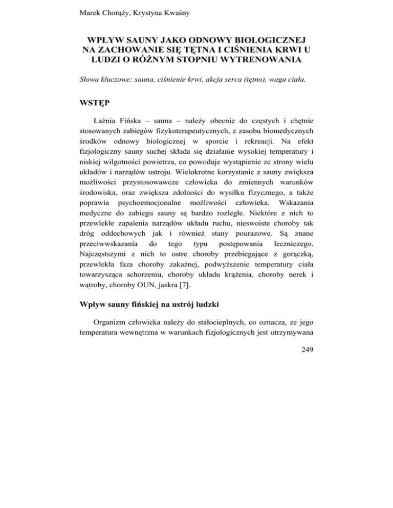 Marek Chorąży, Krystyna Kwaśny WPŁYW SAUNY JAKO ODNOWY BIOLOGICZNEJ NA ZACHOWANIE SIĘ TĘTNA I CIŚNIENIA KRWI U LUDZI O RÓŻNYM STOPNIU WYTRENOWANIA Słowa kluczowe: sauna, ciśnienie krwi, akcja serca (tętno), waga ciała. WSTĘP Łaźnia Fińska – sauna – należy obecnie do częstych i chętnie stosowanych zabiegów fizykoterapeutycznych, z zasobu biomedycznych środków odnowy biologicznej w sporcie i rekreacji. Na efekt fizjologiczny sauny suchej składa się działanie wysokiej temperatury i niskiej wilgotności powietrza, co powoduje wystąpienie ze strony wielu układów i narządów ustroju. Wielokrotne korzystanie z sauny zwiększa możliwości przystosowawcze człowieka do zmiennych warunków środowiska, oraz zwiększa zdolności do wysiłku fizycznego, a także poprawia psychoemocjonalne możliwości człowieka. Wskazania medyczne do zabiegu sauny są bardzo rozległe. Niektóre z nich to przewlekłe zapalenia narządów układu ruchu, nieswoiste choroby tak dróg oddechowych jak i również stany pourazowe. Są znane przeciwwskazania do tego typu postępowania leczniczego. Najczęstszymi z nich to ostre choroby przebiegające z gorączką, przewlekła faza choroby zakaźnej, podwyższenie temperatury ciała towarzysząca schorzeniu, choroby układu krążenia, choroby nerek i wątroby, choroby OUN, jaskra [7]. Wpływ sauny fińskiej na ustrój ludzki Organizm człowieka należy do stałocieplnych, co oznacza, ze jego temperatura wewnętrzna w warunkach fizjologicznych jest utrzymywana 249 na stałym poziomie370C, niezależnie od temperatury otoczenia Regulacja temperatury ciała odbywa się przy czynnym udziale mechanizmów nerwowych i hormonalnych [8]. Ustrój sam stale wytwarza ciepło, ale następuje również ciągła jego utrata. Odbywa się ona głównie przez skórę, płuca oraz przez promieniowanie. Niewielkie ilości ciepła są tracone z moczem i kałem [1]. Między organizmem a otoczeniem ciepło przenoszone jest w obu kierunkach poprzez parowanie, promieniowanie, konwekcję oraz przewodzenie [3]. Aby utrzymać stała temperaturę w której mogą zachodzić niezbędne dla życia przemiany biochemiczne konieczne jest sprawne działanie ośrodków termoregulacyjnych. Składają się na nie termoreceptory zarówno zimna jak i ciepła. Są one rozmieszczone zarówno powierzchownie (skóra) jak i głęboko (OUN) [6,9]. Głównymi efektorami termoregulacji są: układ krążenia i gruczoły potowe. Te ostatnie reagują głównie na bodźce płynące z termoreceptorów centralnych, natomiast termoreceptory skóry nie odgrywają w tym przypadku istotnej roli [3,9]. Jest to tzw. termoregulacja fizyczna. Prócz niej wyróżniamy termoregulację chemiczną w której biorą udział mięśnie szkieletowe, wątroba i tkanka tłuszczowa. Omawiany w pracy zabieg tzw. suchej sauny głównie wywiera wpływ na termoregulację fizyczną organizmu. Gorące powietrze w saunie oddziaływuje na dwie duże powierzchnie ciała ludzkiego – skórę i narząd oddechowy. Powoduje to wzrost temperatury ciała od 380C do 390C. W tych warunkach zostaje zachwiana równowaga pomiędzy wytwarzaniem a oddawaniem ciepła przez ustrój co prowadzi do przegrzania organizmu. Jeżeli nie przeprowadzi się ochładzania temperatura taka może się utrzymywać do półtorej godziny [4]. Odczyn na bodziec cieplny przebiega dwufazowo. W pierwszej fazie występuje reakcja wydalania nadmiaru ciepła przez rozszerzenie łożyska naczyniowego i obfite pocenie. Odczyn ten utrzymuje się przez cały okres pobytu w saunie. Druga faza to ogólne przegrzanie organizmu. 250 Występuje w niej przesunięcie równowagi kwasowo – zasadowej w kierunku kwasicy, wzrost ciśnienia krwi, przyśpieszenie tętna oraz częstości oddechów. Wraz z potem organizm traci sód, potas, magnez i żelazo [2,4]. Eliminowane są tą drogą również ilości amoniaku i mocznika. Należy tutaj dodać, że niepożądane jest dalsze pocenie po ukończeniu zabiegu, czemu zapobiega odpowiednie schładzanie organizmu [5]. Prawidłowa sauna ma działanie pozytywne na układ ruchu. Prowadzi do usuwania z układu mięśniowego związków toksycznych powstałych jako produkt końcowy przemian podczas ich pracy, co prowadzi do skrócenia fazy zmęczenia. Dochodzi do wzrostu rezerwy alkalicznej. Pod wpływem ciepła narasta elastyczność i rozciągliwość struktur łącznotkankowych [2]. Zabieg sauny jest silnym niespecyficznym bodźcem wywierającym wpływ na wiele narządów i układów organizmu. Stosowanie tego zabiegu u sportowców w celu odnowy biologicznej przyczynia się do przyśpieszenia restytucji zarówno fizycznej jak i psychicznej. Mając powyższe na uwadze postanowiono prześledzić zachowanie się tętna, ciśnienia krwi oraz wagi ciała w 3 różniących się od siebie stopniem wytrenowania grupach. Materiał i metodyka Badanie przeprowadzono u 30 osób podzielonych umownie na 3 grupy – wytrenowanych, średnio wytrenowanych i nietrenujących. Pierwszą stanowili siatkarze I ligowego klubu korzystający z sauny 2 x w tygodniu. Drugą stanowiły siatkarki III ligi korzystające z sauny jako odnowy biologicznej raz w tygodniu. Trzecia grupa to studenci wyższej uczelni uprawiający sport amatorsko i korzystający z sauny okazjonalnie. Wiek badanych wahał się w granicach 20 do 24 lat. Nikt z badanych nie chorował na schorzenia tak układu oddechowego jak i krążenia. Badani spożywali posiłek przynajmniej godzinę przed zabiegiem. Po 10 minutowym odpoczynku badano tętno, ciśnienie oraz ważono badanych. 251 Po wejściu do sauny przegrzanie trwało 10 minut, po min następowała 5 minutowa faza ochładzania. Cykle przegrzewania powtarzano trzykrotnie przy każdym wejściu polecano usiąść badanym na wyższej ławce. Temperatura w komorze na poziomie 3 ławki wynosiła 830C, wilgotność wahała się od 12% do 14%. W pomieszczeniu służącym do ochładzania temperatura powietrza wynosiła 180C a temperatura wod