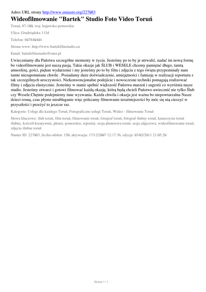 Wideofilmowanie "Bartek" Studio Foto Video Torun