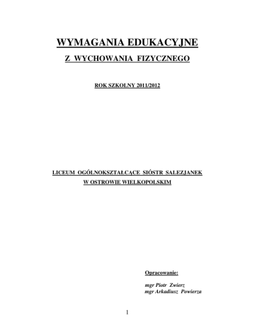 WYMAGANIA EDUKACYJNE Z WYCHOWANIA FIZYCZNEGO ROK SZKOLNY 2011/2012 LICEUM OGÓLNOKSZTAŁCĄCE SIÓSTR SALEZJANEK W OSTROWIE WIELKOPOLSKIM Opracowanie: mgr Piotr Zwierz mgr Arkadiusz Powierza 1 KLASA 1,2 i 3 LICEUM PRZEDMIOTOWE KRYTERIA OCENIANIA Ocena z wychowania fizycznego w klasie 1, 2 i 3 za I okres i końcoworoczna jest wypadkową trzech składowych: I. Aktywność na zajęciach wychowania fizycznego i pozalekcyjna oraz postawa wobec przedmiotu (uczestnictwo w zajęciach, strój). II. Umiejętności i sprawność fizyczna (postęp). III. Wiadomości WYMAGANIA NA POSZCZEGÓLNE OCENY I. : Aktywność i postawa wobec przedmiotu ( jedna ocena na okres wyliczona ze średnie arytmetycznej ocen cząstkowych i plusów za aktywność w danym okresie.) : • Oceny uczniowie otrzymują za : wynik na zawodach sportowych miejsce od 1 do 3 w powiecie - ocena celująca zsumowane punkty za aktywność brak stroju ( po 2 razie) • Plusy zdobywają uczniowie przez cały okres za wszelkie przejawy zaangażowania za: Aktywny udział w zajęciach i współuczestnictwo w ich organizacji, dodatkowe przygotowanie do zajęć, inwencję twórczą, Stosowanie odpowiednich zabiegów higienicznych, Za uczestnictwo na zajęciach SKS-u (1-2 plusy) Udział w rozgrywkach wewnątrz szkolnych, zachowanie fair play (1 plus) Za reprezentowanie szkoły w zawodach sportowych na poziomie gminy (1plus), powiatu (2 plusy), rejonu (3 plusy) • Minusy uczniowie mogą otrzymać za: Jednorazowe nie przygotowanie się do zajęć, Niechętnym, bądź negatywnym stosunku do uczestnictwa w zajęciach (nieuzasadnioną odmowę ćwiczeń, brak zaangażowania w przebieg lekcji) Nieprzestrzeganie zasad BHP, wykorzystywanie sprzętu sportowego niezgodnie z jego przeznaczeniem. Brak dyscypliny, lekceważący stosunek do nauczyciela. 2 OCENA ZA AKTYWNOŚĆ – składowa oceny 1) celujący (6) 2) bardzo dobry (5) 3) dobry (4) - bardzo duża liczba plusów bez żadnego minusa ( min. 6 ) - duża liczba plusów z maksymalnie jednym minusem (min. 5 ) - przewaga plusów nad minusami, równowaga plusów z minusami – czyste konto (min. 4) 4) dostateczny (3) - minusy przeważają nad plusami (min. 3 plusy) 5) dopuszczający (2) - kilka minusów bez plusów ( od 3 – 5 ) 6) niedostateczny (1) - duża liczba minusów bez żadnego plusa ( od 6 i więcej ) II. Umiejętności i sprawność fizyczna ( jedna wspólna ocena na okres wyliczona ze średniej arytmetycznej ocen cząstkowych w danym okresie). Kryteria sprawności i umiejętności stanowią testy poszczególnych działów nauczania. TESTY SPRAWNOŚCI I UMIEJĘTNOŚCI KLASA I LEKKOATLETYKA 1. OKRES I Bieg na dystansie 800 m.(dziewczęta) i 1000 m. (chłopcy). OKRES II 1. Test Coopera. Ocena – patrz tabela lekkoatletyczna dla klasy I LEKKOATLETYKA ( Tabela dla klasy I ) DYSCYPLINA 60 m 800 m DZ; 1000 m CH Skok w dal Test Coopera OCENA Celujący (6) Bardzo dobry (5) Dobry (4) Dostateczny (3) Dopuszczający (2) Celujący (6) Bardzo dobry (5) Dobry (4) Dostateczny (3) Dopuszczający (2) Celujący (6) Bardzo dobry (5) Dobry (4) Dostateczny (3) Dopuszczający (2) Celujący (6) Bardzo dobry (5) Dobry (4) Dostateczny (3) Dopuszczający (2) CZAS / ODLEGŁOŚC DZIEWCZĘTA CHŁOPCY Do 9,00 Do 8,00 Do 9,60 Do 8,50 Do 10,40 Do 9,50 Do 11,50 Do 10,10 11,50 i powyżej 10,10 i powyżej Do 3,15 Do 3,10 Do 3,35 Do 3,30 Do 3,55 Do 3,40 Do 4,20 Do 4,10 4,20 i powyżej 4,10 i powyżej Od 4,10 Od 5,00 Od 3,70 Od 4,60 Od 3,20 Od 4,20 Od 2,70 Od 3,50 2,70 i poniżej 3,50 i poniżej 2400 m 3000 m 2000 m 2600 m 1800 m 2400 m 1600 m 2200 m 1600 m i poniżej 2200 i poniżej 3 PIŁKA KOSZYKOWA 1. 2. 3. Dwutakt z prawej strony. Dwutakt z lewej strony. Rzuty osobiste. Ad.1. Kozłowanie piłki prawą ręką – dwutakt ze strony prawej zakończony rzutem do kosza (trzykrotne powtórzenie). Ad.2. Kozłowanie piłki lewą ręką – dwutakt ze strony lewej zakończony rzutem do kosza (trzykrotne powtórzenie). Oceniamy technikę wykonania i celność rzutu : Przy: 3 rzutach celnych – celujący 2 rzutach celnych – bardzo dobry 1 rzucie celnym – dobry Ad.3. Rzuty osobiste – 10 rzutów. Odległość linii rzutów bliższa niż przy rzutach wolnych ( 5 m.) Rozpoczęcie zaliczenia określa celny rzut. Ocena Celujący (6) Bardzo dobry (5) Dobry (4) Dostateczny (3) Dopuszczający (2) Dziewczęta 7 celnych rzutów 6 celnych rzutów 5 – 4 celnych rzutów 3 celne rzuty 2 celne rzuty chłopcy 8 celnych rzutów 7 celnych rzutów 6 – 5 celnych rzutów 4 celne rzuty 3 celne rzuty PIŁKA SIATKOWA 1. 2. Odbicia piłki oburącz górne (min. 5x) w ograniczonym polu (koło). Odbicia piłki oburącz dolne (min. 5x) w ograniczonym polu (koło). Ocena Dziewczęta Celujący (6) 18 prawidłowych odbić Bardzo dobry (5) 13-17 prawidłowych odbić Dobry (4) 8-12 prawidłowych odbić Dostateczny (3) 6-7 prawidłowych odbić Dopuszczający (2) 1-5 prawidłowych odbić *Dla odbić górnych i dolnych obowiązują te same kryteria . Oceniamy technikę odbić. Na ocenę dobrą i niżej uczeń może wyjść z ograniczonego pola. Odbicie musi być wykonane min. 1m. nad głową. 3. Zagrywka dolna - dziewczęta 7 zagrywek, - chłopcy 10 zagrywek w określone pole gry. Ocena Celujący (6) Bardzo dobry (5) Dobry (4) Dostateczny (3) Dopuszczający (2) Dziewczęta 6 właściwych zagrywek 5 właściwych zagrywek 4 właściwe zagrywki 3 właściwe zagrywki 2 właściwe zagrywki PIŁKA NOŻNA 1. Chłopcy 20 prawidłowych odbić 15-19 prawidłowych odbić 10-14 prawidłowych odbić 6-9 prawidłowych odbić 1-5 prawidłowych odbić Slalom piłkarski . ( 10m -5 słupków ) Sposób wykonania. Piłkę należy prowadzić prawą i lewą nogą ( noga dalsza od przeciwnika/słupka ) po slalomie w obie strony . Czas zostaje wyłączony w momencie kiedy zawodnik wraz z piłką przekroczy linię mety .Każdy ma trzy próby na wykonanie testu . 4 Chłopcy 9 właściwych zagrywek 8 -7 właściwych zagrywek 6 właściwych zagrywek 5 właściwych zagrywek 4 właściwe 