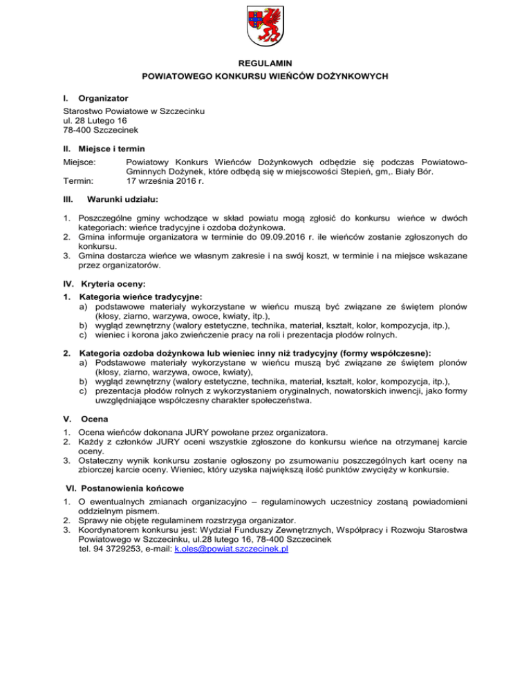 REGULAMIN POWIATOWEGO KONKURSU WIEŃCÓW DOŻYNKOWYCH I. Organizator Starostwo Powiatowe w Szczecinku ul. 28 Lutego 16 78-400 Szczecinek II. Miejsce i termin Miejsce: Termin: III. Powiatowy Konkurs Wieńców Dożynkowych odbędzie się podczas PowiatowoGminnych Dożynek, które odbędą się w miejscowości Stepień, gm,. Biały Bór. 17 września 2016 r. Warunki udziału: 1. Poszczególne gminy wchodzące w skład powiatu mogą zgłosić do konkursu wieńce w dwóch kategoriach: wieńce tradycyjne i ozdoba dożynkowa. 2. Gmina informuje organizatora w terminie do 09.09.2016 r. ile wieńców zostanie zgłoszonych do konkursu. 3. Gmina dostarcza wieńce we własnym zakresie i na swój koszt, w terminie i na miejsce wskazane przez organizatorów. IV. Kryteria oceny: 1. Kategoria wieńce tradycyjne: a) podstawowe materiały wykorzystane w wieńcu muszą być związane ze świętem plonów (kłosy, ziarno, warzywa, owoce, kwiaty, itp.), b) wygląd zewnętrzny (walory estetyczne, technika, materiał, kształt, kolor, kompozycja, itp.), c) wieniec i korona jako zwieńczenie pracy na roli i prezentacja płodów rolnych. 2. Kategoria ozdoba dożynkowa lub wieniec inny niż tradycyjny (formy współczesne): a) Podstawowe materiały wykorzystane w wieńcu muszą być związane ze świętem plonów (kłosy, ziarno, warzywa, owoce, kwiaty), b) wygląd zewnętrzny (walory estetyczne, technika, materiał, kształt, kolor, kompozycja, itp.), c) prezentacja płodów rolnych z wykorzystaniem oryginalnych, nowatorskich inwencji, jako formy uwzględniające współczesny charakter społeczeństwa. V. Ocena 1. Ocena wieńców dokonana JURY powołane przez organizatora. 2. Każdy z członków JURY oceni wszystkie zgłoszone do konkursu wieńce na otrzymanej karcie oceny. 3. Ostateczny wynik konkursu zostanie ogłoszony po zsumowaniu poszczególnych kart oceny na zbiorczej karcie oceny. Wieniec, który uzyska największą ilość punktów zwycięży w konkursie. VI. Postanowienia końcowe 1. O ewentualnych zmianach organizacyjno – regulaminowych uczestnicy zostaną powiadomieni oddzielnym pismem. 2. Sprawy nie objęte regulaminem rozstrzyga organizator. 3. Koordynatorem konkursu jest: Wydział Funduszy Zewnętrznych, Współpracy i Rozwoju Starostwa Powiatowego w Szczecinku, ul.28 lutego 16, 78-400 Szczecinek tel. 94 3729253, e-mail: [email protected]