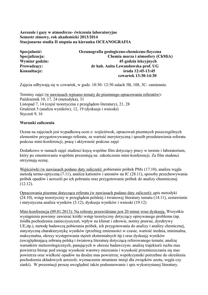 Aerozole i gazy w atmosferze- ćwiczenia laboratoryjne Semestr zimowy, rok akademicki 2013/2014 Stacjonarne studia II stopnia na kierunku OCEANOGRAFIA Specjalność: Specjalizacja: Wymiar godzin: Prowadzący: Konsultacje: Oceanografia geologiczno-chemiczno-fizyczna Chemia morza i atmosfery (ChMiA) 45 godzin lekcyjnych dr hab. Anita Lewandowska prof. UG środa 12:45-13:45 czwartek 13:30-14:30 Zajęcia odbywają się w czwartek, w godz. 10:30- 12:50 salach 3B, 108, 3C- zamiennie. Terminy zajęć (w nawiasach wpisano tematy do pisemnego opracowania referatów): Październik 10, 17, 24 (metodyka), 31 Listopad 7, 14 (część teoretyczna z przeglądem literatury), 21, 28 Grudzień 5 (analiza wyników), 12, 19 (dyskusja i wnioski) Styczeń 9, 16 Warunki zaliczenia Ocena na zajęciach jest wypadkową ocen z: wejściówek, opracowań pisemnych poszczególnych elementów przygotowywanego referatu, za wartość merytoryczną i sposób przedstawienia referatu podczas mini-konferencji, pracę i aktywność podczas zajęć Dodatkowo w ramach zajęć studenci kręcą wspólne film dotyczący pracy w terenie i laboratorium, który po zmontowaniu wspólnie prezentują na zakończenie mini-konferencji. Za film studenci otrzymują ocenę. Wejściówki (w nawiasach podano daty zaliczeń): pobieranie próbek PMx (17.10), analiza węgla metodą termo-optyczną (7.11), analiza kationów i anionów na IC (28.11), sposoby przechowywania próbek opadów i aerozoli po ich pobraniu oraz przygotowanie próbek do analizy chenmicznej (12.12). Opracowania pisemne dotycząca referatu (w nawiasach podano daty zaliczeń): opis metodyki (24.10), wstęp teoretyczny w przeglądem polskiej i światowej literatury tematu (14.11), zestawienie i statystyczna analiza wyników (5.12), dyskusja wyników i wnioski (19.12) Mini-konferencja (09.01.2013): Na referaty przewidziane jest 20 minut wraz dyskusją. Wszystkie wystąpienia powinny zawierać krótki wstęp teoretyczny dotyczący opisywanego problemu (np. źródła pochodzenia zanieczyszczeń, wpływ na klimat i zdrowie, normy prawne, dyrektywy UE,itp.), metodę badawczą pobierania próbek, ich przygotowania do analizy i analizy chemicznej, statystyczną charakterystykę wyników (przebieg zmienności w czasie, wartość średnia, minimalna, maksymalna, okresy występowania stężeń ekstremalnych itp.) oraz dyskusję wyników (uwzględniającą zebraną polską i światową literaturę dotyczącą referowanego tematu; analizę warunków meteorologicznych, panujących w okresie badawczym; analizę trajektorii ruchu mas powietrza biorąc pod uwagę wysokość warstwy mieszania i wysokość przemieszczania się mas powietrza oraz wielkość opadów na drodze mas powietrza; współczynniki potrzebne do określenia pochodzenia składowych aerozoli; wyznaczenie strumieni imisji dla związków azotu, węgla czy siarki). W prezentacji proszę uwzględnić także podsumowanie i spis wykorzystanej literatury. Harmonogram i tematy realizowane podczas zajęć: Nr zajęć 1 Terminy zajęć 10.10.2013 2 17.10 24.10-14.11 3-6 24.10, 31.10, 7.11, 14.11 7-9 21.11, 28.11, 5.12 10-11 12.12, 19.12 12-13 9.01, 16.01.2013 Zakres zajęć Zajęcia wstępne, ustalenie czasu zajęć, pobierania próbek, zasady oceniania, wybór tematów prezentacji i artykułów, omówienie prezentacji na mini-konferencję oraz filmu z zajęć, Przygotowanie zestawu PMTOT, PM10 oraz PM1/PM2,5, przygotowanie zestawu do pobierania i przechowywania próbek wody oraz opadów; sprawdzenie pH metru, elektrody, salinometru; analiza chlorofilu-a z sezonu letniego; analiza węgla w PMTOT z sezonu letniego; stworzenie bazy danych i statystyczne opracowanie danych z sezonu letniego (PM1-PMTPT, zawiesina); zaplanowanie pracy podczas eksperymentu jesiennego. Analiza węgla z eksperymentu letniego (PM10); ważenie sączków na zawiesinę (GF/F), ważenie sączków na PM10 oraz PMTOT (kwarcowe); przygotowanie butelek do pobierania wody morskiej i opadów; przygotowanie krzywej wzorcowej do analizy kationów; przygotowanie próbek z eksperymentu letniego do analizy kationów (wycinanie fragmentów sączka); uzupełnienie bazy danych i statystyczne opracowanie danych z sezonu letniego (PM1-PMTPT, zawiesina, chlorofil); wyznaczenie trajektorii z eksperymentu letniego i opracowanie danych meteorologicznych (1szy tydzień eksperymentu); dopracowanie eksperymentu jesiennego (*) Pobieranie próbek wody morskiej na chlorofil-a, DOC, TOC, OC, EC, zawiesinę (mikrowarstwa i woda podpowierzchniowa), opadów i aerozoli (PM1, PM2,5, PM10, PMTOT), pomiar T, S wody morskiej, pomiary meteorologiczne Analiza węgla z eksperymentu letniego (PM10, PM2,5); przygotowanie próbek z eksperymentu letniego do analizy kationów c.d. (zalewanie próbek milli-Q, ekstrakcja w łaźni ultradźwiękowej, sączenie próbek, analiza chromatograficzna); wyznaczenie trajektorii z eksperymentu letniego i opracowanie danych meteorologicznych (2-gi tydzień eksperymentu); opracowanie danych CO 2 z eksperymentu letniego, przegląd literatury przedmiotu dotyczącej prezentacji wygłaszanych podczas mini-konferencji (*) Analiza węgla z eksperymentu letniego (PM2,5.; PM1); przygotowanie krzywej wzorcowej do analizy anionów; przygotowanie próbek eksperymentu letniego na aniony (wycinanie fragmentów sączka, zalewanie próbek milli-Q, ekstrakcja w łaźni ultradźwiękowej, sączenie próbek, analiza chromatograficzna); wyznaczenie trajektorii z eksperymentu letniego i opracowanie danych meteorologicznych (3-gi tydzień eksperymentu); Statystyczne opracowanie wyników uzyskanych podczas eksperymentu letniego i wykorzystywanych do prezentacji na mini-konferencji (*). Analiza węgla z eksperymentu letniego (PM1) (*); dyskusja wyników uzyskanych podczas sezonu letniego i wykorzystywanych do prezentacji na mini-konferencji; omówienie problemów związanych z prezentacjami studentów; stworzenie bazy danych i statystyczne opracowanie wyników uzyskanych podczas eksperymentu 
