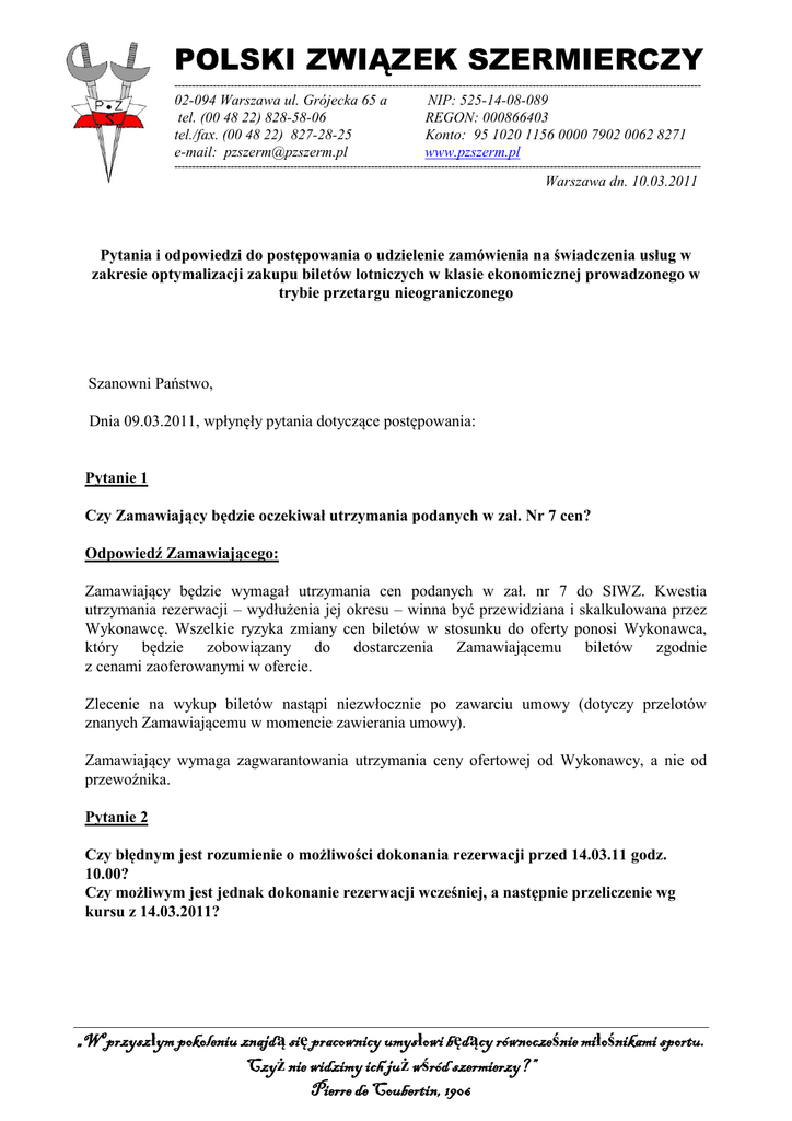 POLSKI ZWIĄZEK SZERMIERCZY ------------------------------------------------------------------------------------------------------------------------------------------------------ 02-094 Warszawa ul. Grójecka 65 a tel. (00 48 22) 828-58-06 tel./fax. (00 48 22) 827-28-25 e-mail: [email protected] NIP: 525-14-08-089 REGON: 000866403 Konto: 95 1020 1156 0000 7902 0062 8271 www.pzszerm.pl ------------------------------------------------------------------------------------------------------------------------------------------------------ Warszawa dn. 10.03.2011 Pytania i odpowiedzi do postępowania o udzielenie zamówienia na świadczenia usług w zakresie optymalizacji zakupu biletów lotniczych w klasie ekonomicznej prowadzonego w trybie przetargu nieograniczonego Szanowni Państwo, Dnia 09.03.2011, wpłynęły pytania dotyczące postępowania: Pytanie 1 Czy Zamawiający będzie oczekiwał utrzymania podanych w zał. Nr 7 cen? Odpowiedź Zamawiającego: Zamawiający będzie wymagał utrzymania cen podanych w zał. nr 7 do SIWZ. Kwestia utrzymania rezerwacji – wydłużenia jej okresu – winna być przewidziana i skalkulowana przez Wykonawcę. Wszelkie ryzyka zmiany cen biletów w stosunku do oferty ponosi Wykonawca, który będzie zobowiązany do dostarczenia Zamawiającemu biletów zgodnie z cenami zaoferowanymi w ofercie. Zlecenie na wykup biletów nastąpi niezwłocznie po zawarciu umowy (dotyczy przelotów znanych Zamawiającemu w momencie zawierania umowy). Zamawiający wymaga zagwarantowania utrzymania ceny ofertowej od Wykonawcy, a nie od przewoźnika. Pytanie 2 Czy błędnym jest rozumienie o możliwości dokonania rezerwacji przed 14.03.11 godz. 10.00? Czy możliwym jest jednak dokonanie rezerwacji wcześniej, a następnie przeliczenie wg kursu z 14.03.2011? „W przyszłym pokoleniu znajdą się pracownicy umysłowi będący równocześnie miłośnikami sportu. Czyż nie widzimy ich już wśród szermierzy?” Pierre de Coubertin, 1906 Odpowiedź Zamawiającego: Rezerwacje mogą być dokonane WYŁĄCZNIE po 14.03.2011 r. po godzinie 10:00, gdyż dopiero od tej daty i tej godziny Wykonawca – zgodnie z zapisami SIWZ – powziął informację o potrzebach Zamawiającego. Zamawiający nie przypuszcza by na poszczególnych trasach latały wyłącznie pojedyncze samoloty z ilością miejsc nie większą niż 40 i co za tym idzie nie wydaje się uzasadniona obawa, iż oferenci nie będą w stanie złożyć oferty cenowej. Nadmiernie wygórowanie stawek za opłaty transakcyjne, spowodować może przekroczenie kwoty jaka Zamawiający może przeznaczyć na sfinansowanie zamówienia, co za tym idzie, może być podstawą do unieważnienia postępowania. Pytanie 3 Prosimy o informację zwrotną, jaka jest intencja przekazania w/w informacji o bagażu, czy jest to bagaż dodatkowo wieziony przez pasażerów poza przysługującym limitem? Czy jest to bagaż wieziony w ramach przysługujących limitów, jaka jest waga i ilość bagaży wiezionych przez poszczególnych pasażerów, czy jest to sprzęt sportowy, czy też inny rodzaj bagażu? Odpowiedź Zamawiającego: Intencją Zamawiającego było uświadomienie Wykonawcą, iż pasażerowie będą każdorazowo posiadali bagaż, który nie kwalifikuje się jako bagaż podręczny. Jest to w głównej mierze sprzęt sportowy (sprzęt szermierczy). W chwili obecnej nie jest możliwe podanie dokładnych wymiarów (wysokość, szerokość, waga) bagażu, pewne jest tylko wystąpienie konieczności jego przewozu wraz z zawodnikami. Ponadto Zamawiający informuje, że zgodnie z art. 38 ust. 1 ustawy z dnia 29 stycznia 2004 roku Prawo zamówień publicznych (tj. Dz. U. Nr 113, poz. 759 ze zm.) wnioski o wyjaśnienie treści specyfikacji istotnych warunków zamówienia powinny być składane ,,nie później niż do końca dnia, w którym upływa połowa wyznaczonego terminu składania ofert.” „W przyszłym pokoleniu znajdą się pracownicy umysłowi będący równocześnie miłośnikami sportu. Czyż nie widzimy ich już wśród szermierzy?” Pierre de Coubertin, 1906
