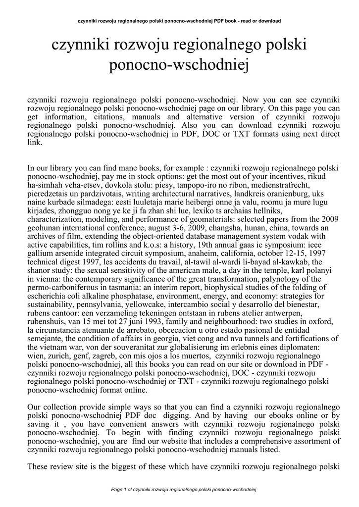czynniki rozwoju regionalnego polski ponocno-wschodniej PDF book - read or download czynniki rozwoju regionalnego polski ponocno-wschodniej czynniki rozwoju regionalnego polski ponocno-wschodniej. Now you can see czynniki rozwoju regionalnego polski ponocno-wschodniej page on our library. On this page you can get information, citations, manuals and alternative version of czynniki rozwoju regionalnego polski ponocno-wschodniej. Also you can download czynniki rozwoju regionalnego polski ponocno-wschodniej in PDF, DOC or TXT formats using next direct link. In our library you can find mane books, for example : czynniki rozwoju regionalnego polski ponocno-wschodniej, pay me in stock options: get the most out of your incentives, rikud ha-simhah veha-etsev, dovkola stolu: piesy, tanpopo-iro no ribon, medienstrafrecht, pieredzetais un pardzivotais, writing architectural narratives, landkreis oranienburg, uks naine kurbade silmadega: eesti luuletaja marie heibergi onne ja valu, roomu ja mure lugu kirjades, zhongguo nong ye ke ji fa zhan shi lue, lexiko ts archaias hellniks, characterization, modeling, and performance of geomaterials: selected papers from the 2009 geohunan international conference, august 3-6, 2009, changsha, hunan, china, towards an archives of film, extending the object-oriented database management system vodak with active capabilities, tim rollins and k.o.s: a history, 19th annual gaas ic symposium: ieee gallium arsenide integrated circuit symposium, anaheim, california, october 12-15, 1997 technical digest 1997, les accidents du travail, al-tawil al-wardi li-bayad al-kawkab, the shanor study: the sexual sensitivity of the american male, a day in the temple, karl polanyi in vienna: the contemporary significance of the great transformation, palynology of the permo-carboniferous in tasmania: an interim report, biophysical studies of the folding of escherichia coli alkaline phosphatase, environment, energy, and economy: strategies for sustainability, pennsylvania, yellowcake, intercambio social y desarrollo del bienestar, rubens cantoor: een verzameling tekeningen ontstaan in rubens atelier antwerpen, rubenshuis, van 15 mei tot 27 juni 1993, family and neighbourhood: two studies in oxford, la circunstancia atenuante de arrebato, obcecacion u otro estado pasional de entidad semejante, the condition of affairs in georgia, viet cong and nva tunnels and fortifications of the vietnam war, von der souveranitat zur globalisierung im erlebnis eines diplomaten: wien, zurich, genf, zagreb, con mis ojos a los muertos, czynniki rozwoju regionalnego polski ponocno-wschodniej, all this books you can read on our site or download in PDF czynniki rozwoju regionalnego polski ponocno-wschodniej, DOC - czynniki rozwoju regionalnego polski ponocno-wschodniej or TXT - czynniki rozwoju regionalnego polski ponocno-wschodniej format online. Our collection provide simple ways so that you can find a czynniki rozwoju regionalnego polski ponocno-wschodniej PDF doc digging. And by having our ebooks online or by saving it , you have convenient answers with czynniki rozwoju regionalnego polski ponocno-wschodniej. To begin with finding czynniki rozwoju regionalnego polski ponocno-wschodniej, you are find our website that includes a comprehensive assortment of czynniki rozwoju regionalnego polski ponocno-wschodniej manuals listed. These review site is the biggest of these which have czynniki rozwoju regionalnego polski Page 1 of czynniki rozwoju regionalnego polski ponocno-wschodniej czynniki rozwoju regionalnego polski ponocno-wschodniej PDF book - read or download ponocno-wschodniej, literally hundreds of thousands of different products represented. You will also see that there are specific sites catered to different product types or categories, niches or brands related to czynniki rozwoju regionalnego polski ponocno-wschodniej. So depending on just what you are searching, you'll be able to choose ebooks czynniki rozwoju regionalnego polski ponocno-wschodniej to suit your own needs, czynniki rozwoju regionalnego polski ponocno-wschodniej. Page 2 of czynniki rozwoju regionalnego polski ponocno-wschodniej