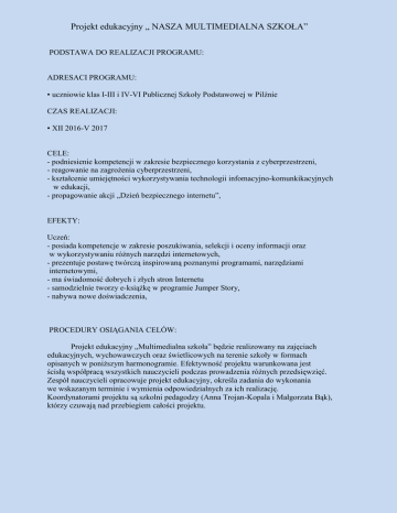 Projekt edukacyjny „ NASZA MULTIMEDIALNA SZKOŁA” PODSTAWA DO REALIZACJI PROGRAMU: ADRESACI PROGRAMU: ▪ uczniowie klas I-III i IV-VI Publicznej Szkoły Podstawowej w Pilźnie CZAS REALIZACJI: ▪ XII 2016-V 2017 CELE: - podniesienie kompetencji w zakresie bezpiecznego korzystania z cyberprzestrzeni, - reagowanie na zagrożenia cyberprzestrzeni, - kształcenie umiejętności wykorzystywania technologii infomacyjno-komunkikacyjnych w edukacji, - propagowanie akcji „Dzień bezpiecznego internetu”, EFEKTY: Uczeń: - posiada kompetencje w zakresie poszukiwania, selekcji i oceny informacji oraz w wykorzystywaniu różnych narzędzi internetowych, - prezentuje postawę twórczą inspirowaną poznanymi programami, narzędziami internetowymi, - ma świadomość dobrych i złych stron Internetu - samodzielnie tworzy e-książkę w programie Jumper Story, - nabywa nowe doświadczenia, PROCEDURY OSIĄGANIA CELÓW: Projekt edukacyjny „Multimedialna szkoła” będzie realizowany na zajęciach edukacyjnych, wychowawczych oraz świetlicowych na terenie szkoły w formach opisanych w poniższym harmonogramie. Efektywność projektu warunkowana jest ścisłą współpracą wszystkich nauczycieli podczas prowadzenia różnych przedsięwzięć. Zespół nauczycieli opracowuje projekt edukacyjny, określa zadania do wykonania we wskazanym terminie i wymienia odpowiedzialnych za ich realizację. Koordynatorami projektu są szkolni pedagodzy (Anna Trojan-Kopala i Małgorzata Bąk), którzy czuwają nad przebiegiem całości projektu. Założone w projekcie cele będą realizowane poprzez następujące zadania: L.p 1. ZADANIA Wprowadzenie do teamtyki godzin wychowawczych i realizowanych w świetlicy szkolnej treści związanych z bezpieczeństwem w internecie. Wprowadzenie do edukacji wczesnoszkolnej powyższych zagadnień. TERMIN ADRESACI zgodnie z uczniowie planem pracy oddz. wychowawczej przedszkolnego uczniowie klas: I-III i IV-VI 2. Przeprowadzenie zajęć warsztatowoprofilaktycznych „STOP CYBERPRZEMOCY” Przeprowadzenie wśród uczniów quizu rywalizacji za pomocą narzędzia Kahoot!(https://getkahoot.com/) Wykorzystywanie tablic interaktywnych, multibooków do pracy na lekcjach zajęciach edukacyjnych i dodatkowych Wykorzystywanie technologii komputerowej w przygotowaniu testów. sprawdzianów, kartkówek Program Insta.Ling- nauka słówek w języku obcym (j.ang.) z wykorzystaniem internetu. Zorganizowanie ogólnoszkolnego konkursu na przygotowanie opowiadania pt”Szkoła moich marzeń” Przeprowadzenie spotkań z przedstawicielem Policji nt.”Zagrożenia występujące w cyberprzestrzeni”przeciwdziałanie zagrożeniom, promowanie świadomego i bezpiecznego korzystania z Internetu. Obchody Światowego Dnia Bezpiecznego Internetu. Przygotowanie gazetki tematycznej „Bezpieczeństwo w Internecie” Przygotowanie klasowych gazetek dotyczących „Bezpieczeństwa w sieci”. Przeprowadzenie we wszystkich klasach prelekcji pokazowej w power poincie na temat: „Internet bawi, internet uczy”zaproponowanie ciekawych stron internetowych, edukacyjnych, rozrywkowych w uzgodnionych terminach cały czas trwania projektu 3. 4. 5. 6. 7. 8. 9. 10. 11. 12. uczniowie kl: IV,V,VI klasy: IV-VI ODPOWIEDZIALNI Wychowawcy oddz.”0” I-III i IV-VI wychowawcy świetlicy Monika Łapanowskapsycholog pedagodzy M. Matusik B. Kawa pedagodzy cały rok Oddz. „0” kl. I-III kl. IV-VI cały rok kl. I-III kl .IV-VI wszyscy nauczyciele cały rok kl.V B.Wojciechowska P. Pietruszka XII kl.V-VI M. Matusik wszyscy nauczyciele pedagodzy I II II II III kl. I-III kl. IV-VI kl. I-III kl. IV-VI przedstawiciele klas IV-tych oddz. „0” kl. I-III kl. IV-VI kl. I-III kl. IV-VI Samorząd Uczniowski pedagodzy wychowawcy klas J. Kawa S. Peterman pedagodzy 13. 14. 15. 16. 17. „Szkoła moich marzeń wyposażona w multimedialne i nowe technologie. Wykonanie e-książeczki za pomocą aplikacji StoryJumper umożliwiającej tworzenie i udostępnianie książeczki. Konkurs plastyczny „Jasne i ciemne strony internetu” oddz.”0” kl.I-III i IV- VI Zorganizowania w szkole dnia pod nazwą ”Internet źródło wiedzy i rozrywki”. Szkolne zawody w grach edukacyjnych, logicznego myślenia itp. Publikowanie informacji o ważnych wydarzeniach z życia biblioteki szkolnej na profilu i blogu Biblioteki Szkolne Online. Podsumowanie projektu - sprawozdanie IV IV V kl.V wychowawcy klas V oddz.”0” kl.I-III i IV- VI pedagodzy E.Kozioł C. Tragarz J.Kawa M.Wojtuła kl. II-III kl. IV-VI S. Petrmann J. Kawa cały rok A. Poznańska VI pedagodzy M.Matusik
