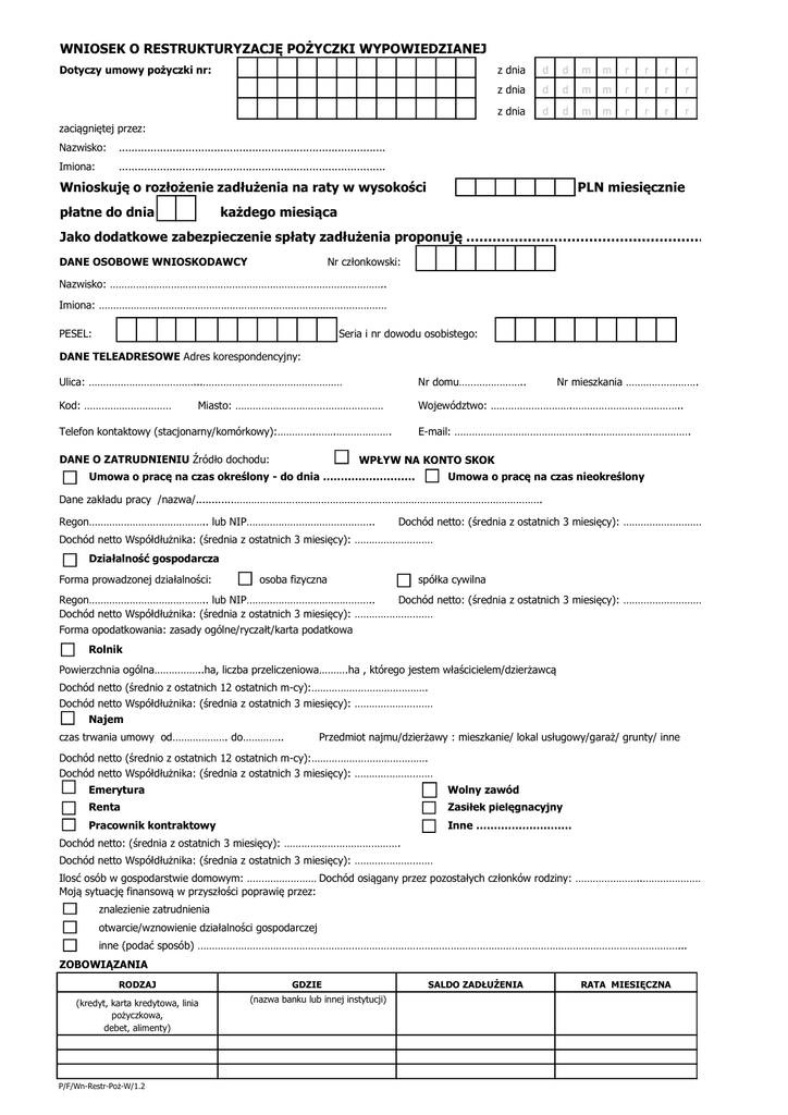WNIOSEK O RESTRUKTURYZACJĘ POŻYCZKI WYPOWIEDZIANEJ Dotyczy umowy pożyczki nr: Imiona: d d m m r r r r z dnia d d m m r r r r z dnia zaciągniętej przez: Nazwisko: z dnia d d m m r r r r .................................................................................... .................................................................................... Wnioskuję o rozłożenie zadłużenia na raty w wysokości płatne do dnia PLN miesięcznie każdego miesiąca Jako dodatkowe zabezpieczenie spłaty zadłużenia proponuję ……………………………………………… DANE OSOBOWE WNIOSKODAWCY Nr członkowski: Nazwisko: ………………………………………………………………………………….. Imiona: ……………………………………………………………………………………… PESEL: Seria i nr dowodu osobistego: DANE TELEADRESOWE Adres korespondencyjny: Ulica: ………………………………...………………………………………… Nr domu………………….. Telefon kontaktowy (stacjonarny/komórkowy):………….…….………………. E-mail: ………………………………………..……………………………. Kod: ………………………… Miasto: …………………………………………… DANE O ZATRUDNIENIU Źródło dochodu: Nr mieszkania ……………………. Województwo: ……………………….……………………………….. WPŁYW NA KONTO SKOK Umowa o pracę na czas określony - do dnia ………………………… Umowa o pracę na czas nieokreślony Dane zakładu pracy /nazwa/............……………………………………………………………………………………………. Regon………………………………….. lub NIP…………………………………….. Dochód netto: (średnia z ostatnich 3 miesięcy): ……………………… Dochód netto Współdłużnika: (średnia z ostatnich 3 miesięcy): ……………………… Działalność gospodarcza Forma prowadzonej działalności: osoba fizyczna spółka cywilna Regon………………………………….. lub NIP…………………………………….. Dochód netto: (średnia z ostatnich 3 miesięcy): ……………………… Dochód netto Współdłużnika: (średnia z ostatnich 3 miesięcy): ……………………… Forma opodatkowania: zasady ogólne/ryczałt/karta podatkowa Rolnik Powierzchnia ogólna……………..ha, liczba przeliczeniowa……….ha , którego jestem właścicielem/dzierżawcą Dochód netto (średnio z ostatnich 12 ostatnich m-cy):…………………………………. Dochód netto Współdłużnika: (średnia z ostatnich 3 miesięcy): ……………………… Najem czas trwania umowy od………………. do………….. Przedmiot najmu/dzierżawy : mieszkanie/ lokal usługowy/garaż/ grunty/ inne Dochód netto (średnio z ostatnich 12 ostatnich m-cy):…………………………………. Dochód netto Współdłużnika: (średnia z ostatnich 3 miesięcy): ……………………… Emerytura Wolny zawód Pracownik kontraktowy Inne ……………………… Renta Zasiłek pielęgnacyjny Dochód netto: (średnia z ostatnich 3 miesięcy): …………………………………. Dochód netto Współdłużnika: (średnia z ostatnich 3 miesięcy): ……………………… Ilosć osób w gospodarstwie domowym: …………………… Dochód osiągany przez pozostałych członków rodziny: …………………..…………………. Moją sytuację finansową w przyszłości poprawię przez: znalezienie zatrudnienia otwarcie/wznowienie działalności gospodarczej inne (podać sposób) …………………………………………………………………………………………………………………………………………………... ZOBOWIĄZANIA RODZAJ (kredyt, karta kredytowa, linia pożyczkowa, debet, alimenty) P/F/Wn-Restr-Poż-W/1.2 GDZIE (nazwa banku lub innej instytucji) SALDO ZADŁUŻENIA RATA MIESIĘCZNA MAJĄTEK RODZAJ (nieruchomość, samochód,lokata, papiery wartościowe, udziały, polisa na zycie, inne) OPIS WARTOŚĆ RYNKOWA OBCIĄŻENIA (rodzaj nieruchomości, adres, marka i rocznik samochodu itp..) (kwota, tytuł - zastaw, hipoteka, przewłaszczenie itp.) Okres zatrudnienia w ostatnim miejscu pracy: do 6 miesięcy / do 1 roku / do 2 lat / do 5 lat/ powyżej 5 lat Okres zamieszkania pod wskazanym adresem : do 6 miesięcy / do 1 roku / do 2 lat / do 5 lat/ powyżej 5 lat. Oświadczam, że pozostaję / nie pozostaję* w związku małżeńskim z …………………………………….PESEL ……………………………. oraz pozostaję/ nie pozostaję w ustroju małżeńskiej wspólności majątkowej. Oświadczam, że posiadam/ nie posiadam* na utrzymaniu: własnych dzieci …….……………, inne osoby………………… Oświadczam, że prowadzę / nie prowadzę* działalności gospodarczej. Oświadczam, że zalegam / nie zalegam* z płatnościami składek wobec ZUS. Oświadczam, że zalegam / nie zalegam* z płatnościami składek wobec US. Oświadczam, że prowadzona przeze mnie działalność gospodarcza (Firma), posiada/ nie posiada* obciążeń z tytułu wyroków sądowych lub innych tytułów egzekucyjnych i że w stosunku do niej jest/ nie jest *prowadzone postępowanie egzekucyjne oraz nie znajduje się w stanie likwidacji i nie toczy się wobec niej postępowanie naprawcze i upadłościowe. Oświadczam, że dochód jest/ nie jest* obciążony z tytułu wyroków sądowych lub innych tytułów. Oświadczam, że z tytułu prowadzonego gospodarstwa rolnego zalegam/ nie zalegam* z opłatą podatku rolnego i składek na ubezpieczenie. Oświadczam, ze z tytułu umowy najmu / dzierżawy* nie zalegam / zalegam* z opłatą podatków do Urzędu Skarbowego oraz innych zobowiązań publiczno-prawnych. Oświadczam, iż zadłużenie nie może być spłacane/nie b