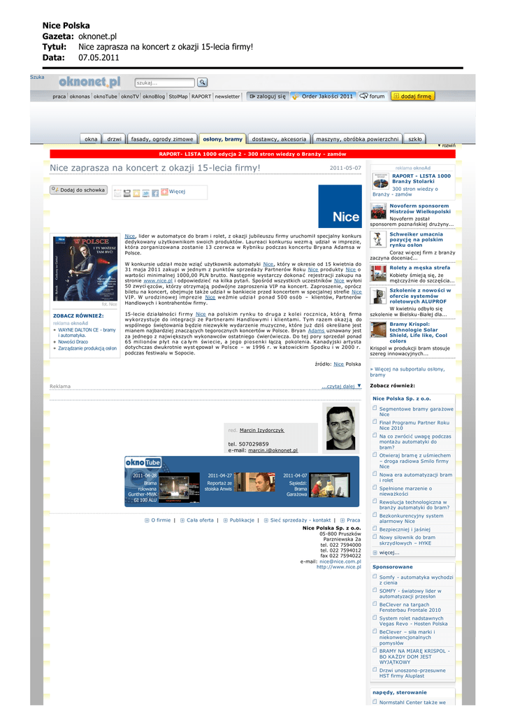 Oknonet.pl 2011 05 07 Nice zaprasza na koncert z okazji 15