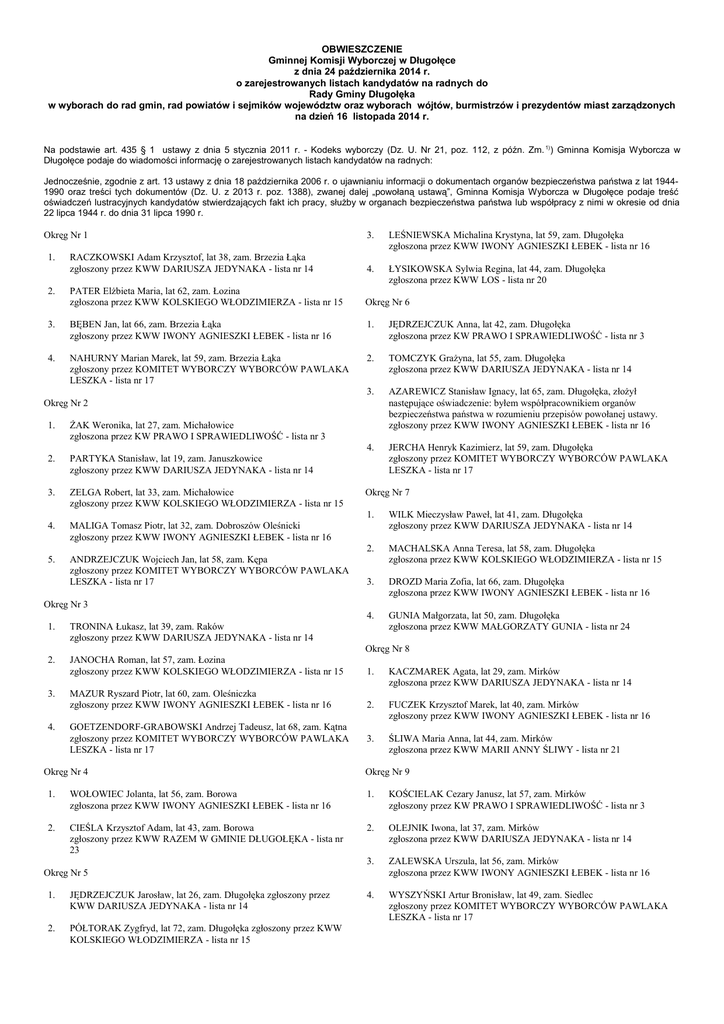OBWIESZCZENIE Gminnej Komisji Wyborczej w Długołęce z dnia 24 października 2014 r. o zarejestrowanych listach kandydatów na radnych do Rady Gminy Długołęka w wyborach do rad gmin, rad powiatów i sejmików województw oraz wyborach wójtów, burmistrzów i prezydentów miast zarządzonych na dzień 16 listopada 2014 r. Na podstawie art. 435 § 1 ustawy z dnia 5 stycznia 2011 r. - Kodeks wyborczy (Dz. U. Nr 21, poz. 112, z późn. Zm. 1)) Gminna Komisja Wyborcza w Długołęce podaje do wiadomości informację o zarejestrowanych listach kandydatów na radnych: Jednocześnie, zgodnie z art. 13 ustawy z dnia 18 października 2006 r. o ujawnianiu informacji o dokumentach organów bezpieczeństwa państwa z lat 19441990 oraz treści tych dokumentów (Dz. U. z 2013 r. poz. 1388), zwanej dalej „powołaną ustawą”, Gminna Komisja Wyborcza w Długołęce podaje treść oświadczeń lustracyjnych kandydatów stwierdzających fakt ich pracy, służby w organach bezpieczeństwa państwa lub współpracy z nimi w okresie od dnia 22 lipca 1944 r. do dnia 31 lipca 1990 r. Okręg Nr 1 1. 2. 3. LEŚNIEWSKA Michalina Krystyna, lat 59, zam. Długołęka zgłoszona przez KWW IWONY AGNIESZKI ŁEBEK - lista nr 16 RACZKOWSKI Adam Krzysztof, lat 38, zam. Brzezia Łąka zgłoszony przez KWW DARIUSZA JEDYNAKA - lista nr 14 4. ŁYSIKOWSKA Sylwia Regina, lat 44, zam. Długołęka zgłoszona przez KWW LOS - lista nr 20 PATER Elżbieta Maria, lat 62, zam. Łozina zgłoszona przez KWW KOLSKIEGO WŁODZIMIERZA - lista nr 15 Okręg Nr 6 3. BĘBEN Jan, lat 66, zam. Brzezia Łąka zgłoszony przez KWW IWONY AGNIESZKI ŁEBEK - lista nr 16 1. JĘDRZEJCZUK Anna, lat 42, zam. Długołęka zgłoszona przez KW PRAWO I SPRAWIEDLIWOŚĆ - lista nr 3 4. NAHURNY Marian Marek, lat 59, zam. Brzezia Łąka zgłoszony przez KOMITET WYBORCZY WYBORCÓW PAWLAKA LESZKA - lista nr 17 2. TOMCZYK Grażyna, lat 55, zam. Długołęka zgłoszona przez KWW DARIUSZA JEDYNAKA - lista nr 14 3. AZAREWICZ Stanisław Ignacy, lat 65, zam. Długołęka, złożył następujące oświadczenie: byłem współpracownikiem organów bezpieczeństwa państwa w rozumieniu przepisów powołanej ustawy. zgłoszony przez KWW IWONY AGNIESZKI ŁEBEK - lista nr 16 4. JERCHA Henryk Kazimierz, lat 59, zam. Długołęka zgłoszony przez KOMITET WYBORCZY WYBORCÓW PAWLAKA LESZKA - lista nr 17 Okręg Nr 2 1. ŻAK Weronika, lat 27, zam. Michałowice zgłoszona przez KW PRAWO I SPRAWIEDLIWOŚĆ - lista nr 3 2. PARTYKA Stanisław, lat 19, zam. Januszkowice zgłoszony przez KWW DARIUSZA JEDYNAKA - lista nr 14 3. ZELGA Robert, lat 33, zam. Michałowice zgłoszony przez KWW KOLSKIEGO WŁODZIMIERZA - lista nr 15 4. MALIGA Tomasz Piotr, lat 32, zam. Dobroszów Oleśnicki zgłoszony przez KWW IWONY AGNIESZKI ŁEBEK - lista nr 16 5. ANDRZEJCZUK Wojciech Jan, lat 58, zam. Kępa zgłoszony przez KOMITET WYBORCZY WYBORCÓW PAWLAKA LESZKA - lista nr 17 Okręg Nr 7 1. WILK Mieczysław Paweł, lat 41, zam. Długołęka zgłoszony przez KWW DARIUSZA JEDYNAKA - lista nr 14 2. MACHALSKA Anna Teresa, lat 58, zam. Długołęka zgłoszona przez KWW KOLSKIEGO WŁODZIMIERZA - lista nr 15 3. DROZD Maria Zofia, lat 66, zam. Długołęka zgłoszona przez KWW IWONY AGNIESZKI ŁEBEK - lista nr 16 4. GUNIA Małgorzata, lat 50, zam. Długołęka zgłoszona przez KWW MAŁGORZATY GUNIA - lista nr 24 Okręg Nr 3 1. TRONINA Łukasz, lat 39, zam. Raków zgłoszony przez KWW DARIUSZA JEDYNAKA - lista nr 14 2. JANOCHA Roman, lat 57, zam. Łozina zgłoszony przez KWW KOLSKIEGO WŁODZIMIERZA - lista nr 15 1. KACZMAREK Agata, lat 29, zam. Mirków zgłoszona przez KWW DARIUSZA JEDYNAKA - lista nr 14 MAZUR Ryszard Piotr, lat 60, zam. Oleśniczka zgłoszony przez KWW IWONY AGNIESZKI ŁEBEK - lista nr 16 2. FUCZEK Krzysztof Marek, lat 40, zam. Mirków zgłoszony przez KWW IWONY AGNIESZKI ŁEBEK - lista nr 16 3. ŚLIWA Maria Anna, lat 44, zam. Mirków zgłoszona przez KWW MARII ANNY ŚLIWY - lista nr 21 Okręg Nr 8 3. 4. GOETZENDORF-GRABOWSKI Andrzej Tadeusz, lat 68, zam. Kątna zgłoszony przez KOMITET WYBORCZY WYBORCÓW PAWLAKA LESZKA - lista nr 17 Okręg Nr 4 Okręg Nr 9 1. WOŁOWIEC Jolanta, lat 56, zam. Borowa zgłoszona przez KWW IWONY AGNIESZKI ŁEBEK - lista nr 16 1. KOŚCIELAK Cezary Janusz, lat 57, zam. Mirków zgłoszony przez KW PRAWO I SPRAWIEDLIWOŚĆ - lista nr 3 2. CIEŚLA Krzysztof Adam, lat 43, zam. Borowa zgłoszony przez KWW RAZEM W GMINIE DŁUGOŁĘKA - lista nr 23 2. OLEJNIK Iwona, lat 37, zam. Mirków zgłoszona przez KWW DARIUSZA JEDYNAKA - lista nr 14 3. ZALEWSKA Urszula, lat 56, zam. Mirków zgłoszona przez KWW IWONY AGNIESZKI ŁEBEK - lista nr 16 4. WYSZYŃSKI Artur Bronisław, lat 49, zam. Siedlec zgłoszony przez KOMITET WYBORCZY WYBORCÓW PAWLAKA LESZKA - lista nr 17 Okręg Nr 5 1. JĘDRZEJCZUK Jarosław, lat 26, zam. Długołęka zgłoszony przez KWW DARIUSZA JEDYNAKA - lista nr 14 2. PÓŁTORAK Zygfryd, lat 72, zam. Długołęka zgłoszony przez KWW KOLSKIEGO WŁODZIMIERZA - lista nr 15 Okręg Nr 10 Okręg Nr 15 1. SKRZYNIARZ Ewa Grażyna, lat 50, zam. Kamień zgłoszona przez KWW DARIUSZA JEDYNAKA - lista nr 14 1. GROCHOCKI Piotr Stefan, lat 41, zam. Szczodre zgłoszony przez KW PRAWO I SPRAWIEDLIWOŚĆ - lista nr 3 2. JAWORCZYKOWSKA Jolanta Ewa, lat 57, zam. Byków zgłoszona przez KWW IWONY AGNIESZKI ŁEBEK - lista nr 16 2. KARNIEWICZ Tomasz, lat 28, zam. Szczodre zgłoszony przez KWW DARIUSZA JEDYNAKA - lista nr 14 3. GUĆ Marek Piotr, lat 39, zam. Byków zgłoszony przez KOMITET WYBORCZY WYBORCÓW PAWLAKA LESZKA - lista nr 17 3. JAROSZ Józef Zbigniew, lat 61, zam. Szczodre zgłoszony przez KWW IWONY AGNIESZKI ŁEBEK - lista nr 16 4. 4. KOZAK Wojciech, lat 48, zam. Kamień zgłoszony przez KWW SPOŁECZNA GMINA - lista nr 19 TOMASZEWSKI Stanisław Józef, lat 54, zam. Szczodre zgłoszony przez KOMITET WYBORCZY WYBORCÓW PAWLAKA LESZKA - lista nr 17 Okręg Nr 11 Okręg Nr 16 1. POWROŹNIK Tadeusz Jacek, lat 44, zam. Łozina zgłoszony przez KW PRAWO I SPRAWIEDLIWOŚĆ - 