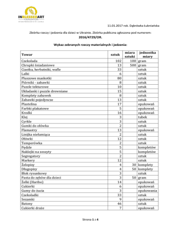 11.01.2017 rok. Dąbrówka Łubniańska Zbiórka rzeczy i jedzenia dla dzieci w Ukrainie. Zbiórka publiczna zgłoszona pod numerem: 2016/4729/OR. Wykaz zebranych rzeczy materialnych i jedzenia: miara jednostka sztuki miary 102 100 gram 13 500 gram 33 sztuk 6 sztuk 80 sztuk 8 sztuk 10 sztuk 15 sztuk 8 sztuk 13 sztuk 17 opakowań 5 opakowań 16 opakowań 3 tubek 3 sztuk 2 sztuk 13 opakowań 2 sztuk 12 sztuk 2 sztuk 5 kompletów 5 kompletów 2 sztuk 12 sztuk 4 30 komplety 4 50 komplety 3 sztuk 3 50 gram 14 opakowań 6 opakowań 3 opakowania 33 sztuk 9 opakowań 46 sztuk 7 opakowań Towar sztuk Czekolada Chrupki śniadaniowe Ciastka, herbatniki, wafle Lalki Pluszowe maskotki Piórniki - zabawki Puzzle tekturowe Układanki i puzzle drewniane Komplety zabawek Zabawki pojedyncze Plastelina Farbki plakatowe Kredki Klej Cyrkle Gumki do ołówka Flamastry Linijka niełamiąca Ołówki Temperówka Pędzle Naklejki na zeszyty Segregatory Markery Żelopisy Długopisy Blok rysunkowy Pasta do zębów dla dzieci Żelki (Haribo) Cukierki Gumy do żucia Czekoladki Sezamki Batony Cukierki draże Strona 1 z 4 Dropsy Mikołaje Cukierki luzem Zestaw matematyczny Kredki świecowe Kasza Kasza Makaron Makaron Ryż Ryż Ryż Makaron Olej Makaron Kasza manna Ciecierzyca Delma - margaryna mleko w proszku Bombonierki Skrobia ziemniaczana Mąka Pszenna Cukier Kawa Kawa Kawa rozpuszczalna Kawa rozpuszczalna Kakao Herbata expressowa Herbata expressowa Herbata expressowa Herbata expressowa Szynka krakus konserwa Pasztet drobiowy konserwa Gulasz belgijski konserwa Gulasz angielski konserwa Tuńczyk konserwa Pasztet z indykiem konserwa Gulasz wojskowy konserwa Kukurydza konserwa Łosoś konserwa Groszek konserwowy Filet z makreli konserwa 6 7 50 1 2 12 1 5 5 4 1 2 5 2 1 2 1 2 1 14 2 2 3 1 1 1 1 3 1 1 1 1 3 3 1 1 2 1 1 2 1 1 5 Strona 2 z 4 400 500 250 400 500 400 1000 500 1 750 500 500 1 500 500 1 1 500 250 200 100 200 30 60 70 120 450 155 160 160 150 300 300 140 150 400 170 opakowań sztuk sztuk sztuk opakowania gram gram gram gram gram gram gram gram litr gram gram gram kg gram opakowań gram kg kg gram gram gram gram gram gram gram gram gram gram gram gram gram gram gram gram gram gram gram gram Czosnek konserwowy Karczek konserwa Pasztet z indykiem konserwa Pasztet z drobiem golonka konserwa Szynka premium konserwa Gulasz angielski konserwa Gulasz wieprzowy Sardynki Konserwa turystyczna Seler wyborowy konserwowy Szczoteczki do zębów Chusteczki nawilżane dla niemowląt i dzieci Szampon bambino Palmoliv pod prysznic Płyn do kąpieli bobini Pasta do zębów Koncentrat do kąpieli „buble gum” Proszek do prania Krem Ziaja dla dzieci Woda toaletowa Proszek skoncentrowany do prania mydło ubranka dla niemowląt buty dla dzieci 4 2 1 1 2 1 1 2 3 1 1 12 3 2 1 1 5 1 1 2 1 4 36 1 1 Do skarbonki znajdującej w siedzibie fundacji zebrano: 100 zł Na konta fundacji wpłynęło: 490 zł Dokonano następujących zakupów dla usprawnienia zbiórki: Reklamówki foliowe – 10,00 zł Kartony pakowe mocne 10 szt. – 54 zł Naklejki oznakowujące zbiórkę – 60 zł Przewóz największej części zbiórki z Kielc – 168 zł (kurier) Razem wydano – 292 zł Strona 3 z 4 300 300 200 300 300 300 300 125 300 340 750 750 500 1,8 50 50 700 11 10 słoiczki gram gram gram gram gram gram gram gram gram gram sztuk opakowań opakowań ml ml opakowań ml kg ml ml gram kostek kg kg Koszt korespondencji seryjnej i reklamy w mediach społecznościowych ufundowane przez darczyńcę i pracownię ikon nie wliczane w zbiórkę jako jej koszt: 600 zł – korespondencja seryjna 370 sztuk listów wysłanych pocztą. 240 zł – komplet tonerów do drukarki w celu wydrukowania informacji. 60 zł – papier Razem - 900 zł Strona 4 z 4