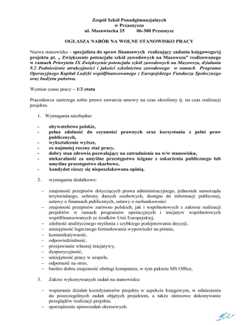 Zespół Szkół Ponadgimnazjalnych w Przasnyszu ul. Mazowiecka 25 06-300 Przasnysz OGŁASZA NABÓR NA WOLNE STANOWISKO PRACY Nazwa stanowiska – specjalista do spraw finansowych realizujący zadania księgowego/ej projektu pt. „ Zwiększenie potencjału szkół zawodowych na Mazowszu” realizowanego w ramach Priorytetu IX Zwiększenie potencjału szkół zawodowych na Mazowszu, działania 9.2 Podniesienie atrakcyjności i jakości szkolnictwa zawodowego w ramach Programu Operacyjnego Kapitał Ludzki współfinansowanego z Europejskiego Funduszu Społecznego oraz budżetu państwa. Wymiar czasu pracy – 1/2 etatu Pracodawca zastrzega sobie prawo zawarcia umowy na czas określony tj. na czas realizacji projektu. 1. Wymagania niezbędne: - - obywatelstwo polskie, pełna zdolność do czynności prawnych oraz korzystania z pełni praw publicznych, wykształcenie wyższe, co najmniej roczny staż pracy, dobry stan zdrowia pozwalający na zatrudnienie na w/w stanowisku, niekaralność za umyślne przestępstwo ścigane z oskarżenia publicznego lub umyślne przestępstwo skarbowe, kandydat cieszy się nieposzlakowana opinią. 2. wymagania dodatkowe: - znajomość przepisów dotyczących prawa administracyjnego, jednostek samorządu terytorialnego, ochrony danych osobowych, dostępu do informacji publicznej, ustawy o finansach publicznych, ustawy o rachunkowości znajomość przepisów zarówno polskich, jak i wspólnotowych z zakresu realizacji projektów w ramach programów operacyjnych i inicjatyw wspólnotowych współfinansowanych ze środków Unii Europejskiej, zdolność analitycznego myślenia i szybkiego podejmowania decyzji, umiejętność logicznego formułowania wypowiedzi na piśmie, komunikatywność, odpowiedzialność, przejawianie własnej inicjatywy, dyspozycyjność, umiejętność pracy w zespole, odporność na stres, bardzo dobra znajomość obsługi komputera, w tym pakietu MS Office, Zakres wykonywanych zadań na stanowisku: 3. wspieranie działań koordynatorów projektu w aspekcie księgowym, w odniesieniu do poszczególnych zadań objętych projektem, a także okresowe dokonywanie przeglądów realizacji projektu. sporządzenie sprawozdań okresowych. prowadzenie dokumentacji księgowej projektu zgodnie z obowiązującymi przepisami finansowymi, w tym opisywanie faktur. bieżąca współpraca z dyrektorami szkół zaangażowanych w projekt, współpraca z koordynatorem i specjalistą ds. finansowych z Zespołu Szkół Ponadgimnazjalnych w Chorzelach. pełnienie roli pośrednika między zespołem projektowym, a zastępcą dyrektora Wydziału Zdrowia Oświaty Kultury i Sportu współpracę w zakresie księgowania i realizacji płatności projektu z Wydziałem Finansowo- Budżetowym Starostwa Powiatowego w Przasnyszu współpraca w zakresie księgowości z IP2 kontrola poprawności formalnej księgowych i finansowych dokumentów projektu. odpowiednie opisywanie dokumentów związanych z realizacją projektu, zgodnie z wytycznymi. kontrola poprawności dokonanej klasyfikacji dokumentów z uwagi na: nazwę projektu, wielkość budżetowania a wielkość zrealizowaną, źródło finansowania, pozycje budżetowe projektu, podział na wydatki kwalifikowane, kategorie dodatkowe (zależnie od potrzeb projektu). dokonywanie kontroli księgowania kosztów projektu pod kątem spełnienia kryteriów dla tzw. wydatków kwalifikowanych, a w szczególności sprawdzenia czy są: konieczne dla wykonania zadań określonych projektem; związane z finansowaniem umów zawartych przez zamawiającego w celu osiągnięcia zadań wynikających z opisu projektu i są związane z realizacją projektu; udokumentowane odpowiednimi i prawidłowo sporządzonymi dokumentami źródłowymi. comiesięczna kontrola zgodności bilansu finansowanego projektu, wykonaną w oparciu o zapisy księgowe. przygotowanie we współpracy z koordynatorami projektu harmonogramu płatności wg zasad określonych w dokumentach programowych. prawidłowe oznaczenie i opisanie dokumentów księgowych przetwarzanych przy realizacji projektu. przygotowanie raportów o finansowym postępie realizacji projektu zapobieganie powstawaniu nieprawidłowości finansowych i raportowanie ich wystąpienia. rejestracja faktur i rachunków wpływających. weryfikacja faktur pod względem formalno-rachunkowym i prawidłowości rozliczeń finansowych uwzględniających wszystkie źródła finansowania. nadzór nad płatnościami dla wykonawców. przestrzeganie procedur i instrukcji związanych z realizacją projektu. ścisła współpraca z Głównym Księgowym w zakresie księgowości projektu. współpraca z organami kontrolującymi. inne obowiązki wynikające z bieżącej realizacji projektu 4. 5. 6. Warunki pracy na danym stanowisku. Praca wykonywana jest w siedzibie Zespołu Szkół Ponadgimnazjalnych w Przasnyszu w godz. ustalonych w uzgodnieniu z kandydatem przy stanowisku komputerowym. W miesiącu poprzedzającym datę upublicznienia ogłoszenia wskaźnik zatrudnienia osób niepełnosprawnych w urzędzie, w rozumieniu przepisów o rehabilitacji zawodowej i społecznej oraz zatrudnianiu osób niepełnosprawnych, jest niższy niż 6%. Wymagane dokumenty: a) list motywacyjny b) życiorys - curriculum vitae, c) kserokopie świadectw pracy - poświadczone przez kandydata za zgodność z oryginałem, d) kserokopie dokumentów potwierdzających wykształcenie i kwalifikacje zawodowe - poświadczone przez kandydata za zgodność z oryginałem, e) kserokopie zaświadczeń o ukończonych kursach, szkoleniach itp. - poświadczone przez kandydata za zgodność z oryginałem, f) oryginał kwestionariusza osobowego dla osoby ubiegającej się o zatrudnienie, g) oświadczenie kandydata o braku prawomocnego wyroku sądu za umyślne przestępstwo ścigane z oskarżenia publicznego lub umyślne przestępstwo skarbowe. h) Oświadczenie kandydata o pełnej zdolności do czynności prawnych oraz korzystania z pełni praw publicznych, i) kandydac