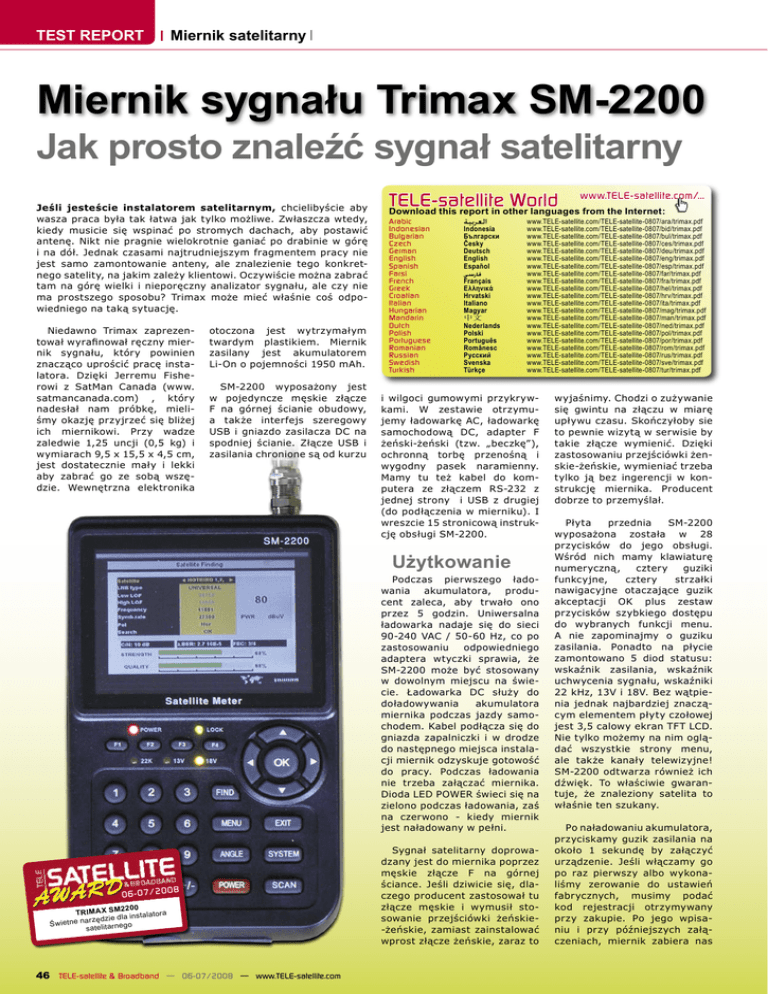 TEST REPORT Miernik satelitarny Miernik sygnału Trimax SM-2200 Jak prosto znaleźć sygnał satelitarny Jeśli jesteście instalatorem satelitarnym, chcielibyście aby wasza praca była tak łatwa jak tylko możliwe. Zwłaszcza wtedy, kiedy musicie się wspinać po stromych dachach, aby postawić antenę. Nikt nie pragnie wielokrotnie ganiać po drabinie w górę i na dół. Jednak czasami najtrudniejszym fragmentem pracy nie jest samo zamontowanie anteny, ale znalezienie tego konkretnego satelity, na jakim zależy klientowi. Oczywiście można zabrać tam na górę wielki i nieporęczny analizator sygnału, ale czy nie ma prostszego sposobu? Trimax może mieć właśnie coś odpowiedniego na taką sytuację. Niedawno Trimax zaprezentował wyrafinował ręczny miernik sygnału, który powinien znacząco uprościć pracę instalatora. Dzięki Jerremu Fisherowi z SatMan Canada (www. satmancanada.com) , który nadesłał nam próbkę, mieliśmy okazję przyjrzeć się bliżej ich miernikowi. Przy wadze zaledwie 1,25 uncji (0,5 kg) i wymiarach 9,5 x 15,5 x 4,5 cm, jest dostatecznie mały i lekki aby zabrać go ze sobą wszędzie. Wewnętrzna elektronika otoczona jest wytrzymałym twardym plastikiem. Miernik zasilany jest akumulatorem Li-On o pojemności 1950 mAh. SM-2200 wyposażony jest w pojedyncze męskie złącze F na górnej ścianie obudowy, a także interfejs szeregowy USB i gniazdo zasilacza DC na spodniej ścianie. Złącze USB i zasilania chronione są od kurzu TELE-satellite World Arabic Indonesian Bulgarian Czech German English Spanish Farsi French Greek Croatian Italian Hungarian Mandarin Dutch Polish Portuguese Romanian Russian Swedish Turkish ﺍﻟﻌﺮﺑﻴﺔ Indonesia Български Česky Deutsch English Español ﻓﺎﺭﺳﻲ Français Ελληνικά Hrvatski Italiano Magyar 中文 Nederlands Polski Português Românesc Русский Svenska Türkçe www.TELE-satellite.com/TELE-satellite-0807/ara/trimax.pdf www.TELE-satellite.com/TELE-satellite-0807/bid/trimax.pdf www.TELE-satellite.com/TELE-satellite-0807/bul/trimax.pdf www.TELE-satellite.com/TELE-satellite-0807/ces/trimax.pdf www.TELE-satellite.com/TELE-satellite-0807/deu/trimax.pdf www.TELE-satellite.com/TELE-satellite-0807/eng/trimax.pdf www.TELE-satellite.com/TELE-satellite-0807/esp/trimax.pdf www.TELE-satellite.com/TELE-satellite-0807/far/trimax.pdf www.TELE-satellite.com/TELE-satellite-0807/fra/trimax.pdf www.TELE-satellite.com/TELE-satellite-0807/hel/trimax.pdf www.TELE-satellite.com/TELE-satellite-0807/hrv/trimax.pdf www.TELE-satellite.com/TELE-satellite-0807/ita/trimax.pdf www.TELE-satellite.com/TELE-satellite-0807/mag/trimax.pdf www.TELE-satellite.com/TELE-satellite-0807/man/trimax.pdf www.TELE-satellite.com/TELE-satellite-0807/ned/trimax.pdf www.TELE-satellite.com/TELE-satellite-0807/pol/trimax.pdf www.TELE-satellite.com/TELE-satellite-0807/por/trimax.pdf www.TELE-satellite.com/TELE-satellite-0807/rom/trimax.pdf www.TELE-satellite.com/TELE-satellite-0807/rus/trimax.pdf www.TELE-satellite.com/TELE-satellite-0807/sve/trimax.pdf www.TELE-satellite.com/TELE-satellite-0807/tur/trimax.pdf i wilgoci gumowymi przykrywkami. W zestawie otrzymujemy ładowarkę AC, ładowarkę samochodową DC, adapter F żeński-żeński (tzw. „beczkę”), ochronną torbę przenośną i wygodny pasek naramienny. Mamy tu też kabel do komputera ze złączem RS-232 z jednej strony i USB z drugiej (do podłączenia w mierniku). I wreszcie 15 stronicową instrukcję obsługi SM-2200. Użytkowanie Podczas pierwszego ładowania akumulatora, producent zaleca, aby trwało ono przez 5 godzin. Uniwersalna ładowarka nadaje się do sieci 90-240 VAC / 50-60 Hz, co po zastosowaniu odpowiedniego adaptera wtyczki sprawia, że SM-2200 może być stosowany w dowolnym miejscu na świecie. Ładowarka DC służy do doładowywania akumulatora miernika podczas jazdy samochodem. Kabel podłącza się do gniazda zapalniczki i w drodze do następnego miejsca instalacji miernik odzyskuje gotowość do pracy. Podczas ładowania nie trzeba załączać miernika. Dioda LED POWER świeci się na zielono podczas ładowania, zaś na czerwono - kiedy miernik jest naładowany w pełni. 0 6 -0 7 /2 0 08 2200 TR IM AX SM instalatora rzędzie dla na e tn ie Św o satelitarneg 46 TELE-satellite & Broadband — 06-07/2008 — www.TELE-satellite.com www.TELE-satellite.com/... Download this report in other languages from the Internet: Sygnał satelitarny doprowadzany jest do miernika poprzez męskie złącze F na górnej ściance. Jeśli dziwicie się, dlaczego producent zastosował tu złącze męskie i wymusił stosowanie przejściówki żeńskie-żeńskie, zamiast zainstalować wprost złącze żeńskie, zaraz to wyjaśnimy. Chodzi o zużywanie się gwintu na złączu w miarę upływu czasu. Skończyłoby sie to pewnie wizytą w serwisie by takie złącze wymienić. Dzięki zastosowaniu przejściówki żenskie-żeńskie, wymieniać trzeba tylko ją bez ingerencji w konstrukcję miernika. Producent dobrze to przemyślał. Płyta przednia SM-2200 wyposażona została w 28 przycisków do jego obsługi. Wśród nich mamy klawiaturę numeryczną, cztery guziki funkcyjne, cztery strzałki nawigacyjne otaczające guzik akceptacji OK plus zestaw przycisków szybkiego dostępu do wybranych funkcji menu. A nie zapominajmy o guziku zasilania. Ponadto na płycie zamontowano 5 diod statusu: wskaźnik zasilania, wskaźnik uchwycenia sygnału, wskaźniki 22 kHz, 13V i 18V. Bez wątpienia jednak najbardziej znaczącym elementem płyty czołowej jest 3,5 calowy ekran TFT LCD. Nie tylko możemy na nim oglądać wszystkie strony menu, ale także kanały telewizyjne! SM-2200 odtwarza również ich dźwięk. To właściwie gwarantuje, że znaleziony satelita to właśnie ten szukany. Po naładowaniu akumulatora, przyciskamy guzik zasilania na około 1 sekundę by załączyć urządzenie. Jeśli włączamy go po raz pierwszy albo wykonaliśmy zerowanie do ustawień fabrycznych, musi