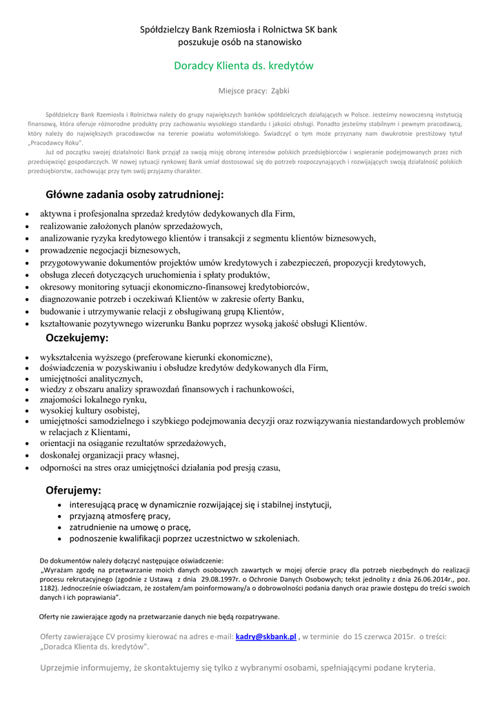 Spółdzielczy Bank Rzemiosła i Rolnictwa SK bank poszukuje osób na stanowisko Doradcy Klienta ds. kredytów Miejsce pracy: Ząbki Spółdzielczy Bank Rzemiosła i Rolnictwa należy do grupy największych banków spółdzielczych działających w Polsce. Jesteśmy nowoczesną instytucją finansową, która oferuje różnorodne produkty przy zachowaniu wysokiego standardu i jakości obsługi. Ponadto jesteśmy stabilnym i pewnym pracodawcą, który należy do największych pracodawców na terenie powiatu wołomińskiego. Świadczyć o tym może przyznany nam dwukrotnie prestiżowy tytuł „Pracodawcy Roku”. Już od początku swojej działalności Bank przyjął za swoją misję obronę interesów polskich przedsiębiorców i wspieranie podejmowanych przez nich przedsięwzięć gospodarczych. W nowej sytuacji rynkowej Bank umiał dostosować się do potrzeb rozpoczynających i rozwijających swoją działalność polskich przedsiębiorstw, zachowując przy tym swój przyjazny charakter. Główne zadania osoby zatrudnionej:           aktywna i profesjonalna sprzedaż kredytów dedykowanych dla Firm, realizowanie założonych planów sprzedażowych, analizowanie ryzyka kredytowego klientów i transakcji z segmentu klientów biznesowych, prowadzenie negocjacji biznesowych, przygotowywanie dokumentów projektów umów kredytowych i zabezpieczeń, propozycji kredytowych, obsługa zleceń dotyczących uruchomienia i spłaty produktów, okresowy monitoring sytuacji ekonomiczno-finansowej kredytobiorców, diagnozowanie potrzeb i oczekiwań Klientów w zakresie oferty Banku, budowanie i utrzymywanie relacji z obsługiwaną grupą Klientów, kształtowanie pozytywnego wizerunku Banku poprzez wysoką jakość obsługi Klientów. Oczekujemy:           wykształcenia wyższego (preferowane kierunki ekonomiczne), doświadczenia w pozyskiwaniu i obsłudze kredytów dedykowanych dla Firm, umiejętności analitycznych, wiedzy z obszaru analizy sprawozdań finansowych i rachunkowości, znajomości lokalnego rynku, wysokiej kultury osobistej, umiejętności samodzielnego i szybkiego podejmowania decyzji oraz rozwiązywania niestandardowych problemów w relacjach z Klientami, orientacji na osiąganie rezultatów sprzedażowych, doskonałej organizacji pracy własnej, odporności na stres oraz umiejętności działania pod presją czasu, Oferujemy:     interesującą pracę w dynamicznie rozwijającej się i stabilnej instytucji, przyjazną atmosferę pracy, zatrudnienie na umowę o pracę, podnoszenie kwalifikacji poprzez uczestnictwo w szkoleniach. Do dokumentów należy dołączyć następujące oświadczenie: „Wyrażam zgodę na przetwarzanie moich danych osobowych zawartych w mojej ofercie pracy dla potrzeb niezbędnych do realizacji procesu rekrutacyjnego (zgodnie z Ustawą z dnia 29.08.1997r. o Ochronie Danych Osobowych; tekst jednolity z dnia 26.06.2014r., poz. 1182). Jednocześnie oświadczam, że zostałem/am poinformowany/a o dobrowolności podania danych oraz prawie dostępu do treści swoich danych i ich poprawiania”. Oferty nie zawierające zgody na przetwarzanie danych nie będą rozpatrywane. Oferty zawierające CV prosimy kierować na adres e-mail: [email protected] , w terminie do 15 czerwca 2015r. o treści: „Doradca Klienta ds. kredytów”. Uprzejmie informujemy, że skontaktujemy się tylko z wybranymi osobami, spełniającymi podane kryteria.