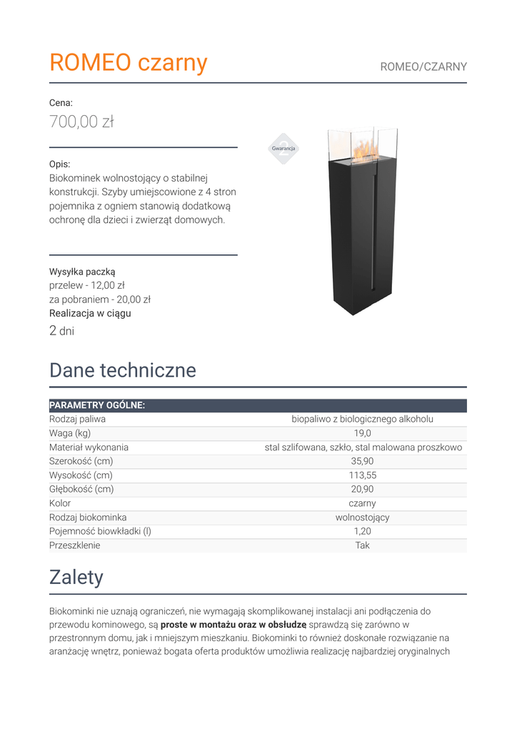 ROMEO czarny ROMEO/CZARNY Cena: 700,00 zł Opis: Biokominek wolnostojący o stabilnej konstrukcji. Szyby umiejscowione z 4 stron pojemnika z ogniem stanowią dodatkową ochronę dla dzieci i zwierząt domowych. Wysyłka paczką przelew - 12,00 zł za pobraniem - 20,00 zł Realizacja w ciągu 2 dni Dane techniczne PARAMETRY OGÓLNE: Rodzaj paliwa Waga (kg) Materiał wykonania Szerokość (cm) Wysokość (cm) Głębokość (cm) Kolor Rodzaj biokominka Pojemność biowkładki (l) Przeszklenie biopaliwo z biologicznego alkoholu 19,0 stal szlifowana, szkło, stal malowana proszkowo 35,90 113,55 20,90 czarny wolnostojący 1,20 Tak Zalety Biokominki nie uznają ograniczeń, nie wymagają skomplikowanej instalacji ani podłączenia do przewodu kominowego, są proste w montażu oraz w obsłudze, sprawdzą się zarówno w przestronnym domu, jak i mniejszym mieszkaniu. Biokominki to również doskonałe rozwiązanie na aranżację wnętrz, ponieważ bogata oferta produktów umożliwia realizację najbardziej oryginalnych pomysłów. Wyposażenie biokominka (standard): - Pojemnik na biopaliwo: wkład absorbujący/chłonny umieszczony w biowkładce zapewnia bezpieczeństwo użytkowania biokominka oraz wyklucza ryzyko rozlania się paliwa, nawet w przypadku przewrócenia się pojemnika. Pojemnik na biopaliwo wykonany ze stali nierdzewnej. (UWAGA!! Jednorazowo do pojemnika można wlać 50% pojemności biowkładki. Większa ilość płynu spowoduje, że płyn wyleje się po ewentualnym przechyleniu biopojemnika.) - Rączka regulująca do pojemnika. Sposób montażu: - Wolnostojący, nie wymaga montażu, do postawienia w dowolnym miejscu. Gwarancja 24 miesiące. Rysunek techniczny Gwarancja Wszystkie produkty dostępne na www.kratki.com są fabrycznie nowe, wolne od wad zycznych i prawnych oraz zostały legalnie wprowadzone na rynek polski. Producent udziela 2 lat gwarancji na sprawne działanie biokominka od momentu zakupu produktu. Nabywca biokominka zobowiązany jest do zapoznania się z instrukcją obsługi i montażu. Zwrot Klient będący Konsumentem, który zawarł Umowę sprzedaży, może w terminie 14 dni odstąpić od niej bez podawania przyczyny. Bieg terminu na odstąpienie od Umowy sprzedaży rozpoczyna się od chwili objęcia Towaru w posiadanie przez Klienta lub wskazaną przez niego osobę trzecią inną niż przewoźnik. Oświadczenie można złożyć na formularzu, którego wzór został zamieszczony przez Sprzedawcę na Stronie Internetowej Sklepu pod adresem: formularz odstąpienia. Kratki.pl Marek Bal ul. W. Gombrowicza 4 26-660 Wsola/Jedlińsk www.kratki.com tel. 48 340 10 00 Data publikacji: 07.02.2017