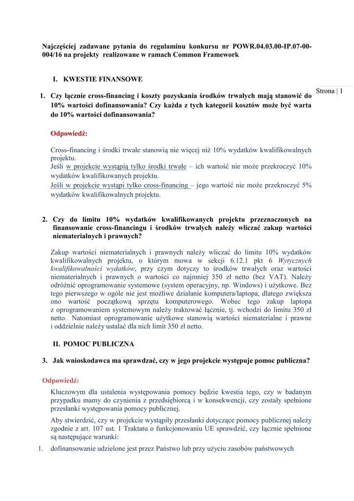 Najczęściej zadawane pytania do regulaminu konkursu nr POWR.04.03.00-IP.07-00004/16 na projekty realizowane w ramach Common Framework I. KWESTIE FINANSOWE 1. Czy łącznie cross-financing i koszty pozyskania środków trwałych mają stanowić do 10% wartości dofinansowania? Czy każda z tych kategorii kosztów może być warta do 10% wartości dofinansowania? Odpowiedź: Cross-financing i środki trwałe stanowią nie więcej niż 10% wydatków kwalifikowalnych projektu. Jeśli w projekcie wystąpią tylko środki trwałe – ich wartość nie może przekroczyć 10% wydatków kwalifikowanych projektu. Jeśli w projekcie wystąpi tylko cross-financing – jego wartość nie może przekroczyć 5% wydatków kwalifikowalnych projektu. 2. Czy do limitu 10% wydatków kwalifikowanych projektu przeznaczonych na finansowanie cross-financingu i środków trwałych należy wliczać zakup wartości niematerialnych i prawnych? Zakup wartości niematerialnych i prawnych należy wliczać do limitu 10% wydatków kwalifikowalnych projektu, o którym mowa w sekcji 6.12.1 pkt 6 Wytycznych kwalifikowalności wydatków, przy czym dotyczy to środków trwałych oraz wartości niematerialnych i prawnych o wartości co najmniej 350 zł netto (bez VAT). Należy odróżnić oprogramowanie systemowe (system operacyjny, np. Windows) i użytkowe. Bez tego pierwszego w ogóle nie jest możliwe działanie komputera/laptopa, dlatego zwiększa ono wartość początkową sprzętu komputerowego. Wobec tego zakup laptopa z oprogramowaniem systemowym należy traktować łącznie, tj. wchodzi do limitu 350 zł netto. Natomiast oprogramowanie użytkowe stanowią wartości niematerialne i prawne i oddzielnie należy ustalać dla nich limit 350 zł netto. II. POMOC PUBLICZNA 3. Jak wnioskodawca ma sprawdzać, czy w jego projekcie występuje pomoc publiczna? Odpowiedź: Kluczowym dla ustalenia występowania pomocy będzie kwestia tego, czy w badanym przypadku mamy do czynienia z przedsiębiorcą i w konsekwencji, czy zostały spełnione przesłanki występowania pomocy publicznej. Aby stwierdzić, czy w projekcie wystąpiły przesłanki dotyczące pomocy publicznej należy zgodnie z art. 107 ust. 1 Traktatu o funkcjonowaniu UE sprawdzić, czy łącznie spełnione są następujące warunki: 1. dofinansowanie udzielone jest przez Państwo lub przy użyciu zasobów państwowych Strona | 1 Przesłanka jest spełniona ze względu na źródło finansowania dotacji oraz fakt udzielania dofinansowania przez CPE – państwową jednostkę budżetową. 2. przedsiębiorca uzyskuje korzyść ekonomiczną rozumianą jako wsparcie udzielone na warunkach korzystniejszych od warunków rynkowych Przesłanka może być spełniona. W ramach działania 4.3 zakłada się, że wsparcie udzielone Strona | 2 wnioskodawcy na etapie przygotowawczym lub ewentualne testowanie rozwiązania nie generują występowania korzyści ekonomicznej. Przyjmuje się, że działania te mają na celu sprawdzenie, czy dane rozwiązanie można wdrożyć w warunkach polskich, a jeżeli tak to przy jakich zmianach, modyfikacjach, założeniach i na jakich warunkach. Jednocześnie przyjmuje się, że korzyść ekonomiczna może wystąpić od momentu przygotowania ostatecznej wersji rozwiązania, gotowej do wdrożenia. Za korzyść ekonomiczną uznaje się wówczas każdą korzyść uzyskaną przez wnioskodawcę w związku z wdrożeniem. Jeżeli w momencie posiadania gotowego produktu, wnioskodawca wdraża go u siebie, na warunkach korzystniejszych od warunków na jakich będą mogły wdrożyć ten sam produkt inne zainteresowane podmioty, będzie to stanowiło dla niego pomoc publiczną. Przykład: Wnioskodawca we współpracy z partnerami krajowymi i zagranicznymi w ramach realizowanego projektu wypracowuje nowe rozwiązania ukierunkowane na przyspieszenie powrotu na rynek pracy osób długotrwale bezrobotnych. Po wypracowaniu rozwiązania i zaadoptowaniu go do warunków polskich wnioskodawca wdrożył je u siebie i 2 partnerów do praktyki. W tym celu pracownicy wnioskodawcy i partnerów przeszli szkolenia oraz korzystali ze wsparcia doradczego i coachingu. W ramach działań wdrożeniowych wnioskodawca przygotował przewodnik oraz kodeks dobrych praktyk, które zamieścił na stronie internetowej. Działania szkoleniowe i doradcze skierowane do indywidualnych zainteresowanych (poza projektem) nie są przewidziane w ramach działań wdrożeniowych, zatem wsparcie w tym zakresie uzyskane przez wnioskodawcę i partnerów stanowi korzyść ekonomiczną dla wnioskodawcy i partnerów w stosunku do pozostałych podmiotów, które mogą skorzystać jedynie z przewodnika oraz kodeksu dobrych praktyk. Korzyścią będą też wszelkie szkolenia, doradztwo, warsztaty dla pracowników wnioskodawcy, odbywające się od momentu posiadania gotowego rozwiązania, nawet jeśli wnioskodawca nie zakłada wdrożenia u siebie nowego rozwiązania. 3. dofinansowanie ma charakter selektywny rozumiane jako uprzywilejowanie określonego lub określonych przedsiębiorców lub produkcję określonych towarów / świadczenia usług, Przesłanka jest spełniona, gdyż wsparcie dotyczy grupy podmiotów – wnioskodawców – wskazanych w dokumentacji konkursowej, co do których instytucja udzielająca dofinansowania jaką jest CPE podejmuje decyzję o jego przyznaniu. Wsparcie z natury nie obejmuje wszystkich podmiotów działających na terenie Polski, a więc przesłanka selektywności jest spełniona. 4. fakt udzielenia dofinansowania grozi zakłóceniem lub zakłóca konkurencję na rynku oraz wpływa na wymianę handlową między krajami członkowskimi UE. Przesłanka może być spełniona. Jeżeli wsparcie udzielone beneficjentowi będącemu przedsiębiorcą (w rozumieniu wspólnotowym) spełnia przesłanki 1-3, wtedy należy założyć, że również przesłanka nr 4 jest spełniona Kluczowym krokiem dla weryfikacji spełnienia tej przesłanki jest sprawdzenie, czy wnioskodawca jest przedsię