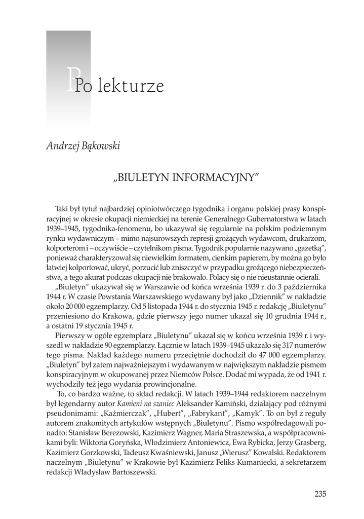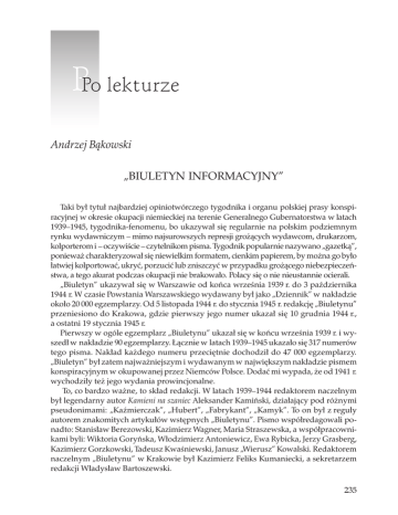PPo lekturze Andrzej Bąkowski „Biuletyn Informacyjny” Taki był tytuł najbardziej opiniotwórczego tygodnika i organu polskiej prasy konspiracyjnej w okresie okupacji niemieckiej na terenie Generalnego Gubernatorstwa w latach 1939–1945, tygodnika-fenomenu, bo ukazywał się regularnie na polskim podziemnym rynku wydawniczym – mimo najsurowszych represji grożących wydawcom, drukarzom, kolporterom i – oczywiście – czytelnikom pisma. Tygodnik popularnie nazywano „gazetką”, ponieważ charakteryzował się niewielkim formatem, cienkim papierem, by można go było łatwiej kolportować, ukryć, porzucić lub zniszczyć w przypadku grożącego niebezpieczeństwa, a tego akurat podczas okupacji nie brakowało. Polacy się o nie nieustannie ocierali. „Biuletyn” ukazywał się w Warszawie od końca września 1939 r. do 3 października 1944 r. W czasie Powstania Warszawskiego wydawany był jako „Dziennik” w nakładzie około 20 000 egzemplarzy. Od 5 listopada 1944 r. do stycznia 1945 r. redakcję „Biuletynu” przeniesiono do Krakowa, gdzie pierwszy jego numer ukazał się 10 grudnia 1944 r., a ostatni 19 stycznia 1945 r. Pierwszy w ogóle egzemplarz „Biuletynu” ukazał się w końcu września 1939 r. i wyszedł w nakładzie 90 egzemplarzy. Łącznie w latach 1939–1945 ukazało się 317 numerów tego pisma. Nakład każdego numeru przeciętnie dochodził do 47 000 egzemplarzy. „Biuletyn” był zatem najważniejszym i wydawanym w największym nakładzie pismem konspiracyjnym w okupowanej przez Niemców Polsce. Dodać mi wypada, że od 1941 r. wychodziły też jego wydania prowincjonalne. To, co bardzo ważne, to skład redakcji. W latach 1939–1944 redaktorem naczelnym był legendarny autor Kamieni na szaniec Aleksander Kamiński, działający pod różnymi pseudonimami: „Kaźmierczak”, „Hubert”, „Fabrykant”, „Kamyk”. To on był z reguły autorem znakomitych artykułów wstępnych „Biuletynu”. Pismo współredagowali ponadto: Stanisław Berezowski, Kazimierz Wagner, Maria Straszewska, a współpracownikami byli: Wiktoria Goryńska, Włodzimierz Antoniewicz, Ewa Rybicka, Jerzy Grasberg, Kazimierz Gorzkowski, Tadeusz Kwaśniewski, Janusz „Wierusz” Kowalski. Redaktorem naczelnym „Biuletynu” w Krakowie był Kazimierz Feliks Kumaniecki, a sekretarzem redakcji Władysław Bartoszewski. 235 Andrzej Bąkowski PALESTRA „Biuletyn” – ogólnie biorąc – był wydawnictwem działającym z ramienia Polskich Sił Zbrojnych w Kraju. Początkowo tygodnik wydawany był przez Dowództwo Okręgu Warszawa-Miasto Służby Zwycięstwu Polski. Potem był organem centralnym Związku Walki Zbrojnej, a po reorganizacjach organem prasowym Armii Krajowej. Wiosną 1941 r. stał się centralnym organem prasowym VI Oddziału Biura Informacji i Propagandy Komendy Głównej Armii Krajowej. W niniejszym tekście wykorzystałem Część II roczników 1942–1943 oraz Część III przedruku rocznika 1944 r. (do Powstania Warszawskiego 1944 r.). Te dwa tomy powstały jako numery specjalne, 2 (195) i 3 (200) „Wojskowego Przeglądu Historycznego”. Całości nie zdołałem zgromadzić w swojej biblioteczce. Przedruki „Biuletynu Informacyjnego” powstały dzięki Ministerstwu Obrony Narodowej (wydawcy), a ukazały się nakładem Domu Wydawniczego Bellona i „Przeglądu Historyczno-Wojskowego”. Rada Naukowa przedsięwzięcia składała się z wielu znaczących polskich historyków, którzy czuwali nad rzetelnym i krytycznym przygotowaniem materiału do druku. Tom obejmujący lata 1942–1943 dotyczy okresu, kiedy to Niemcy weszły zdecydowanie w fazę przegrywania wojny, groźnym symptomem stały się mordercze walki na Wschodzie z Armią Czerwoną. Wehrmacht początkowo co prawda odnosił sukcesy, ale też ponosił spektakularne klęski. Punktem zwrotnym była na początku 1943 r. kapitulacja feldmarszałka Paulusa pod Stalingradem. Niedługo potem nadeszła klęska na Łuku Kurskim. W innych teatrach wojennych Niemcy również w tym czasie ponosiły druzgocące porażki, jak utrata Tunezji. Wojska amerykańskie wylądowały w Afryce Północnej, następnie na Sycylii, w południowych Włoszech. Włochy skapitulowały. Na Atlantyku nastąpił kres sukcesów niemieckich łodzi podwodnych, tzw. wilczych stad. Cały obszar Niemiec, wszystkie tereny, gdzie zlokalizowany był przemysł wojenny, poddane były straszliwym w skutkach bombardowaniom ze strony lotnictwa alianckiego. To wszystko sprawiło, że zwycięstwo niemieckie w II wojnie światowej stało się niemożliwe. W krajach okupowanych zamilkły audycje nadawane przez megafony, zwane powszechnie w Polsce „szczekaczkami”. Plakaty niemieckie z hasłem Deutschland siegt an allen Fronten tzw. mały sabotaż zamieniał na Deutschland liegt an allen Fronten. W Polsce narastał opór w postaci akcji zbrojnych Armii Krajowej, która uwalniała więźniów, wykolejała niemieckie pociągi, likwidowała przedstawicieli niemieckiego aparatu represji, zdrajców i agentów oraz innych wysługujących się Niemcom; piętnowano zaprzańców, volksdeutschów, demolowano urzędy pracy, aby zapobiec wywózkom na roboty do Niemiec. W okupowanej Polsce w kwietniu 1943 r. ukazały się wstrząsające niemieckie informacje o sowieckiej zbrodni w Katyniu popełnionej na oficerach polskich. W następstwie tego doszło do zerwania stosunków dyplomatycznych przez rząd sowiecki z polskim rządem w Londynie. W kraju rosła tymczasem propaganda sowiecka, ale też i antysowiecka. „Biuletyn Informacyjny” piętnował agenturę sowiecką w postaci PPR. W tym czasie Niemcy finalizowali akt ludobójstwa dokonanego na populacji polskich Żydów, wysiedlali Polaków z Zamojszczyzny, a Ukraińcy dokonywali rzezi Polaków na Wołyniu i w Małopolsce Wschodniej. Na łamach „Biuletynu” promuje się ideę demokratycznego Państwa Polskiego, które weźmie w opiekę wszystkie środowiska, ludzi skrzywdzonych przez wojnę i okupa