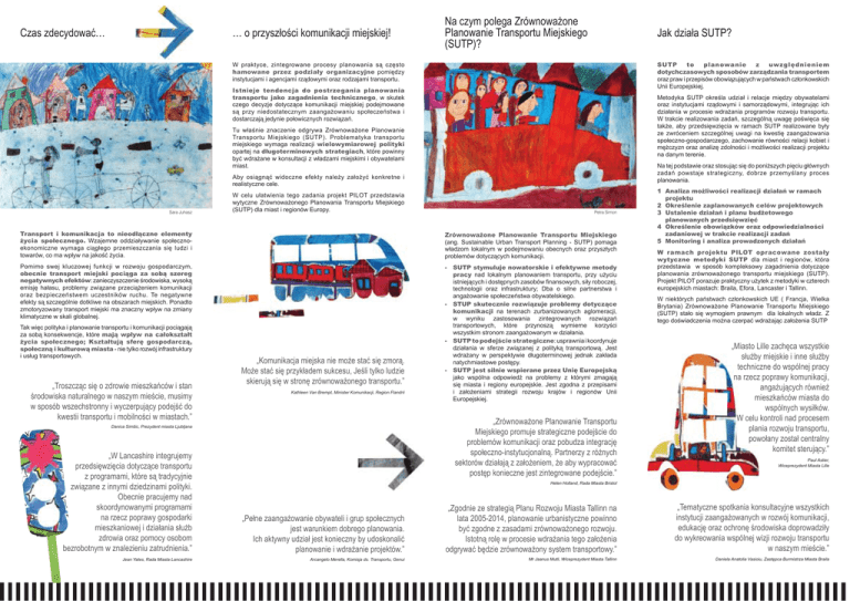 Czas zdecydować… … o przyszłości komunikacji miejskiej! Na czym polega Zrównoważone Planowanie Transportu Miejskiego (SUTP)? Jak działa SUTP? SUTP to planowanie z uwzględnieniem dotychczasowych sposobów zarządzania transportem oraz praw i przepisów obowiązujących w państwach członkowskich Unii Europejskiej. W praktyce, zintegrowane procesy planowania są często hamowane przez podziały organizacyjne pomiędzy instytucjami i agencjami rządowymi oraz rodzajami transportu. Istnieje tendencja do postrzegania planowania transportu jako zagadnienia technicznego, w skutek czego decyzje dotyczące komunikacji miejskiej podejmowane są przy niedostatecznym zaangażowaniu społeczeństwa i dostarczają jedynie połowicznych rozwiązań. Metodyka SUTP określa udział i relacje między obywatelami oraz instytucjami rządowymi i samorządowymi, integrując ich działania w procesie wdrażania programów rozwoju transportu. W trakcie realizowania zadań, szczególną uwagę poświęca się także, aby przedsięwzięcia w ramach SUTP realizowane były ze zwróceniem szczególnej uwagi na kwestię zaangażowania społeczno-gospodarczego, zachowanie równości relacji kobiet i mężczyzn oraz analizę zdolności i możliwości realizacji projektu na danym terenie. Tu właśnie znaczenie odgrywa Zrównoważone Planowanie Transportu Miejskiego (SUTP). Problematyka transportu miejskiego wymaga realizacji wielowymiarowej polityki opartej na długoterminowych strategiach, które powinny być wdrażane w konsultacji z władzami miejskimi i obywatelami miast. Na tej podstawie oraz stosując się do poniższych pięciu głównych zadań powstaje strategiczny, dobrze przemyślany proces planowania. Aby osiągnąć widoczne efekty należy założyć konkretne i realistyczne cele. Sara Juhasz W celu ułatwienia tego zadania projekt PILOT przedstawia wytyczne Zrównoważonego Planowania Transportu Miejskiego (SUTP) dla miast i regionów Europy. Petra Simon Transport i komunikacja to nieodłączne elementy życia społecznego. Wzajemne oddziaływanie społecznoekonomiczne wymaga ciągłego przemieszczania się ludzi i towarów, co ma wpływ na jakość życia. Zrównoważone Planowanie Transportu Miejskiego (ang. Sustainable Urban Transport Planning - SUTP) pomaga władzom lokalnym w podejmowaniu obecnych oraz przyszłych problemów dotyczących komunikacji. Pomimo swej kluczowej funkcji w rozwoju gospodarczym, obecnie transport miejski pociąga za sobą szereg negatywnych efektów: zanieczyszczenie środowiska, wysoką emisję hałasu, problemy związane przeciążeniem komunikacji oraz bezpieczeństwem uczestników ruchu. Te negatywne efekty są szczególnie dotkliwe na obszarach miejskich. Ponadto zmotoryzowany transport miejski ma znaczny wpływ na zmiany klimatyczne w skali globalnej. - SUTP stymuluje nowatorskie i efektywne metody pracy nad lokalnym planowaniem transportu, przy użyciu istniejących i dostępnych zasobów Þnansowych, siły roboczej, technologii oraz infrastruktury; Dba o silne partnerstwa i angażowanie społeczeństwa obywatelskiego. - STUP skutecznie rozwiązuje problemy dotyczące komunikacji na terenach zurbanizowanych aglomeracji, w wyniku zastosowania zintegrowanych rozwiązań transportowych, które przynoszą wymierne korzyści wszystkim stronom zaangażowanym w działania. - SUTP to podejście strategiczne: usprawnia i koordynuje działania w sferze związanej z polityką transportową. Jest wdrażany w perspektywie długoterminowej jednak zakłada natychmiastowe postępy. - SUTP jest silnie wspierane przez Unię Europejską jako wspólna odpowiedź na problemy z którymi zmagają się miasta i regiony europejskie. Jest zgodna z przepisami i założeniami strategii rozwoju krajów i regionów Unii Europejskiej. Tak więc polityka i planowanie transportu i komunikacji pociągają za sobą konsekwencje, które mają wpływ na całokształt życia społecznego; Kształtują sferę gospodarczą, społeczną i kulturową miasta - nie tylko rozwój infrastruktury i usług transportowych. „Troszcząc się o zdrowie mieszkańców i stan środowiska naturalnego w naszym mieście, musimy w sposób wszechstronny i wyczerpujący podejść do kwestii transportu i mobilności w miastach.” „Komunikacja miejska nie może stać się zmorą. Może stać się przykładem sukcesu, Jeśli tylko ludzie skierują się w stronę zrównoważonego transportu.” Kathleen Van Brempt, Minister Komunikacji, Region Flandrii „Zrównoważone Planowanie Transportu Miejskiego promuje strategiczne podejście do problemów komunikacji oraz pobudza integrację społeczno-instytucjonalną. Partnerzy z różnych sektorów działają z założeniem, że aby wypracować postęp konieczne jest zintegrowane podejście.” Danica Simšic, Prezydent miasta Ljubljana „W Lancashire integrujemy przedsięwzięcia dotyczące transportu z programami, które są tradycyjnie związane z innymi dziedzinami polityki. Obecnie pracujemy nad skoordynowanymi programami na rzecz poprawy gospodarki mieszkaniowej i działania służb zdrowia oraz pomocy osobom bezrobotnym w znalezieniu zatrudnienia.” Jean Yates, Rada Miasta Lancashire 1 Analiza możliwości realizacji działań w ramach projektu 2 Określenie zaplanowanych celów projektowych 3 Ustalenie działań i planu budżetowego planowanych przedsięwzięć 4 Określenie obowiązków oraz odpowiedzialności zadaniowej w trakcie realizacji zadań 5 Monitoring i analiza prowadzonych działań W ramach projektu PILOT opracowane zostały wytyczne metodyki SUTP dla miast i regionów, która przedstawia w sposób kompleksowy zagadnienia dotyczące planowania zrównoważonego transportu miejskiego (SUTP). Projekt PILOT porazuje praktyczny użytek z metodyki w czterech europejskich miastach: Braila, Efora, Lancaster i Tallinn. W niektórych państwach członkowskich UE ( Francja, Wielka Brytania) Zrównoważone Planowanie Transportu Miejskiego (SUTP) stało się wy