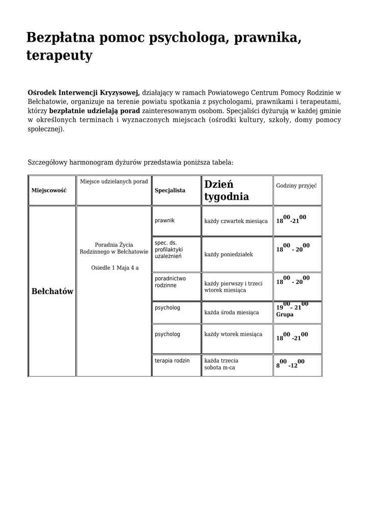Bezpłatna pomoc psychologa, prawnika, terapeuty Ośrodek Interwencji Kryzysowej, działający w ramach Powiatowego Centrum Pomocy Rodzinie w Bełchatowie, organizuje na terenie powiatu spotkania z psychologami, prawnikami i terapeutami, którzy bezpłatnie udzielają porad zainteresowanym osobom. Specjaliści dyżurują w każdej gminie w określonych terminach i wyznaczonych miejscach (ośrodki kultury, szkoły, domy pomocy społecznej). Szczegółowy harmonogram dyżurów przedstawia poniższa tabela: Specjalista Dzień tygodnia prawnik każdy czwartek miesiąca Miejsce udzielanych porad Miejscowość Poradnia Życia Rodzinnego w Bełchatowie spec. ds. profilaktyki uzależnień każdy poniedziałek Godziny przyjęć 00 00 18 -21 00 00 18 - 20 Osiedle 1 Maja 4 a Bełchatów poradnictwo rodzinne psycholog każdy pierwszy i trzeci wtorek miesiąca każda środa miesiąca 00 00 18 - 20 00 00 19 – 21 Grupa psycholog każdy wtorek miesiąca 00 00 18 -21 terapia rodzin każda trzecia sobota m-ca 8 00 00 -12 prawnik Dom Katechetyczny Bełchatów ul. Kościuszki 2 prawnik w każdy poniedziałek 30 00 16 -19 w każda sobotę 00 00 11 -13 w każdy wtorek 00 00 15 - 18 Bełchatów psycholog specjalista ds. przeciwdziałania przemocy Zelów psycholog każdy drugi i czwarty czwartek miesiąca 30 30 15 – 18 prawnik każda pierwsza i ostatnia środa miesiąca 00 00 16 -20 Szkoła Podstawowa ul. Szkolna 4 psycholog każdy pierwszy 1 i 3 poniedziałek miesiąca oraz 4 czwartek miesiąca 00 00 15 -18 prawnik co drugi czwartek miesiąca 00 00 15 -17 każdy piątek miesiąca 00 00 15 -17 prawnik co drugi poniedziałek miesiąca 00 00 16 – 20 psycholog każdy pierwszy i ostatni wtorek miesiąca 30 30 15 -18 prawnik każdy pierwszy i ostatni wtorek miesiąca 00 00 16 -20 Gminny Ośrodek Pomocy Społecznej psycholog każdy pierwszy i trzeci czwartek miesiąca 00 00 13 -16 Szkoła Podstawowa w Wadlewie psycholog każdy wtorek 30 30 12 – 15 każdy drugi i czwarty poniedziałek miesiąca 30 30 14 -17 każdy drugi i czwarty poniedziałek miesiąca 00 00 16 -19 Urząd Gminy Szkoła Podstawowa ul. Szkolna 23 Rusiec Gminny Ośrodek Pomocy Społecznej ul. Osiedlowa 2 Gminny Ośrodek Kultury ul. Koniecpolskiego 5 psycholog Urząd Gminy Drużbice Wadlew psycholog Szczerców 00 00 17 - 20 Miejsko-Gminny Ośrodek Pomocy Społecznej w Zelowie ul. Piotrkowska 12 Kluki Kleszczów każdy wtorek miesiąca Gminny Ośrodek Pomocy Społecznej w Szczercowie ul 3 maja 6 prawnik