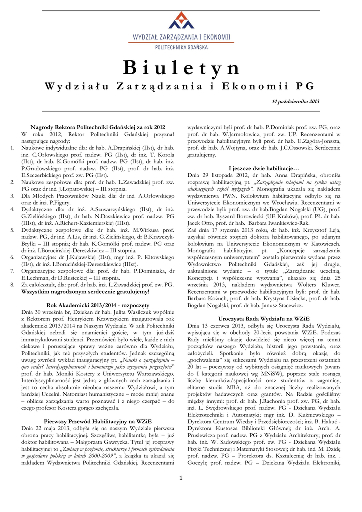Biuletyn Wydziału Zarządzania i Ekonomii PG 14 października 2013 1. 2. 3. 4. 5. 6. 7. 8. Nagrody Rektora Politechniki Gdańskiej za rok 2012 W roku 2012, Rektor Politechniki Gdańskiej przyznał następujące nagrody: Naukowe indywidualne dla: dr hab. A.Drapińskiej (IIst), dr hab. inż. C.Orłowskiego prof. nadzw. PG (IIst), dr inż. T. Korola (IIst), dr hab. K.Gomółki prof. nadzw. PG (IIst), dr hab. inż. P.Grudowskiego prof. nadzw. PG (IIst), prof. dr hab. inż. E.Szczerbickiego prof. zw. PG (IIst). Naukowe zespołowe dla: prof. dr hab. L.Zawadzkiej prof. zw. PG oraz dr inż. J.Łopatowskiej – III stopnia. Dla Młodych Pracowników Nauki dla: dr inż. A.Orłowskiego oraz dr inż. P.Figury. Dydaktyczne dla: dr inż. A.Szuwarzyńskiego (IIst), dr inż. G.Zielińskiego (IIst), dr hab. N.Daszkiewicz prof. nadzw. PG (IIIst), dr inż. A.Richert-Kaziemierskiej (IIIst). Dydaktyczne zespołowe dla: dr hab. inż. M.Wirkusa prof. nadzw. PG, dr inż. A.Lis, dr inż. G.Zielińskiego, dr B.KrawczykBryłki – III stopnia; dr hab. K.Gomółki prof. nadzw. PG oraz dr inż. I.Borucińskiej-Dereszkiwicz – III stopnia. Organizacyjne: dr J.Kujawskiej (IIst), mgr inż. P. Kitowskiego (IIst), dr inż. I.Borucińskiej-Dereszkiewicz (IIIst). Organizacyjne zespołowe dla: prof. dr hab. P.Dominiaka, dr E.Lechman, dr D.Rusieckiej – III stopnia. Za całokształt, dla: prof. dr hab. inż. L.Zawadzkiej prof. zw. PG. Wszystkim nagrodzonym serdecznie gratulujemy! wydawniczymi byli prof. dr hab. P.Dominiak prof. zw. PG, oraz prof. dr hab. W.Jarmołowicz, prof. zw. UP. Recenzentami w przewodzie habilitacyjnym byli prof. dr hab. U.Zagóra-Jonszta, prof. dr hab. A.Wojtyna, oraz dr hab. J.C.Ossowski. Serdecznie gratulujemy. I jeszcze dwie habilitacje… Dnia 29 listopada 2012, dr hab. Anna Drapińska, obroniła rozprawę habilitacyjną pt. „Zarządzanie relacjami na rynku usług edukacyjnych szkół wyższych”. Monografia ukazała się nakładem wydawnictwa PWN. Kolokwium habilitacyjne odbyło się na Uniwersytecie Ekonomicznym we Wrocławiu. Recenzentami w przewodzie byli: prof. zw. dr hab.Bogdan Nogalski (UG), prof. zw. dr hab. Ryszard Borowiecki (UE Kraków), prof. PŁ dr hab. Jacek Otto, prof. dr hab. Barbara Iwankiewicz-Rak. Zaś dnia 17 stycznia 2013 roku, dr hab. inż. Krzysztof Leja, uzyskał również stopień doktora habilitowanego, po udanym kolokwium na Uniwersytecie Ekonomicznym w Katowicach. Monografia habilitacyjna pt. „Koncepcje zarządzania współczesnym uniwersytetem" została pierwotnie wydana przez Wydawnictwo Politechniki Gdańskiej, zaś jej drugie, uaktualnione wydanie – o tytule „Zarządzanie uczelnią. Koncepcja i współczesne wyzwania”, ukazało się dnia 25 września 2013, nakładem wydawnictwa Wolters Kluwer. Recenzentami w przewodzie habilitacyjnym byli: prof. dr hab. Barbara Kożuch, prof. dr hab. Krystyna Lisiecka, prof. dr hab. Bogdan Nogalski, prof. dr hab. Janusz Stacewicz. Rok Akademicki 2013/2014 - rozpoczęty Dnia 30 września br, Dziekan dr hab. Julita Wasilczuk wspólnie z Rektorem prof. Henrykiem Krawczykiem inaugurowała rok akademicki 2013/2014 na Naszym Wydziale. W auli Politechniki Gdańskiej zebrali się znamienici goście, w tym już dziś immatrykulowani studenci. Przemówień było wiele, każde z nich ciekawe i poruszające sprawy ważne zarówno dla Wydziału, Politechniki, jak też przyszłych studentów. Jednak szczególną uwagę zwrócił wykład inauguracyjny pt. „Nauki o zarządzaniu – quo vadis? Interdyscyplinarność i humanizm jako wyzwania przyszłości” prof. dr hab. Moniki Kostery z Uniwersytetu Warszawskiego. Interdyscyplinarność jest jedną z głównych cech zarządzania i jest to cecha absolutnie nieobca naszemu Wydziałowi, a tym bardziej Uczelni. Natomiast humanistyczne – może mniej znane – oblicze zarządzania warto poznawać i z niego czerpać – do czego profesor Kostera gorąco zachęcała. Uroczysta Rada Wydziału na WZiE Dnia 13 czerwca 2013, odbyła się Uroczysta Rada Wydziału, wpisująca się w obchody 20-lecia powstania WZiE. Podczas Rady mieliśmy okazję dowidzieć się nieco więcej na temat początków naszego Wydziału, historii jego powstania, oraz założycieli. Spotkanie było również dobrą okazją do „pochwalenia” się sukcesami Wydziału na przestrzeni ostatnich 20 lat – począwszy od wybitnych osiągnięć naukowych (awans do I kategorii naukowej wg MNiSW), poprzez stale rosnącą liczbę kierunków/specjalności oraz studentów z zagranicy, elitarne studia MBA, aż do znacznej liczby realizowanych projektów badawczych oraz grantów. Na Radzie gościliśmy między innymi: prof. dr hab. J.Rachonia prof. zw. PG, dr hab. inż. L. Swędrowskiego prof. nadzw. PG - Dziekana Wydziału Elektrotechniki i Automatyki; mgr inż. D. Kuźniewskiego – Dyrektora Centrum Wiedzy i Przedsiębiorczości; inż. B. Hakuć Dyrektora Kustosza Biblioteki Głównej; dr inż. Arch. A. Prusiewicza prof. nadzw. PG z Wydziału Architektury; prof. dr hab. inż. W. Sadowskiego prof. zw. PG - Dziekana Wydziału Fizyki Technicznej i Matematyki Stosowej; dr hab. inż. M. Dzidę prof. nadzw. PG – Prorektora ds. Kształcenia; dr hab. inż. . Goczyłę prof. nadzw. PG – Dziekana Wydziału Elektroniki, Pierwszy Przewód Habilitacyjny na WZiE Dnia 22 maja 2013, odbyła się na naszym Wydziale pierwsza obrona pracy habilitacyjnej. Szczęśliwą habilitantką była – już doktor habilitowana – Małgorzata Gawrycka. Tytuł jej rozprawy habilitacyjnej to „Zmiany w poziomie, strukturze i formach zatrudnienia w gospodarce polskiej w latach 2000-2009”, a książka ta ukazał się nakładem Wydawnictwa Politechniki Gdańskiej. Recenzentami 1 Telekomunikacji i Informatyki; prof. dr hab. inż. E. Wittbrodta prof. zw. PG – z Wydziału Mechanicznego. Wiele osób z firm zewnętrznych: Zbigniewa Canowieckiego – Prezesa Zarządu Pracodawcy Pomorza; Katarzynę Gwóźdź, Kamilę Siwak oraz Rafała Stepnowskiego – człone