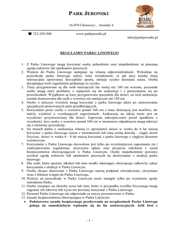 PARK JERONIKI 16-070 Choroszcz , Jeroniki 4 722-250-500 www.parkjeroniki.pl [email protected] REGULAMIN PARKU LINOWEGO 1. Z Parku Linowego mogą korzystać osoby pełnoletnie oraz niepełnoletnie za pisemną zgodą rodziców lub opiekunów prawnych. 2. Wejście do Parku Linowego następuje na własną odpowiedzialność. Wchodząc na przeszkody parku linowego należy mieć świadomość, iż jak przy każdej innej rekreacyjnie uprawianej dyscyplinie sportu, istnieje ryzyko doznania urazu. Osoba akceptująca treść regulaminu podejmuje to ryzyko. 3. Trasy przygotowane są dla osób mierzących nie mniej niż 160 cm wzrostu, pozostałe osoby mogą mieć problemy z wpięciem się do asekuracji i z poruszaniem się po przeszkodach. Wyjątkiem są trasy przygotowane specjalnie dla dzieci, na nich asekuracja została dostosowana dla osób o wzroście nie mniejszym niż 120 cm. 4. Osoby o niższym wzroście mogą korzystać z parku linowego także po zastosowaniu specjalnych atestowanych taśm przedłużających. 5. Korzystanie przez osoby o wzroście ponad 160 cm z trasy dziecięcej jest możliwe, ale należy wiedzieć o wynikających zagrożeniach. Asekuracja na takiej trasie jest na wysokości przystosowanej dla dzieci. Zapewnia zabezpieczenie przed upadkiem z wysokości, lecz osoby o wzroście ponad 160 cm w momencie odpadnięcia mogą uderzyć się o elementy przeszkody. 6. Na trasach parku z asekuracją własną (z uprzężami) dzieci w wieku do 6 lat muszą korzystać z parku linowego razem z instruktorem lub inną osobą dorosłą – ciągły dozór fizyczny, dzieci w wieku 6 - 8 lat muszą korzystać z parku linowego z ciągłym dozorem wzrokowym. 7. Korzystanie z Parku Linowego dozwolone jest tylko po wcześniejszym zapoznaniu się i zaakceptowaniu regulaminu, uiszczeniu opłaty oraz przejściu szkolenia z zasad bezpieczeństwa obowiązujących w Parku Linowym. Osoby niepełnoletnie powinny uzyskać zgodę rodziców lub opiekunów prawnych na skorzystanie z atrakcji parku linowego. 8. Dla osób, które spożyły alkohol lub inne środki odurzające obowiązuje całkowity zakaz korzystania z atrakcji w Parku Linowym. 9. Osoby chcące skorzystać z Parku Linowego muszą podpisać oświadczenie, otrzymane wraz z biletem wstępu do Parku Linowego. 10. Wejście na przeszkody w Parku Linowym może nastąpić tylko po wyrażeniu zgody instruktora Parku. 11. Osoby cierpiące na choroby serca lub inne, które w przypadku wysiłku fizycznego mogą zagrażać ich zdrowiu lub życiu nie powinny korzystać z Parku Linowego. 12. Personel Parku Linowego nie odpowiada za rzeczy pozostawione w Parku. 13. Zasady bezpieczeństwa obowiązujące w Parku Linowym: Podstawowa zasada bezpiecznego przebywania na urządzeniach Parku Linowego polega na samodzielnym wpinaniu się do lin asekuracyjnych. Jeśli ktoś z -1- jakichkolwiek powodów nie będzie w stanie wykonywać tej czynności nie powinien bez opieki wchodzić na urządzenia parku. Osoby chcące korzystać z Parku Linowego muszą otrzymać od instruktora sprzęt zabezpieczający przed upadkiem z wysokości (uprząż z lonżami, karabinki, bloczek zjazdowy oraz kask). Tylko instruktor zakłada sprzęt asekuracyjny lub zakładany jest pod jego kontrolą. Po założeniu sprzętu asekuracyjnego nie dopuszczalne są jakiekolwiek zmiany przy nim. Biżuterię, okulary, telefony komórkowe oraz inne przedmioty powinno się odpowiednio zabezpieczyć tak, aby nie stwarzały one zagrożenia dla zdrowia lub życia właściciela oraz pozostałych klientów. Osoby noszące długie włosy powinny schować je pod kaskiem, aby nie wkręciły się w bloczki i inne elementy parku. Karabinki lonży asekuracyjnych należy wpinać zamkami w dwie przeciwne strony. Po każdym wpięciu karabinka należy sprawdzić, czy zamek został poprawnie zamknięty. Przemieszczając się na kolejne przeszkody należy przepiąć pojedynczo najpierw pierwszy potem drugi karabinek do liny asekuracyjnej. Nie dopuszczalną sytuacją jest wypięcie naraz obydwu karabinków! Punkty wpięć oznaczone są kolorem czerwonym. Jeśli na linie stalowej obok podstawowego czerwonego oznaczenia występuje też oznaczenie niebieskie oznacza to, że należy tam wpiąć bloczek oznaczony właśnie takim kolorem. Należy wtedy najpierw wpiąć bloczek w linę, kontrolując czy lonża nie jest skręcona, dopiero potem kolejno przepiąć karabinki z lonży asekuracyjnej tak, aby karabinki zostały zawieszone na bloczku zjazdowym. Podczas zjazdu na bloczku należy trzymać się tylko lonży. Chwytanie w czasie zjazdu stalowej liny grozi poważnym skaleczeniem! Jedyną dopuszczalną pozycją zjazdu jest pozycja „siedząca”. Podczas dojeżdżania do podestu należy unieść nogi i lekko je zgiąć w kolanach tak, aby zamortyzować ewentualne uderzenie o materac. W momencie zatrzymania należy chwycić ręką dodatkowej liny lub pętli, aby nie odjechać od podestu. Nie wolno łapać się liny za bloczkiem, aby powracający bloczek nie najechał nam na rękę. Uwaga!!! W ostatniej fazie zjazdu nie wyciągać przed siebie rąk w kierunku materaca. Jeśli nie udało nam się zatrzymać na podeście i zjechaliśmy z powrotem. Należy zaczekać aż się zatrzymamy, a następnie chwytając liny nośnej dociągnąć do podestu ustawiając się głową w kierunku jazdy. Po przejechaniu na linie powinno się zachować następującą kolejność przepinania sprzętu asekuracyjnego; najpierw wypinamy jeden karabinek i wpinamy go do pętli oplecionej wokół drzewa, następnie wypinamy bloczek i wpinamy go do ucha u boku uprzęży, jako ostatni wypinamy karabinek będący jeszcze na stalowej linie zjazdowej i wpinamy go do pętli asekuracyjnej. Podczas przechodzenia przez Park Linowy wskazany jest spokój, nie można skakać po przeszkodach i huśtać się na atrakcjach do tego nieprzeznaczonych. Na pojedynczej przeszkodzie może znajdować się tylko jedna osoba. Na podeście mogą znajdować się maksymalnie dwie o