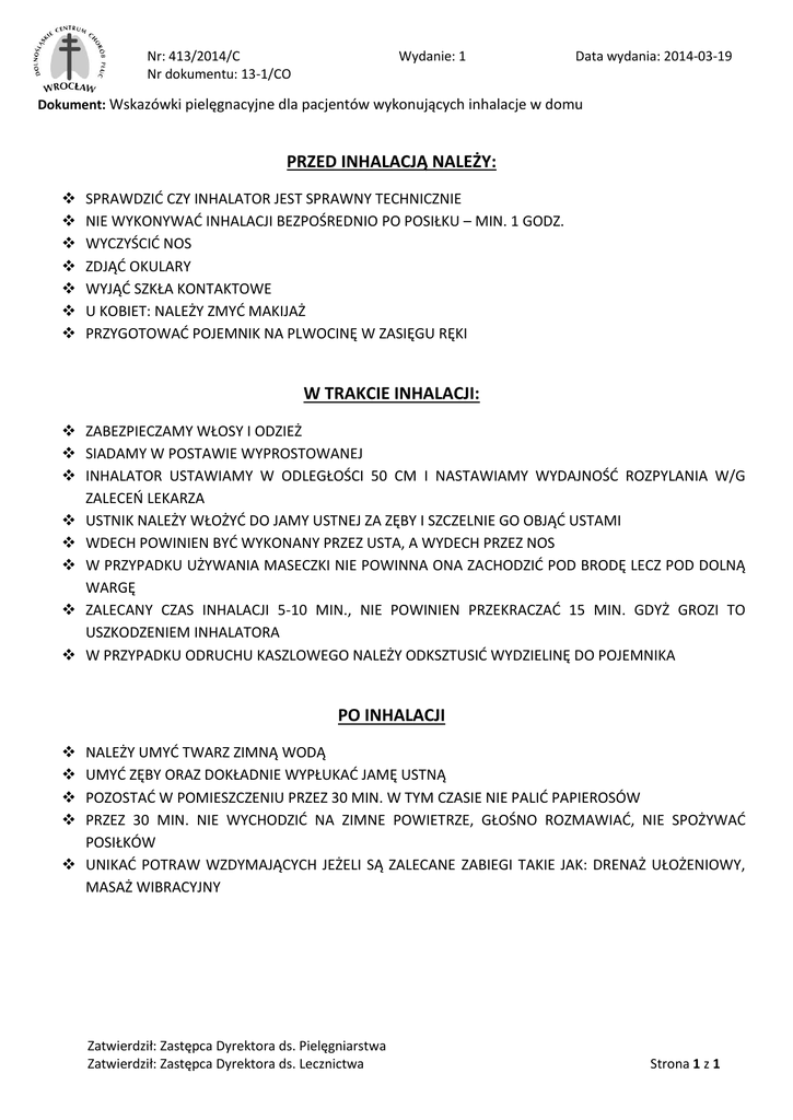 Nr: 413/2014/C Nr dokumentu: 13-1/CO Wydanie: 1 Data wydania: 2014-03-19 Dokument: Wskazówki pielęgnacyjne dla pacjentów wykonujących inhalacje w domu PRZED INHALACJĄ NALEŻY: SPRAWDZIĆ CZY INHALATOR JEST SPRAWNY TECHNICZNIE NIE WYKONYWAĆ INHALACJI BEZPOŚREDNIO PO POSIŁKU – MIN. 1 GODZ. WYCZYŚCIĆ NOS ZDJĄĆ OKULARY WYJĄĆ SZKŁA KONTAKTOWE U KOBIET: NALEŻY ZMYĆ MAKIJAŻ PRZYGOTOWAĆ POJEMNIK NA PLWOCINĘ W ZASIĘGU RĘKI W TRAKCIE INHALACJI: ZABEZPIECZAMY WŁOSY I ODZIEŻ SIADAMY W POSTAWIE WYPROSTOWANEJ INHALATOR USTAWIAMY W ODLEGŁOŚCI 50 CM I NASTAWIAMY WYDAJNOŚĆ ROZPYLANIA W/G ZALECEŃ LEKARZA USTNIK NALEŻY WŁOŻYĆ DO JAMY USTNEJ ZA ZĘBY I SZCZELNIE GO OBJĄĆ USTAMI WDECH POWINIEN BYĆ WYKONANY PRZEZ USTA, A WYDECH PRZEZ NOS W PRZYPADKU UŻYWANIA MASECZKI NIE POWINNA ONA ZACHODZIĆ POD BRODĘ LECZ POD DOLNĄ WARGĘ ZALECANY CZAS INHALACJI 5-10 MIN., NIE POWINIEN PRZEKRACZAĆ 15 MIN. GDYŻ GROZI TO USZKODZENIEM INHALATORA W PRZYPADKU ODRUCHU KASZLOWEGO NALEŻY ODKSZTUSIĆ WYDZIELINĘ DO POJEMNIKA PO INHALACJI NALEŻY UMYĆ TWARZ ZIMNĄ WODĄ UMYĆ ZĘBY ORAZ DOKŁADNIE WYPŁUKAĆ JAMĘ USTNĄ POZOSTAĆ W POMIESZCZENIU PRZEZ 30 MIN. W TYM CZASIE NIE PALIĆ PAPIEROSÓW PRZEZ 30 MIN. NIE WYCHODZIĆ NA ZIMNE POWIETRZE, GŁOŚNO ROZMAWIAĆ, NIE SPOŻYWAĆ POSIŁKÓW UNIKAĆ POTRAW WZDYMAJĄCYCH JEŻELI SĄ ZALECANE ZABIEGI TAKIE JAK: DRENAŻ UŁOŻENIOWY, MASAŻ WIBRACYJNY Zatwierdził: Zastępca Dyrektora ds. Pielęgniarstwa Zatwierdził: Zastępca Dyrektora ds. Lecznictwa Strona 1 z 1