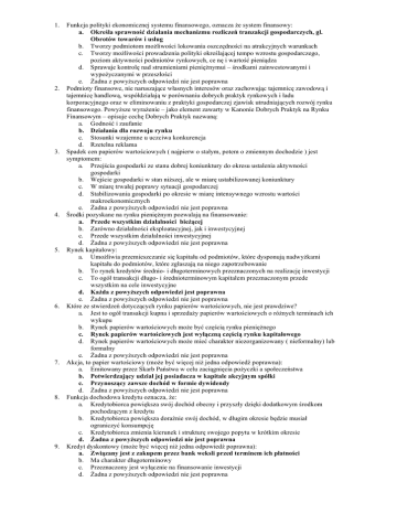 1. 2. 3. 4. 5. 6. 7. 8. 9. Funkcja polityki ekonomicznej systemu finansowego, oznacza że system finansowy: a. Określa sprawność działania mechanizmu rozliczeń tranzakcji gospodarczych, gl. Obrotów towarów i usług b. Tworzy podmiotom możliwości lokowania oszczędności na atrakcyjnych warunkach c. Tworzy możliwości prowadzenia polityki określającej tempo wzrostu gospodarczego, poziom aktywności podmiotów rynkowych, ce nę i wartość pieniądza d. Sprawuje kontrolę nad strumieniami pieniężnymui – środkami zainwestowanymi i wypożyczanymi w przeszłości e. Żadna z powyższych odpowiedzi nie jest poprawna Podmioty finansowe, nie naruszające własnych interesów oraz zachowując tajemnicę zawodową i tajemnicę handlową, współdziałają w porównaniu dobrych praktyk rynkowych i ładu korporacyjnego oraz w eliminowaniu z praktyki gospodarczej zjawisk utrudniających rozwój rynku finansowego. Powyższe wyrażenie – jako element zawarty w Kanonie Dobrych Praktyk na Rynku Finansowym – opisuje cechę Dobrych Praktyk nazwaną: a. Godność i zaufanie b. Działania dla rozwoju rynku c. Stosunki wzajemne u uczciwa konkurencja d. Rzetelna reklama Spadek cen papierów wartościowych ( najpierw o stałym, potem o zmiennym dochodzie ) jest symptomem: a. Przejścia gospodarki ze stanu dobrej koniunktury do okresu ustalenia aktywności gospodarki b. Wejście gospodarki w stan niższej, ale w miarę ustabilizowanej koniunktury c. W miarę trwałej poprawy sytuacji gospodarczej d. Stabilizowania gospodarki po okresie w miarę intensywnego wzrostu wartości makroekonomicznych e. Żadna z powyższych odpowiedzi nie jest poprawna Środki pozyskane na rynku pieniężnym pozwalają na finansowanie: a. Przede wszystkim działalności bieżącej b. Zarówno działalności eksploatacyjnej, jak i inwestycyjnej c. Przede wszystkim działalności inwestycyjnej d. Żadna z powyższych odpowiedzi nie jest poprawna Rynek kapitałowy: a. Umożliwia przemieszczanie się kapitału od podmiotów, które dysponują nadwyżkami kapitału do podmiotów, które zgłaszają na niego zapotrzebowanie b. To rynek kredytów średnio- i długoterminowych przeznaczonych na realizację inwestycji c. To ogół transakcji długo- i średnioterminowym kapitałem przeznaczonym przede wszystkim na cele inwestycyjne d. Każda z powyższych odpowiedzi jest poprawna e. Żadna z powyższych odpowiedzi nie jest poprawna Które ze stwierdzeń dotyczących rynku papierów wartościowych, nie jest prawdziwe? a. Jest to ogół transakcji kupna i sprzedaży papierów wartościowych o różnych terminach ich wykupu b. Rynek papierów wartościowych może być częścią rynku pieniężnego c. Rynek papierów wartościowych jest wyłączną częścią rynku kapitałowego d. Rynek papierów wartościowych może mieć charakter niezorganizowany ( nieformalny) lub formalny e. Żadna z powyższych odpowiedzi nie jest poprawna Akcja, to papier wartościowy (może być więcej niż jedna odpowiedź poprawna): a. Emitowany przez Skarb Państwa w celu zaciągnięcia pożyczki a społeczeństwa b. Potwierdzający udział jej posiadacza w kapitale akcyjnym spółki c. Przynoszący zawsze dochód w formie dywidendy d. Żadna z powyższych odpowiedzi nie jest poprawna Funkcja dochodowa kredytu oznacza, że: a. Kredytobiorca powiększa swój dochód obecny i przyszły dzięki dodatkowym środkom pochodzącym z kredytu b. Kredytobiorca powiększa doraźnie swój dochód, w długim okresie będzie musiał ograniczyć konsumpcję c. Kredytobiorca zmienia kierunek i strukturę swojego popytu w krótkim okresie d. Żadna z powyższych odpowiedzi nie jest poprawna Kredyt dyskontowy (może być więcej niż jedna odpowiedź poprawna): a. Związany jest z zakupem przez bank weksli przed terminem ich płatności b. Ma charakter długoterminowy c. Przeznaczony jest wyłącznie na finansowanie inwestycji d. Żadna z powyższych odpowiedzi nie jest poprawna 10. Funkcja kredytowa systemu finansowego, oznacza że system finansowy: a. umożliwia zamianę papierów wartościowych i innych aktywów na gotówkę (pieniądz) b. dostarcza kredytów dla firm, gospodarstw domowych oraz sektora publicznego na cele inwestycyjne i konsumpcyjne c. tworzy możliwości prowadzenia polityki określającej ... wzrostu gospodarczego, poziomu aktywności podmiotów rynkowych, cenę i wartość pieniądza d. sprawuje kontrolę nad strumieniami pieniężnymi – środkami zainwestowanymi, wypożyczanymi i dystrybowanymi w przeszłości e. Żadna z powyższych odpowiedzi nie jest poprawna 11. Podmiot finansowy dąży do jak najlepszego poznania potrzeb swoich klientów, w takim zakresie, w jakim może to być przydatne do dostosowania jego oferty, zakresu lub poziomu świadczonych usług do sytuacji klientów. Powyższe wyrażenie – jako element zawarty w Kanonie Dobrych Praktyk na Rynku Finansowym – opisuje cechę Dobrych Praktyk nazwaną: a. Informacje od klientów b. Stosunki wzajemne i uczciwa konkurencja c. Staranność i kompetencje d. Profilowanie usług 12. Spadek stopy przychodowości akcji i w następstwie spadek ogólnego poziomu cen towarów na rynku jest symptomem: a. Przejścia gospodarki ze stanu dobrej koniunktury do okresu osłabienia aktywności gospodarczej b. W miarę trwałej poprawy sytuacji gospodarczej c. Stabilizowania gospodarki po okresie w miarę intensywnego wzrostu wartości makroekonomicznych d. Wejście gospodarki w stan osłabienia koniunktury w gospodarce e. Żadna z powyższych odpowiedzi nie jest poprawna 13. Środki pozyskane na rynku kapitałowym przeznaczone są na finansowanie: a. Przede wszystkim działalności eksploatacyjnej b. Zarówno działalności bieżącej, jak i inwestycyjnej c. Przede wszystkim działalności inwestycyjnej d. Żadna z powyższych odpowiedzi nie jest poprawna 14. Papiery wartościowe ( może być więcej niż jedna odpowiedź poprawna): a. ...Instrument akumulacji i wprowadzenia do obrotu gospoda