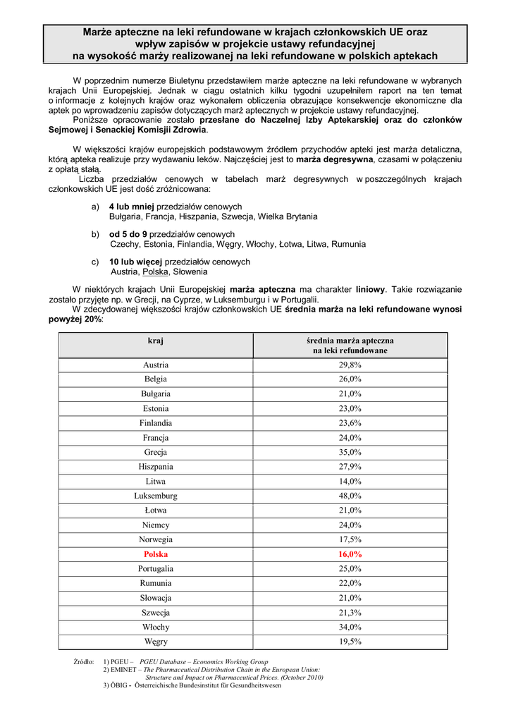Mar e apteczne na leki refundowane w krajach cz onkowskich UE oraz wp yw zapisów w projekcie ustawy refundacyjnej na wysoko mar y realizowanej na leki refundowane w polskich aptekach W poprzednim numerze Biuletynu przedstawi em mar e apteczne na leki refundowane w wybranych krajach Unii Europejskiej. Jednak w ci gu ostatnich kilku tygodni uzupe ni em raport na ten temat o informacje z kolejnych krajów oraz wykona em obliczenia obrazuj ce konsekwencje ekonomiczne dla aptek po wprowadzeniu zapisów dotycz cych mar aptecznych w projekcie ustawy refundacyjnej. Poni sze opracowanie zosta o przes ane do Naczelnej Izby Aptekarskiej oraz do cz onków Sejmowej i Senackiej Komisjii Zdrowia. W wi kszo ci krajów europejskich podstawowym ród em przychodów apteki jest mar a detaliczna, któr apteka realizuje przy wydawaniu leków. Najcz ciej jest to mar a degresywna, czasami w po czeniu z op at sta . Liczba przedzia ów cenowych w tabelach mar degresywnych w poszczególnych krajach cz onkowskich UE jest do zró nicowana: a) 4 lub mniej przedzia ów cenowych Bu garia, Francja, Hiszpania, Szwecja, Wielka Brytania b) od 5 do 9 przedzia ów cenowych Czechy, Estonia, Finlandia, W gry, W ochy, otwa, Litwa, Rumunia c) 10 lub wi cej przedzia ów cenowych Austria, Polska, S owenia W niektórych krajach Unii Europejskiej mar a apteczna ma charakter liniowy. Takie rozwi zanie zosta o przyj te np. w Grecji, na Cyprze, w Luksemburgu i w Portugalii. W zdecydowanej wi kszo ci krajów cz onkowskich UE rednia mar a na leki refundowane wynosi powy ej 20%: ród o: kraj rednia mar a apteczna na leki refundowane Austria 29,8% Belgia 26,0% Bu garia 21,0% Estonia 23,0% Finlandia 23,6% Francja 24,0% Grecja 35,0% Hiszpania 27,9% Litwa 14,0% Luksemburg 48,0% otwa 21,0% Niemcy 24,0% Norwegia 17,5% Polska 16,0% Portugalia 25,0% Rumunia 22,0% owacja 21,0% Szwecja 21,3% ochy 34,0% gry 19,5% 1) PGEU – PGEU Database – Economics Working Group 2) EMINET – The Pharmaceutical Distribution Chain in the European Union: Structure and Impact on Pharmaceutical Prices. (October 2010) 3) ÖBIG - Österreichische Bundesinstitut für Gesundheitswesen Ponadto - w wi kszo ci krajów UE - apteki uzyskuj dodatkowo rabat od hurtowni – najcz ciej na poziomie kilku procent. W Wielkiej Brytanii i w Holandii apteki musz przekaza cz rabatu uzyskanego od hurtowni do refundatora. W niektórych krajach europejskich apteka otrzymuje sta op at za wydawane leki, której towarzyszy niewielka mar a liniowa. Najcz ciej sta a op ata wynosi ok. 5,00 Euro za ka de wydane opakowanie, a mar a liniowa okre lona zosta a na poziomie 3%. Takie rozwi zanie obowi zuje od 2004r. w Niemczech i od 1 stycznia 2010r. w Belgii. Bardziej z one systemy op aty sta ej obowi zuj w Wielkiej Brytanii oraz w Danii. W najbli szym czasie system op aty sta ej zostanie wprowadzony we W oszech, prace w tym kierunku podj te te zosta y we Francji. Zast pienie mar y aptecznej przez system op aty sta ej ma wiele zalet: - uniezale nia przychody apteki od cen wydawanych leków - stymuluje wydawanie ta szych odpowiedników - sta a op ata stanowi zap at nie tylko za wydanie leku, ale równie za porady fachowe udzielane w aptece - wprowadzenie op aty sta ej umo liwia refundacj opieki farmaceutycznej w przysz ci System naliczania mar y aptecznej tylko do limitu refundacji nie jest stosowany w kraju cz onkowskim Unii Europejskiej. adnym Na wykresie poni ej przedstawione zosta o graficzne porównanie tabel aptecznych mar degresywnych obowi zuj cych w wybranych krajach Unii Europejskiej. cena hurtowa w Euro Wykres 1: Porównanie mar aptecznych w wybranych krajach UE ród o: EMINET – The Pharmaceutical Distribution Chain in the European Union: Structure and Impact on Pharmaceutical Prices. (October 2010) Analiza wykresu wskazuje wyra nie, e w grupie porównywanych krajów mar a apteczna na leki refundowane w Polsce nale y do najni szych. Dla leków o cenie hurtowej w przedziale 0 – 50 Euro mar a apteczna jest ni sza tylko na Litwie. Zawarta w projekcie ustawy refundacyjnej propozycja naliczania mar y aptecznej tylko do poziomu limitu refundacji spowoduje, e realna mar a apteczna na leki refundowane w Polsce dzie najni sza w Europie! Na podstawie zawartej w projekcie tabeli mar degresywnych oraz danych przekazanych przez IMS mo na stwierdzi , e rednia mar a na leki refundowane w Polsce spad aby do poziomu 12%. Wbrew zapowiedziom Ministerstwa Zdrowia b dzie to mia o katastrofalne skutki dla polskich aptek! Poni ej przedstawione zosta y wyliczenia spadku warto ci mar y realizowanej na leki refundowane w polskich aptekach w oparciu o dane przekazane przez IMS. apteki mar a obecna mar a do limitu ró nica Miejskie (przy ulicy, centrum handlowym) 157 625,00 z 116 337,00 z -41 288,00 z Przy o rodku zdrowia 170 057,00 z 124 628,00 z -45 428,00 z Osiedlowe 120 570,00 z 87 815,00 z -32 755,00 z Wiejskie 78 096,00 z 55 893,00 z -22 202,00 z Tabela 2: Roczna kwota mar y na leki refundowane na jedn aptek (kwoty netto w okresie od 04/2009 do 03/2010) ród o: IMS Na podstawie powy szej tabeli mo na stwierdzi , e warto mar y na leki refundowane realizowanej w ci gu roku w przeci tnej polskiej aptece wynosi obecnie oko o 130 tys. z , co daje kwot oko o 11 tys. z miesi cznie. Na kwot t sk adaj si : - mar a wynikaj ca z urz dowej tabeli mar (16%), - rabat od hurtowni na leki refundowane (przeci tnie 6 – 8%). Rabat udzielany aptekom przez hurtownie na leki refundowane stanowi istotne uzupe nienie mar y aptecznej w warunkach bardzo niskiej mar y wynikaj cej z urz dowej tabeli mar . W wielu przypadkach stanowi oko o 30% ca kowitej mar y realizowanej na leki refundowane w aptece. Projekt ustawy refundacyjnej przekazany do Sejmu Rzeczypospolitej Polskiej zawiera zapisy, które w bardzo du ym stopniu obni mar apteczn na leki refundowane w wyniku: - braku mo liwo ci uzyskania rabatu od hurtowni na leki refundowane, - naliczania mar y aptecznej tylko do limitu refundacji - na podstawie warto ci przedstawionych w ta