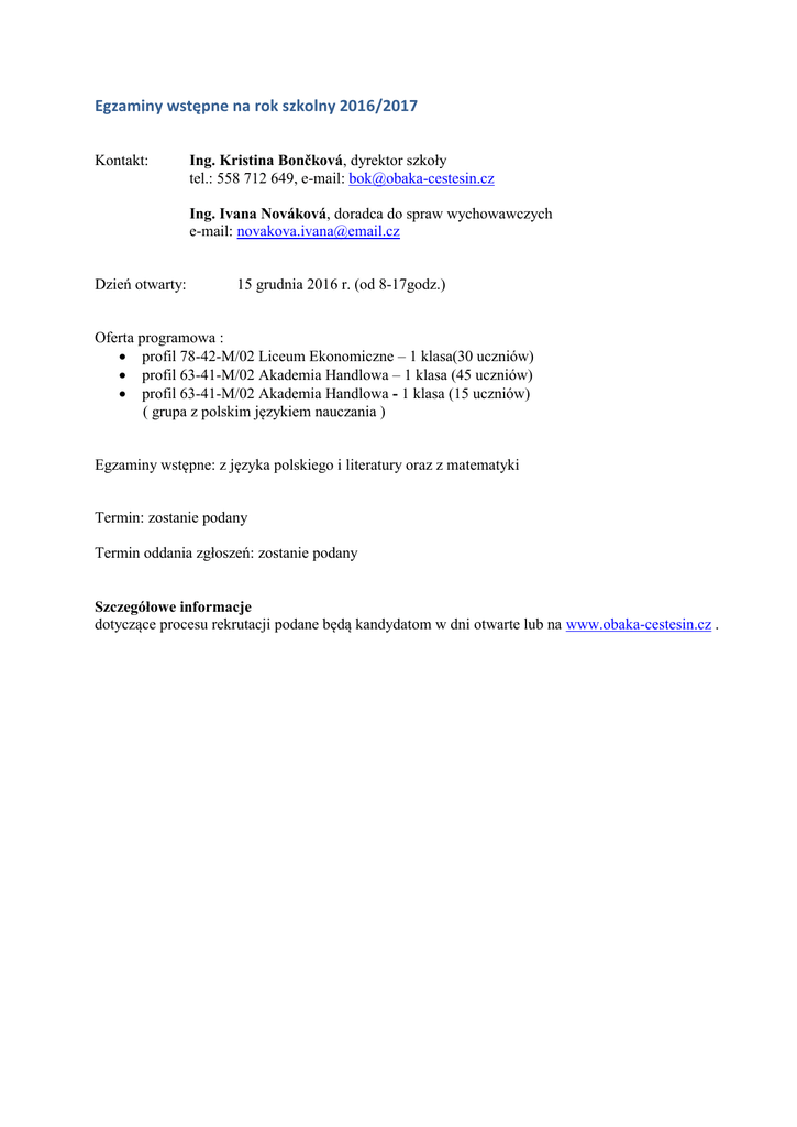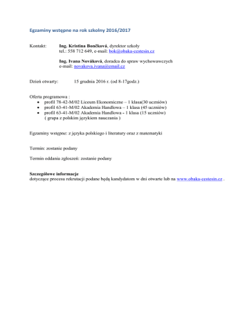 Egzaminy wstępne na rok szkolny 2016/2017 Kontakt: Ing. Kristina Bončková, dyrektor szkoły tel.: 558 712 649, e-mail: [email protected] Ing. Ivana Nováková, doradca do spraw wychowawczych e-mail: [email protected] Dzień otwarty: 15 grudnia 2016 r. (od 8-17godz.) Oferta programowa : profil 78-42-M/02 Liceum Ekonomiczne – 1 klasa(30 uczniów) profil 63-41-M/02 Akademia Handlowa – 1 klasa (45 uczniów) profil 63-41-M/02 Akademia Handlowa - 1 klasa (15 uczniów) ( grupa z polskim językiem nauczania ) Egzaminy wstępne: z języka polskiego i literatury oraz z matematyki Termin: zostanie podany Termin oddania zgłoszeń: zostanie podany Szczegółowe informacje dotyczące procesu rekrutacji podane będą kandydatom w dni otwarte lub na www.obaka-cestesin.cz .