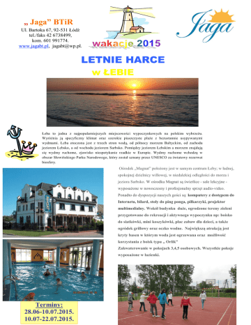„ Jaga” BTiR Ul. Bartoka 67, 92-531 Łódź tel./faks 42 6738499, kom. 601 991774. www.jagabt.pl, [email protected]. LETNIE HARCE w ŁEBIE Łeba to jedna z najpopularniejszych miejscowości wypoczynkowych na polskim wybrzeżu. Wyróżnia ją specyficzny klimat oraz szerokie piaszczyste plaże z bezustannie usypywanymi wydmami. Łeba otoczona jest z trzech stron wodą, od północy morzem Bałtyckim, od zachodu jeziorem Łebsko, a od wschodu jeziorem Sarbsko. Pomiędzy jeziorem Łebskim a morzem znajdują się wydmy ruchome, zjawisko niespotykanie rzadkie w Europie. Wydmy ruchome wchodzą w obszar Słowińskiego Parku Narodowego, który został uznany przez UNESCO za światowy rezerwat biosfery. Ośrodek „Magnat” położony jest w samym centrum Łeby; w ładnej, spokojnej dzielnicy willowej, w niedalekiej odległości do morza i jeziora Sarbsko. W ośrodku Magnat są świetlice - sale lekcyjne wyposażone w nowoczesny i profesjonalny sprzęt audio-video. Ponadto do dyspozycji naszych gości są: komputery z dostępem do Internetu, bilard, stoły do ping ponga, piłkarzyki, projektor multimedialny. Wokół budynku duże, ogrodzone tereny zieleni przygotowane do rekreacji i aktywnego wypoczynku np: boisko do siatkówki, mini koszykówki, plac zabaw dla dzieci, a także ogródek grillowy oraz oczko wodne. Największą atrakcją jest kryty basen w którym woda jest ogrzewana oraz możliwość korzystania z boisk typu „ Orlik” Zakwaterowanie w pokojach 3,4,5 osobowych. Wszystkie pokoje wyposażone w łazienki. Terminy: 28.06-10.07.2015. 10.07-22.07.2015. PROGRAM. Dzień 1. Zbiórka na parkingu przy RTS Widzew o godz. 8.00 . Wyjazd o godz. 8.30. Przyjazd do Łeby. Zakwaterowanie. Obiadokolacja. Dzień 2 – 12. W trakcie pobytu m.in. kąpiele i plażowanie, gry, zabawy, dyskoteki, animacje oraz udział w imprezach plenerowych i rekreacyjno – sportowych. Rozgrywki w piłkę nożną, siatkową, tenisa stołowego. Ponadto w trakcie pobytu: - Skansen Kluki - prawdziwa perła kultury słowińskiej, na terenie której mieści się skansen. Zwiedzimy tu chałupy i zagrody rybackie z okresów XIX oraz przełomu XIX i XX wieku. Wspaniałe domostwa wyposażone w oryginalne sprzęty i narzędzia ulokowane zostały na planie ulicowym osady z końca XVIII wieku. W sezonie letnim natrafić można na liczne imprezy folklorystyczne, skosztować lokalnych specjałów kuchni kaszubskiej, w tym jedynego w swoim rodzaju chleba słowińskiego, oraz posłuchać muzyki i śpiewów zespołów ludowych - Labirynt Park Łeba. Świetna zabawa dla dużych i małych, dla rodzin z dziećmi jak i zakochanych par. Szukajcie prawidłowej drogi, zdobywajcie bazy, odkrywajcie przygotowane przez nas atrakcje. Dla najmłodszych posiadamy specjalne drewniane wózki, by zabawa była dla nich jeszcze wspanialsza. Sprawdźcie swoją orientację w terenie o powierzchni 5000m2, porównajcie czas przejścia labiryntu z innymi./www.labiryntparkleba.pl/ - Przejazd do największego w Polsce parku dinozaurów. Spotkamy modele dinozaurów i wymarłych ssaków takich jak mamuty czy tygrysy szablozębne. Oprócz prehistorycznych zwierząt poznamy życie jaskiniowców. - Wycieczka do Fokarium - Sea Park w Sarbsku, jedynego w Polsce park związanego tematycznie z fauną i florą mórz i oceanów. Obejrzymy karmienie fok połączone z ich treningiem . Poza fokarium, muzeum marynistycznym i oceanarium w parku zobaczymy również makiety zwierząt morskich w naturalnych rozmiarach. Gwarantowana moc atrakcji! Dzień 13. Śniadanie. Pobranie prowiantu. Przejazd na trasie Łeba- Łódź. Przyjazd na miejsce zbiórki około godz. 17.00. Zakończenie imprezy. 1.Zakwaterowanie w Ośrodku Wypoczynkowym „ Magnat” w Łebie. 2.Wyżywienie ( śniadanie - bufet obiad, kolacja- bufet, podwieczorek). Prowiant na wycieczki autokarowe. Prowiant na drogę powrotną. 3.Transport autokarem 4.Ubezpieczenie NNW. 5.Możliwość , boiska sportowego, , stołów bilardowych i do tenisa stołowego, sal ze sprzętem TV i dyskotekowym. 6.Opiekę wykwalifikowanej kadry pedagogicznej, ratownika i pielęgniarki. 7.Realizację ciekawego programu. 8.Wycieczki jak w programie, gry, zabawy, dyskoteki. Wstępy w cenie imprezy. „Jaga” Biuro Turystyki i Rekreacji Łódź, ul. Bartoka 67, tel./faks 042 6738499, kom. 601 991774. www.jagabt.pl, [email protected]. Koszt skierowania: 1550 zł