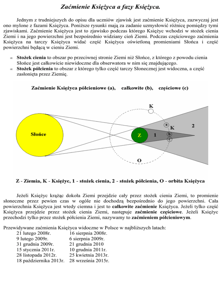 Zaćmienie KsięŜyca a fazy KsięŜyca. Jednym z trudniejszych do opisu dla uczniów zjawisk jest zaćmienie KsięŜyca, zazwyczaj jest ono mylone z fazami KsięŜyca. PoniŜsze rysunki mają za zadanie uzmysłowić róŜnicę pomiędzy tymi zjawiskami. Zaćmienie KsięŜyca jest to zjawisko podczas którego KsięŜyc wchodzi w stoŜek cienia Ziemi i na jego powierzchni jest bezpośrednio widziany cień Ziemi. Podczas częściowego zaćmienia KsięŜyca na tarczy KsięŜyca widać część KsięŜyca oświetloną promieniami Słońca i część powierzchni będącą w cieniu Ziemi. • • StoŜek cienia to obszar po przeciwnej stronie Ziemi niŜ Słońce, z którego z powodu cienia Słońce jest całkowicie niewidoczne dla obserwatora w nim się znajdującego. StoŜek półcienia to obszar z którego tylko część tarczy Słonecznej jest widoczna, a część zasłonięta przez Ziemię. JeŜeli KsięŜyc krąŜąc dokoła Ziemi przejdzie cały przez stoŜek cienia Ziemi, to promienie słoneczne przez pewien czas w ogóle nie dochodzą bezpośrednio do jego powierzchni. Cała powierzchnia KsięŜyca jest wtedy ciemna i jest to całkowite zaćmienie KsięŜyca. JeŜeli tylko część KsięŜyca przejdzie przez stoŜek cienia Ziemi, następuje zaćmienie częściowe. JeŜeli KsięŜyc przechodzi tylko przez stoŜek półcienia Ziemi, nazywamy to zaćmieniem półcieniowym. Przewidywane zaćmienia KsięŜyca widoczne w Polsce w najbliŜszych latach: 21 lutego 2008r. 16 sierpnia 2008r. 9 lutego 2009r. 6 sierpnia 2009r. 31 grudnia 2009r. 21 grudnia 2010 15 stycznia 2011r. 10 grudnia 2011r. 28 listopada 2012r. 25 kwietnia 2013r. 18 października 2013r. 28 września 2015r. Fazy KsięŜyca ( http://www.moonphaseinfo.com warto obejrzeć.) Fazy KsięŜyca opisują oglądany z Ziemi fragment KsięŜyca oświetlony przez Słońce. PoniewaŜ Słońce oświetla zawsze tylko połowę powierzchni KsięŜyca (dzień i noc na KsięŜycu), jego fazy są wynikiem oglądania tej oświetlonej połowy pod róŜnymi kątami (z Ziemi). Spowodowane jest to róŜnym połoŜeniem Ziemi, KsięŜyca i Słońca względem siebie. nów (1) obszar KsięŜyca widoczny z Ziemi nie jest oświetlony, pierwsza kwadra (3) oświetlona jest połowa tarczy KsięŜyca, pełnia (5) obszar KsięŜyca widoczny z Ziemi jest cały oświetlony ostatnia kwadra (7) oświetlona jest połowa tarczy KsięŜyca, Cykl zmian faz KsięŜyca trwa około 29,5 doby jest to tzw. miesiąc synodyczny. Opracowanie i rysunki: Dariusz Kruk