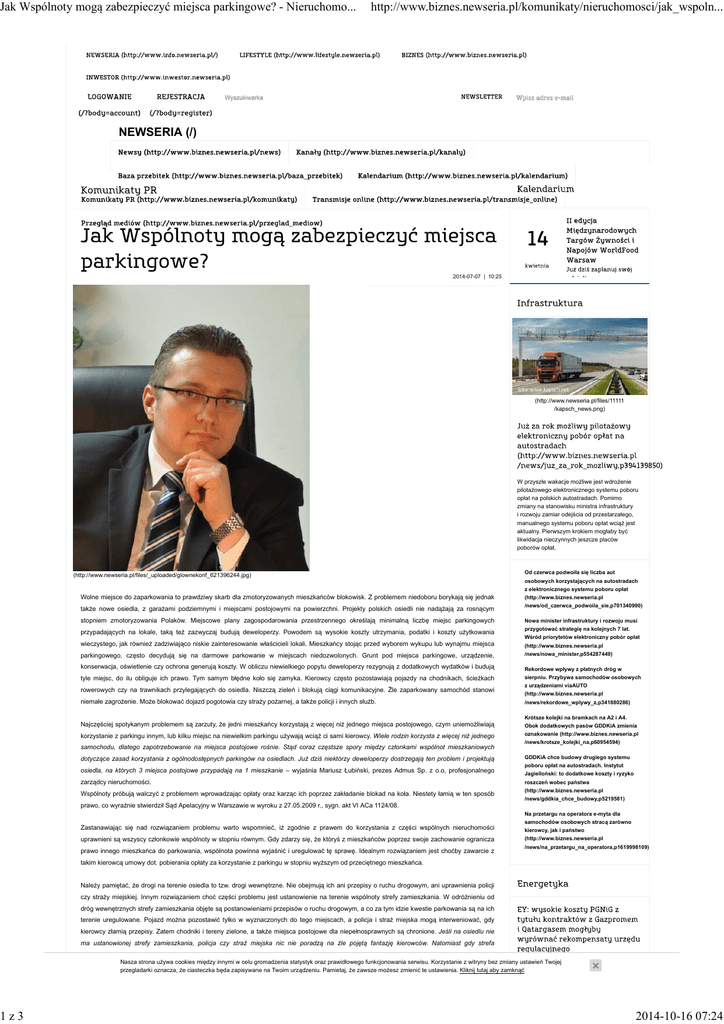 Jak Wspólnoty mogą zabezpieczyć miejsca parkingowe? - Nieruchomo... 1z3 http://www.biznes.newseria.pl/komunikaty/nieruchomosci/jak_wspoln... NEWSERIA (/) 2014-07-07 | 10:25 (http://www.newseria.pl/files/11111 /kapsch_news.png) W przyszłe wakacje możliwe jest wdrożenie pilotażowego elektronicznego systemu poboru opłat na polskich autostradach. Pomimo zmiany na stanowisku ministra infrastruktury i rozwoju zamiar odejścia od przestarzałego, manualnego systemu poboru opłat wciąż jest aktualny. Pierwszym krokiem mogłaby być likwidacja nieczynnych jeszcze placów poborów opłat. (http://www.newseria.pl/files/_uploaded/glownekonf_621396244.jpg) Od czerwca podwoiła się liczba aut osobowych korzystających na autostradach z elektronicznego systemu poboru opłat Wolne miejsce do zaparkowania to prawdziwy skarb dla zmotoryzowanych mieszkańców blokowisk. Z problemem niedoboru borykają się jednak także nowe osiedla, z garażami podziemnymi i miejscami postojowymi na powierzchni. Projekty polskich osiedli nie nadążają za rosnącym (http://www.biznes.newseria.pl /news/od_czerwca_podwoila_sie,p701340990) stopniem zmotoryzowania Polaków. Miejscowe plany zagospodarowania przestrzennego określają minimalną liczbę miejsc parkingowych Nowa minister infrastruktury i rozwoju musi przypadających na lokale, taką też zazwyczaj budują deweloperzy. Powodem są wysokie koszty utrzymania, podatki i koszty użytkowania przygotować strategię na kolejnych 7 lat. wieczystego, jak również zadziwiająco niskie zainteresowanie właścicieli lokali. Mieszkańcy stojąc przed wyborem wykupu lub wynajmu miejsca (http://www.biznes.newseria.pl Wśród priorytetów elektroniczny pobór opłat parkingowego, często decydują się na darmowe parkowanie w miejscach niedozwolonych. Grunt pod miejsca parkingowe, urządzenie, /news/nowa_minister,p554287449) konserwacja, oświetlenie czy ochrona generują koszty. W obliczu niewielkiego popytu deweloperzy rezygnują z dodatkowych wydatków i budują Rekordowe wpływy z płatnych dróg w tyle miejsc, do ilu obliguje ich prawo. Tym samym błędne koło się zamyka. Kierowcy często pozostawiają pojazdy na chodnikach, ścieżkach sierpniu. Przybywa samochodów osobowych rowerowych czy na trawnikach przylegających do osiedla. Niszczą zieleń i blokują ciągi komunikacyjne. Źle zaparkowany samochód stanowi niemałe zagrożenie. Może blokować dojazd pogotowia czy straży pożarnej, a także policji i innych służb. z urządzeniami viaAUTO (http://www.biznes.newseria.pl /news/rekordowe_wplywy_z,p341880286) Krótsze kolejki na bramkach na A2 i A4. Najczęściej spotykanym problemem są zarzuty, że jedni mieszkańcy korzystają z więcej niż jednego miejsca postojowego, czym uniemożliwiają Obok dodatkowych pasów GDDKiA zmienia korzystanie z parkingu innym, lub kilku miejsc na niewielkim parkingu używają wciąż ci sami kierowcy. Wiele rodzin korzysta z więcej niż jednego oznakowanie (http://www.biznes.newseria.pl samochodu, dlatego zapotrzebowanie na miejsca postojowe rośnie. Stąd coraz częstsze spory między członkami wspólnot mieszkaniowych dotyczące zasad korzystania z ogólnodostępnych parkingów na osiedlach. Już dziś niektórzy deweloperzy dostrzegają ten problem i projektują osiedla, na których 3 miejsca postojowe przypadają na 1 mieszkanie – wyjaśnia Mariusz Łubiński, prezes Admus Sp. z o.o, profesjonalnego /news/krotsze_kolejki_na,p60954594) GDDKiA chce budowy drugiego systemu poboru opłat na autostradach. Instytut Jagielloński: to dodatkowe koszty i ryzyko zarządcy nieruchomości. roszczeń wobec państwa Wspólnoty próbują walczyć z problemem wprowadzając opłaty oraz karząc ich poprzez zakładanie blokad na koła. Niestety łamią w ten sposób (http://www.biznes.newseria.pl prawo, co wyraźnie stwierdził Sąd Apelacyjny w Warszawie w wyroku z 27.05.2009 r., sygn. akt VI ACa 1124/08. /news/gddkia_chce_budowy,p5219581) Na przetargu na operatora e-myta dla Zastanawiając się nad rozwiązaniem problemu warto wspomnieć, iż zgodnie z prawem do korzystania z części wspólnych nieruchomości uprawnieni są wszyscy członkowie wspólnoty w stopniu równym. Gdy zdarzy się, że któryś z mieszkańców poprzez swoje zachowanie ogranicza prawo innego mieszkańca do parkowania, wspólnota powinna wyjaśnić i uregulować tę sprawę. Idealnym rozwiązaniem jest choćby zawarcie z samochodów osobowych stracą zarówno kierowcy, jak i państwo (http://www.biznes.newseria.pl /news/na_przetargu_na_operatora,p1619998109) takim kierowcą umowy dot. pobierania opłaty za korzystanie z parkingu w stopniu wyższym od przeciętnego mieszkańca. Należy pamiętać, że drogi na terenie osiedla to tzw. drogi wewnętrzne. Nie obejmują ich ani przepisy o ruchu drogowym, ani uprawnienia policji czy straży miejskiej. Innym rozwiązaniem choć części problemu jest ustanowienie na terenie wspólnoty strefy zamieszkania. W odróżnieniu od dróg wewnętrznych strefy zamieszkania objęte są postanowieniami przepisów o ruchu drogowym, a co za tym idzie kwestie parkowania są na ich terenie uregulowane. Pojazd można pozostawić tylko w wyznaczonych do tego miejscach, a policja i straż miejska mogą interweniować, gdy kierowcy złamią przepisy. Zatem chodniki i tereny zielone, a także miejsca postojowe dla niepełnosprawnych są chronione. Jeśli na osiedlu nie ma ustanowionej strefy zamieszkania, policja czy straż miejska nic nie poradzą na źle pojętą fantazję kierowców. Natomiast gdy strefa zamieszkania jest ustanowiona, korzyści odczuwają nie tylko kierowcy, lecz także piesi, gdyż w strefie obowiązuje ograniczenie prędkości do 20 Nasza strona używa cookies między innymi w celu gromadzenia statystyk oraz prawidłowego funkcjonowania serwisu. Korzystanie z witryny bez zmiany ustawień Twojej przegladarki oznacza, że ciasteczka będa zapisywane na Twoim urządzeniu. Pamietaj, że zawsze możesz zmieni