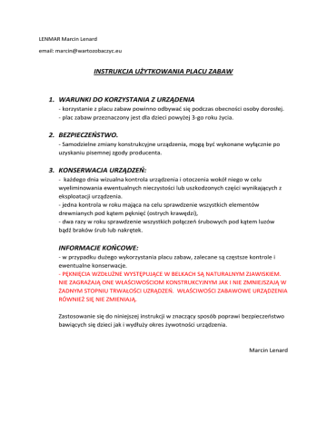 LENMAR Marcin Lenard email: [email protected] INSTRUKCJA UŻYTKOWANIA PLACU ZABAW 1. WARUNKI DO KORZYSTANIA Z URZĄDENIA - korzystanie z placu zabaw powinno odbywać się podczas obecności osoby dorosłej. - plac zabaw przeznaczony jest dla dzieci powyżej 3-go roku życia. 2. BEZPIECZEŃSTWO. - Samodzielne zmiany konstrukcyjne urządzenia, mogą być wykonane wyłącznie po uzyskaniu pisemnej zgody producenta. 3. KONSERWACJA URZĄDZEŃ: - każdego dnia wizualna kontrola urządzenia i otoczenia wokół niego w celu wyeliminowania ewentualnych nieczystości lub uszkodzonych części wynikających z eksploatacji urządzenia. - jedna kontrola w roku mająca na celu sprawdzenie wszystkich elementów drewnianych pod kątem pęknięć (ostrych krawędzi), - dwa razy w roku sprawdzenie wszystkich połączeń śrubowych pod kątem luzów bądź braków śrub lub nakrętek. INFORMACJE KOŃCOWE: - w przypadku dużego wykorzystania placu zabaw, zalecane są częstsze kontrole i ewentualne konserwacje. - PĘKNIĘCIA WZDŁUŻNE WYSTĘPUJĄCE W BELKACH SĄ NATURALNYM ZJAWISKIEM. NIE ZAGRAŻAJĄ ONE WŁAŚCIWOŚCIOM KONSTRUKCYJNYM JAK I NIE ZMNIEJSZAJĄ W ŻADNYM STOPNIU TRWAŁOŚCI UZRĄDZEŃ. WŁAŚCIWOŚCI ZABAWOWE URZĄDZENIA RÓWNIEŻ SIĘ NIE ZMIENIAJĄ. Zastosowanie się do niniejszej instrukcji w znaczący sposób poprawi bezpieczeństwo bawiących się dzieci jak i wydłuży okres żywotności urządzenia. Marcin Lenard