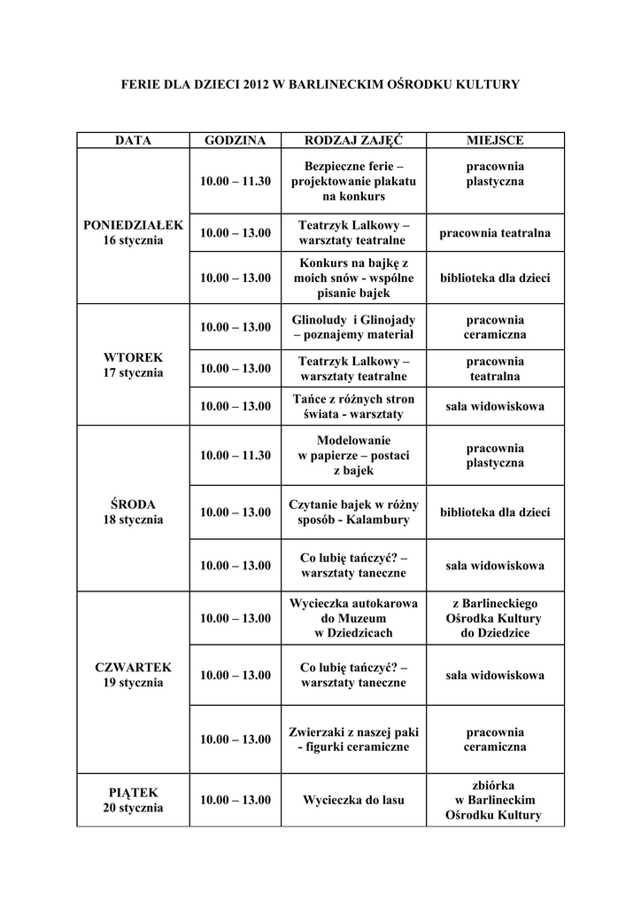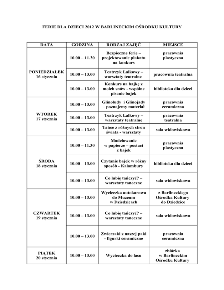 FERIE DLA DZIECI 2012 W BARLINECKIM OŚRODKU KULTURY DATA PONIEDZIAŁEK 16 stycznia WTOREK 17 stycznia ŚRODA 18 stycznia CZWARTEK 19 stycznia PIĄTEK 20 stycznia GODZINA RODZAJ ZAJĘĆ MIEJSCE 10.00 – 11.30 Bezpieczne ferie – projektowanie plakatu na konkurs pracownia plastyczna 10.00 – 13.00 Teatrzyk Lalkowy – warsztaty teatralne pracownia teatralna 10.00 – 13.00 Konkurs na bajkę z moich snów - wspólne pisanie bajek biblioteka dla dzieci 10.00 – 13.00 Glinoludy i Glinojady – poznajemy materiał pracownia ceramiczna 10.00 – 13.00 Teatrzyk Lalkowy – warsztaty teatralne pracownia teatralna 10.00 – 13.00 Tańce z różnych stron świata - warsztaty sala widowiskowa 10.00 – 11.30 Modelowanie w papierze – postaci z bajek pracownia plastyczna 10.00 – 13.00 Czytanie bajek w różny sposób - Kalambury biblioteka dla dzieci 10.00 – 13.00 Co lubię tańczyć? – warsztaty taneczne sala widowiskowa 10.00 – 13.00 Wycieczka autokarowa do Muzeum w Dziedzicach z Barlineckiego Ośrodka Kultury do Dziedzice 10.00 – 13.00 Co lubię tańczyć? – warsztaty taneczne sala widowiskowa 10.00 – 13.00 Zwierzaki z naszej paki - figurki ceramiczne pracownia ceramiczna 10.00 – 13.00 Wycieczka do lasu zbiórka w Barlineckim Ośrodku Kultury 10.00 – 12.00 PONIEDZIAŁEK 23 stycznia 10.00 – 12.00 12.00 – 13.00 10.00 – 11.30 WTOREK 24 stycznia 10.00 – 11.30 PIĄTEK 27 stycznia biblioteka dla dzieci sala widowiskowa pracownia ceramiczna sala widowiskowa Autorzy naszych bajek biblioteka dla dzieci 11.30 – 13.00 Ferie z kinem sala widowiskowa 10.00 – 11.30 CZWARTEK 26 STYCZNIA Czytanie bajek – rozstrzygnięcie konkursu na bajkę, gry świetlicowe Teatr Żywych Lalekpołączenie teatru i tańca Naczynia kręcone z wałeczków Mikrofon dla każdego sala widowiskowa 10.00 – 11.30 10.00 – 11.30 ŚRODA 25 stycznia Spotkanie z OTOZ Animals konkurs Bezpieczne ferie – wykonanie plakatu na konkurs Mini Playback Show pracownia plastyczna sala konferencyjna 11.30 – 13.00 Śpiewać każdy może sala konferencyjna 11.30 – 13.00 Pogaduchy o ulubionych książkach biblioteka dla dzieci 10.00 – 13.00 Wycieczka autokarowa do Izby Przyrodniczej Nadleśnictwa Barlinek okolice Okna 10.00 – 11.30 Piszemy bajkę biblioteka dla dzieci 10.00 – 11.30 Tańczyć każdy może sala widowiskowa 10.00 – 11.30 Warsztaty stylistyki i projektowania kostiumów pracownia teatralna 11.30 – 13.00 Ferie z kinem sala widowiskowa 10.00 – 11.30 Kim chciałbym być i dlaczego – na podst. przeczytanych lektur 10.00 – 11.30 Przygotowujemy swoją prezentację i stroje na Bal Przebierańców biblioteka dla dzieci pracownia teatralna 11.30 – 13.00 Bal Przebierańców oraz wyniki konkursu plastycznego kawiarnia
