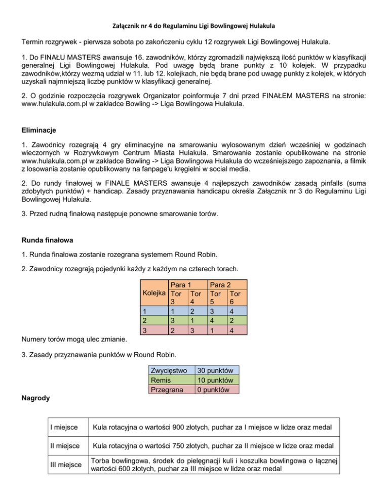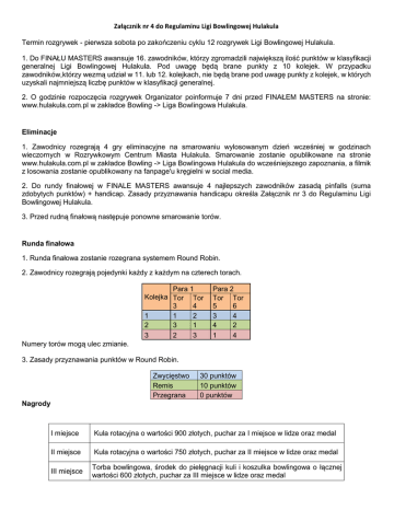 Załącznik nr 4 do Regulaminu Ligi Bowlingowej Hulakula Termin rozgrywek - pierwsza sobota po zakończeniu cyklu 12 rozgrywek Ligi Bowlingowej Hulakula. 1. Do FINAŁU MASTERS awansuje 16. zawodników, którzy zgromadzili największą ilość punktów w klasyfikacji generalnej Ligi Bowlingowej Hulakula. Pod uwagę będą brane punkty z 10 kolejek. W przypadku zawodników,którzy wezmą udział w 11. lub 12. kolejkach, nie będą brane pod uwagę punkty z kolejek, w których uzyskali najmniejszą liczbę punktów w klasyfikacji generalnej. 2. O godzinie rozpoczęcia rozgrywek Organizator poinformuje 7 dni przed FINAŁEM MASTERS na stronie: www.hulakula.com.pl w zakładce Bowling -> Liga Bowlingowa Hulakula. Eliminacje 1. Zawodnicy rozegrają 4 gry eliminacyjne na smarowaniu wylosowanym dzień wcześniej w godzinach wieczornych w Rozrywkowym Centrum Miasta Hulakula. Smarowanie zostanie opublikowane na stronie www.hulakula.com.pl w zakładce Bowling -> Liga Bowlingowa Hulakula do wcześniejszego zapoznania, a filmik z losowania zostanie opublikowany na fanpage'u kręgielni w social media. 2. Do rundy finałowej w FINALE MASTERS awansuje 4 najlepszych zawodników zasadą pinfalls (suma zdobytych punktów) + handicap. Zasady przyznawania handicapu określa Załącznik nr 3 do Regulaminu Ligi Bowlingowej Hulakula. 3. Przed rudną finałową następuje ponowne smarowanie torów. Runda finałowa 1. Runda finałowa zostanie rozegrana systemem Round Robin. 2. Zawodnicy rozegrają pojedynki każdy z każdym na czterech torach. Para 1 Kolejka Tor Tor 3 4 1 1 2 2 3 1 3 2 3 Para 2 Tor Tor 5 6 3 4 4 2 1 4 Numery torów mogą ulec zmianie. 3. Zasady przyznawania punktów w Round Robin. Zwycięstwo Remis Przegrana 30 punktów 10 punktów 0 punktów Nagrody I miejsce Kula rotacyjna o wartości 900 złotych, puchar za I miejsce w lidze oraz medal II miejsce Kula rotacyjna o wartości 750 złotych, puchar za II miejsce w lidze oraz medal III miejsce Torba bowlingowa, środek do pielęgnacji kuli i koszulka bowlingowa o łącznej wartości 600 złotych, puchar za III miejsce w lidze oraz medal