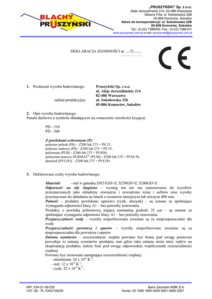 „PRUSZYŃSKI" Sp. z o.o. Aleje Jerozolimskie 214, 02-486 Warszawa Główna Filia: ul. Sokołowska 32B 05-806 Komorów, Sokołów Adres do korespondencji: ul. Sokołowska 32B 05-806 Komorów, Sokołów Tel.: (0-22) 7386000, Fax.: (0-22) 7386101 www.pruszynski.com.pl e-mail: [email protected] DEKLARACJA ZGODNOŚCI nr ..../3/....... miesiąc/ nr / rok 1. Producent wyrobu budowlanego: zakład produkcyjny: Pruszyński Sp. z o.o. ul. Aleje Jerozolimskie 214 02-486 Warszawa ul. Sokołowska 32b 05-806 Komorów, Sokołów 2. Opis wyrobu budowlanego: Panele dachowe o symbolu składającym się oznaczenia szerokości kryjącej: PD - 510 PD - 300 Z powłokami ochronnym (P): poliester połysk (PS) – Z200 lub 275 + PS 25, poliester matowy (PS) - Z200 lub 275 + PS 35, poliuretan (PUR) - Z200 lub 275 + PUR50, poliuretan matowy PURMAT® (PUM) - Z200 lub 275 + PUM 50, plastisol (PVC(P)) – Z200 lub 275 + PVC(P) 3. Deklarowane cechy wyrobu budowlanego: Materiał: - stal w gatunku DX51GD+Z; S250GD+Z; S280GD+Z Odporność na siły skupione – wymóg ten nie ma zastosowania do wyrobów przeznaczonych jako okładziny zewnętrze i zewnętrzne ścian i sufitów oraz wyroby przeznaczone do układania na łatach o rozstawie mniejszym lub równym 400 mm. Palność – produkty powlekane ogniowo (cynk, aluzynk) – są uznane za spełniające wymagania odporności klasy A1 – bez potrzeby testowania. Produkty z powłoką poliestrową mającą nominalną grubość 25 µ m – są uznane za spełniające wymagania odporności klasy A1 – bez potrzeby testowania. Przepuszczalność wody – wyroby nieperforowane uważane są za nieprzepuszczalne dla wody Przepuszczalność powietrza i oparów – wyroby nieperforowane uważane są za nieprzepuszczalne dla powietrza i oparów Zmiana wymiarów – rozszerzalność cieplna powinna być brana pod uwagę ponieważ powoduje to zmianę wymiarów produktu, tam gdzie taka zmiana może mieć wpływ na eksploatację produktu, należy brać pod uwagę odpowiednie współczynnik rozszerzalności cieplnej. Powinny być stosowane następujące rozszerzalności cieplnej: - aluminium: 24 x 10-6 K-1; - stal: 12 x 10-6 K-1; - cynk: 22 x 10-6 K-1; NIP: 534-21-39-235 VAT UE : PL 5342139235 Bank Zachodni WBK S.A. Konto: 03 1090 1694 0000 0001 0060 5307 „PRUSZYŃSKI" Sp. z o.o. Aleje Jerozolimskie 214, 02-486 Warszawa Główna Filia: ul. Sokołowska 32B 05-806 Komorów, Sokołów Adres do korespondencji: ul. Sokołowska 32B 05-806 Komorów, Sokołów Tel.: (0-22) 7386000, Fax.: (0-22) 7386101 www.pruszynski.com.pl e-mail: [email protected] 4. Przeznaczenie i zakres stosowania: Panele wymienione w pkt. 2 niniejszej deklaracji mogą być stosowane do pokryć dachów o pochyleniu nie mniejszym niż 8o (14%) w budynkach zlokalizowanych w środowiskach korozyjności atmosfery C1, C2 i C3 wg PN-EN ISO 12944-2:2001. Zastosowanie i sposób wykonania pokryć z powyższych blachodachówek powinien być zgodne z projektami technicznymi budynków, opracowanymi z uwzględnieniem obowiązujących norm i przepisów techniczno-budowlanych, postanowień przedmiotowej normy PN-EN 14782 oraz zaleceń montażowych producenta blach dachówkowych. 5. Specyfikacja techniczna: PN-EN 14782:2008 Deklaruję z pełną odpowiedzialnością, że wyrób budowlany jest zgodny ze specyfikacją techniczną w pkt 5. Sokołów, ---------------------------------------(miejsce i data wystawienia) NIP: 534-21-39-235 VAT UE : PL 5342139235 --------------------------------------------------------------(imię, nazwisko i podpis osoby upoważnionej) Bank Zachodni WBK S.A. Konto: 03 1090 1694 0000 0001 0060 5307