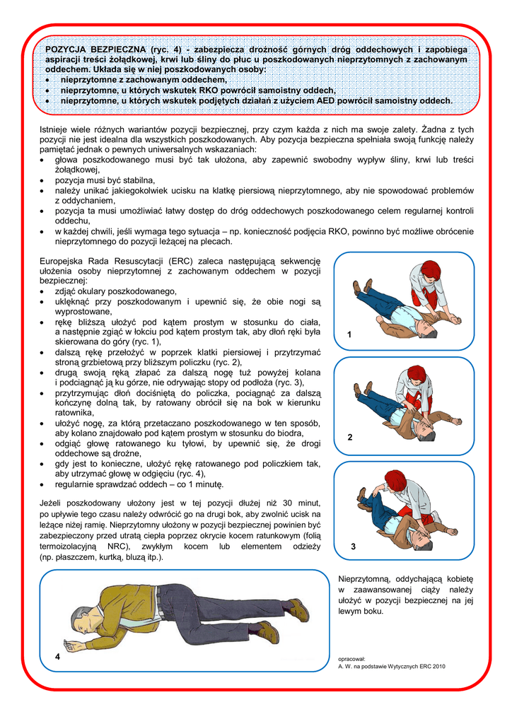 POZYCJA BEZPIECZNA (ryc. 4) - zabezpiecza drożność górnych dróg oddechowych i zapobiega aspiracji treści żołądkowej, krwi lub śliny do płuc u poszkodowanych nieprzytomnych z zachowanym oddechem. Układa się w niej poszkodowanych osoby: nieprzytomne z zachowanym oddechem, nieprzytomne, u których wskutek RKO powrócił samoistny oddech, nieprzytomne, u których wskutek podjętych działań z użyciem AED powrócił samoistny oddech. Istnieje wiele różnych wariantów pozycji bezpiecznej, przy czym każda z nich ma swoje zalety. Żadna z tych pozycji nie jest idealna dla wszystkich poszkodowanych. Aby pozycja bezpieczna spełniała swoją funkcję należy pamiętać jednak o pewnych uniwersalnych wskazaniach: głowa poszkodowanego musi być tak ułożona, aby zapewnić swobodny wypływ śliny, krwi lub treści żołądkowej, pozycja musi być stabilna, należy unikać jakiegokolwiek ucisku na klatkę piersiową nieprzytomnego, aby nie spowodować problemów z oddychaniem, pozycja ta musi umożliwiać łatwy dostęp do dróg oddechowych poszkodowanego celem regularnej kontroli oddechu, w każdej chwili, jeśli wymaga tego sytuacja – np. konieczność podjęcia RKO, powinno być możliwe obrócenie nieprzytomnego do pozycji leżącej na plecach. Europejska Rada Resuscytacji (ERC) zaleca następującą sekwencję ułożenia osoby nieprzytomnej z zachowanym oddechem w pozycji bezpiecznej: zdjąć okulary poszkodowanego, uklęknąć przy poszkodowanym i upewnić się, że obie nogi są wyprostowane, rękę bliższą ułożyć pod kątem prostym w stosunku do ciała, a następnie zgiąć w łokciu pod kątem prostym tak, aby dłoń ręki była skierowana do góry (ryc. 1), dalszą rękę przełożyć w poprzek klatki piersiowej i przytrzymać stroną grzbietową przy bliższym policzku (ryc. 2), drugą swoją ręką złapać za dalszą nogę tuż powyżej kolana i podciągnąć ją ku górze, nie odrywając stopy od podłoża (ryc. 3), przytrzymując dłoń dociśniętą do policzka, pociągnąć za dalszą kończynę dolną tak, by ratowany obrócił się na bok w kierunku ratownika, ułożyć nogę, za którą przetaczano poszkodowanego w ten sposób, aby kolano znajdowało pod kątem prostym w stosunku do biodra, odgiąć głowę ratowanego ku tyłowi, by upewnić się, że drogi oddechowe są drożne, gdy jest to konieczne, ułożyć rękę ratowanego pod policzkiem tak, aby utrzymać głowę w odgięciu (ryc. 4), regularnie sprawdzać oddech – co 1 minutę. Jeżeli poszkodowany ułożony jest w tej pozycji dłużej niż 30 minut, po upływie tego czasu należy odwrócić go na drugi bok, aby zwolnić ucisk na leżące niżej ramię. Nieprzytomny ułożony w pozycji bezpiecznej powinien być zabezpieczony przed utratą ciepła poprzez okrycie kocem ratunkowym (folią termoizolacyjną NRC), zwykłym kocem lub elementem odzieży (np. płaszczem, kurtką, bluzą itp.). 1 2 3 Nieprzytomną, oddychającą kobietę w zaawansowanej ciąży należy ułożyć w pozycji bezpiecznej na jej lewym boku. 4 opracował: A. W. na podstawie Wytycznych ERC 2010