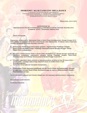 SPORTOWY KLUB TANECZNY MEGA DANCE ul. Dereszowa 27, 65-544 Zielona Góra fax. www.megadance.pl Prezes Zarządu Bartłomiej Kobylański, tel. +48 508 197 804, e-mail:[email protected] konto bankowe: ING Bank Śląski nr 38 1050 1911 1000 0022 6674 5039 KRS 0000128749; NIP 973-07-43-557; REGON 977999240 Zielona Góra, 22-01-2016 ZAPROSZENIE NA MISTRZOSTWA POLSKI W ROCK'N'ROLLU AKROBATYCZNYM i BOOGIE WOOGIE 2016 9 kwietnia 2016 r. Drzonków/ Zielona Góra Drodzy Przyjaciele, Zapraszamy serdecznie na Mistrzostwa Polski w Rock’n’Rollu Akrobatycznym i Boogie Woogie 2016 , które odbędą się 9 kwietnia 2016 roku w Drzonkowie koło Zielonej Góry. W dalszej części znajdziecie wszelkie niezbędne informacje dotyczące zawodów. Mistrzostwa Polski rozgrywane będą zgodnie z regulaminami Polskiego Związku Rock'n'Rolla Akrobatycznego, Polskiego Stwowarzyszenia Boogie Woogie i World Rock'n'Roll Confederation. Do startu w Mistrzostwach Polski w Rock’n’Rollu Akrobatycznym i Boogie Woogie uprawnieni są zawodnicy posiadający odpowiednio aktualną licencję Polskiego Związku Rock’n’Rolla Akrobatycznego lub Polskiego Stowarzyszenia Boogie Woogie na rok 2016. Wszystkie zgłoszenia należy dokonać w nieprzekraczalnym terminie do dnia 28 marca 2016 r. (poniedziałek ) używając załączonego dalej formularza na podany adres e-mail: [email protected] Żadna inna forma zgłoszeń nie będzie akceptowana. Mistrzostwa Polski stanowią kwalifikacje dla par Rock'n'Rolla Akrobatycznego i Boogie Woogie oraz formacji Rock'n'Rolla Akrobatycznego do startu w Mistrzostwach Świata i Mistrzostwach Europy. Termin zamknięcia zgłoszeń jest również obligatoryjny dla rezerwacji zakwaterowania i wyżywienia. Ze sportowym pozdrowieniem, Bartłomiej Kobylański SPORTOWY KLUB TANECZNY MEGA DANCE ul. Dereszowa 27, 65-544 Zielona Góra fax. www.megadance.pl Prezes Zarządu Bartłomiej Kobylański, tel. +48 508 197 804, e-mail:[email protected] konto bankowe: ING Bank Śląski nr 38 1050 1911 1000 0022 6674 5039 KRS 0000128749; NIP 973-07-43-557; REGON 977999240 MISTRZOSTWA POLSKI W ROCK'N'ROLLU AKROBATYCZNYM i BOOGIE WOOGIE 9 kwietnia 2016 DRZONKÓW/ZIELONA GÓRA 1 Organizator Sportowy Klub Taneczny Mega Dance Polski Związek Rock'n'Rolla Akrobatycznego Polskie Stowarzyszenie Boogie Woogie Rock'n'Roll Akrobatyczny Młodzik Młodszy (tylko polskie pary) Młodzik (tylko polskie pary) Junior (open) Klasa B (open) 2 Kategorie Klasa A (open) Formacja Juniorek (tylko polskie formacje) Boogie Woogie Dzieci – do lat 13 (w dniu turnieju partner i partnerka nie ukończone 13 lat) Juniorzy - od 13 do 17 lat Main Class - od 14 lat 3 Data Sobota, 09 kwietnia 2016 r. 4 Miejsce WOSIR Drzonków ul. Olimpijska 20 66-004 Zielona Góra Sportowy Klub Taneczny Mega Dance, Bartłomiej Kobylański, ul. Fabryczna 13 , Zielona Góra 5 Zgłoszenia 6 Rejestracja Hala Tenisowa WOSiR Drzonków Piątek 08.04.2016 godzina 19.00-21.00 Sobota 09.04.2016 godzina 9.00 -10.00 Zamknięcie zgłoszeń Zgłoszenia należy przesłać w nieprzekraczalnym terminie do dnia 28 marca 2016 r. używając załączonego dalej formularza na podany adres e-mail: [email protected] Żadna inna forma zgłoszeń nie będzie akceptowana. 7 Tel. Kom.: +48 508 197 804 e-mail: [email protected] 8 Wyżywienie i zakwaterowanie 9 Sędziowie Wyżywienie – catering na hali zawodów (obiad w cenie 15 zł) Wyżywienie należy zamówić łącznie ze zgłoszeniem zawodników do dnia 28 marca 2016 r. Zakwaterowanie WOSiR– Hotel/Internat (wg. zamówień indywidualnych startujących klubów 48-80 zł ześniadaniem). Zgodnie z nominacją Polskiego Związku Rock'n'Rolla Akrobatycznego i Polskiego Stowarzyszenia Boogie Woogie. Rock'n'Roll Akrobatyczny Rundy eliminacyjne par – muzyka organizatora, tempo 48 taktów/min. Finały par, rundy eliminacyjne i finały formacji – muzyka własna, czas, tempo zgodne z regulaminem WRRC, nośnik - CD Boogie Woogie Muzyka 10 /Rundy, Tempo, Czas/ 11 Próba parkietu - Runda szybka obowiązująca w eliminacjach i finale każdej kategorii - Runda wolna obowiązująca w finale w kategoriach : Junior, Main Class Tempo muzyczne: Runda szybka: Dzieci 46-50 taktów/min Juniorzy 48-52 taktów/min Seniorzy 50-54 taktów/min Runda wolna: dla każdej klasy 28-34 taktów/min 1. Czas tańca: Runda szybka: 1,30 min Runda wolna : 1,30 min 2. Dobór muzyki: zgodnie z listą WRRC (losowanie utworów w finale) 9.30 – 11.00 11.00 Eliminacje 18.00 Półfinały i Finały Szczegółowy program Mistrzostw Polski dostępny będzie po zamknięciu zgłoszeń. 12 Program 13 Opłata startowa 25.00 zł / zawodnika. Zawodnicy, którzy dodatkowo startują w kategorii formacji – opłata dodatkowa 10.00 zł / zawodnika. 14 Nagrody Dyplomy i medale dla wszystkich startujących zawodników, Puchary i nagrody rzeczowe dla wszystkich finalistów. 15 Bilety Wstęp wolny.
