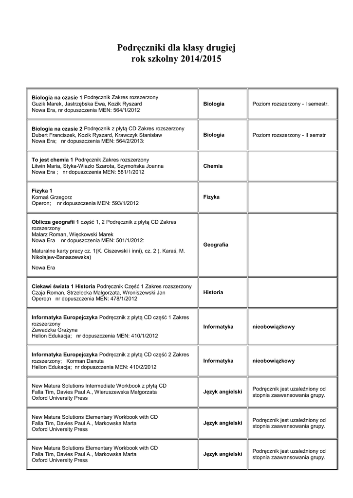 Podręczniki dla klasy drugiej rok szkolny 2014/2015 Biologia na czasie 1 Podręcznik Zakres rozszerzony Guzik Marek, Jastrzębska Ewa, Kozik Ryszard Nowa Era, nr dopuszczenia MEN: 564/1/2012 Biologia Poziom rozszerzony - I semestr. Biologia na czasie 2 Podręcznik z płytą CD Zakres rozszerzony Dubert Franciszek, Kozik Ryszard, Krawczyk Stanisław Nowa Era; nr dopuszczenia MEN: 564/2/2013: Biologia Poziom rozszerzony - II semstr To jest chemia 1 Podręcznik Zakres rozszerzony Litwin Maria, Styka-Wlazło Szarota, Szymońska Joanna Nowa Era ; nr dopuszczenia MEN: 581/1/2012 Chemia Fizyka 1 Kornaś Grzegorz Operon; nr dopuszczenia MEN: 593/1/2012 Fizyka Oblicza geografii 1 część 1, 2 Podręcznik z płytą CD Zakres rozszerzony Malarz Roman, Więckowski Marek Nowa Era nr dopuszczenia MEN: 501/1/2012: Geografia Maturalne karty pracy cz. 1(K. Ciszewski i inni), cz. 2 (. Karaś, M. Nikołajew-Banaszewska) Nowa Era Ciekawi świata 1 Historia Podręcznik Część 1 Zakres rozszerzony Czaja Roman, Strzelecka Małgorzata, Wroniszewski Jan Opero;n nr dopuszczenia MEN: 478/1/2012 Historia Informatyka Europejczyka Podręcznik z płytą CD część 1 Zakres rozszerzony Zawadzka Grażyna Helion Edukacja; nr dopuszczenia MEN: 410/1/2012 Informatyka nieobowiązkowy Informatyka Europejczyka Podręcznik z płytą CD część 2 Zakres rozszerzony; Korman Danuta Helion Edukacja; nr dopuszczenia MEN: 410/2/2012 Informatyka nieobowiązkowy New Matura Solutions Intermediate Workbook z płytą CD Falla Tim, Davies Paul A., Wieruszewska Małgorzata Oxford University Press Język angielski Podręcznik jest uzależniony od stopnia zaawansowania grupy. New Matura Solutions Elementary Workbook with CD Falla Tim, Davies Paul A., Markowska Marta Oxford University Press Język angielski Podręcznik jest uzależniony od stopnia zaawansowania grupy. New Matura Solutions Elementary Workbook with CD Falla Tim, Davies Paul A., Markowska Marta Oxford University Press Język angielski Podręcznik jest uzależniony od stopnia zaawansowania grupy. New Matura Solutions Intermediate Student's Book Falla Tim, Davies Paul Oxford University Press; nr dopuszczenia MEN: 361/3/2012 Język angielski Podręcznik jest uzależniony od stopnia zaawansowania grupy. New Matura Solutions Pre-Intermediate Workbook z płytą CD Falla Tim, Davies Paul, Wieruszewska Małgorzata Oxford University Press Język angielski Podręcznik jest uzależniony od stopnia zaawansowania grupy. New Matura Solutions Pre-intermiate Student\'s Book Falla Tim, Davies Paul A., Wieruszewska Małgorzata Oxford University Press, nr dopuszczenia MEN: 361/2/2011 Język angielski Podręcznik jest uzależniony od stopnia zaawansowania grupy. Francofolie express 2 Podręcznik z płytą CD Supryn-Klepcarz Magdalena, Boutegege Regine Wydawnictwo Szkolne PWN, nr dopuszczenia MEN: 382/2/2013 Język francuski Francofolie express 2 Zeszyt ćwiczeń z płytą CD i płytą CD-ROM La France Supryn-Klepcarz Magdalena, Boutégege Regine Wydawnictwo Szkolne PWN Język francuski Welttour 3 Język niemiecki Podręcznik z ćwiczeniami + 2CD Mróz-Dwornikowska Sylwia, Szachowska Katarzyna Nowa Era, nr dopuszczenia MEN: 459/3/2013 Welttour 2 język niemiecki podręcznik z zeszytem ćwiczeń z filmami ZDF Mróz-Dwornikowska Sylwia, Górecka Urszula Nowa Era, nr dopuszczenia MEN: 459/2/2012 Język niemiecki Język niemiecki Zrozumieć tekst - zrozumieć człowieka 2 Podręcznik Część 1 Podręcznik Zakres podstawowy i rozszerzony Chemperek Dariusz, Kalbarczyk Adam, Trześniowski Dariusz WSiP nr dopuszczenia MEN: 463/3/2013 Język polski Wot i my 2 Podręcznik Język rosyjski dla szkół ponadgimnazjalnych z płytą CD Wiatr-Kmieciak Małgorzata, Wujec Sławomira Wydawnictwo Szkolne PWN Język rosyjski MATeMAtyka 2 Podręcznik dla szkół ponadgimnazjalnych. Kształcenie ogólne w zakresie rozszerzonym Wojciech Babiański, Lech Chańko, Joanna Czarnowska, Grzegorz Janocha Nowa Era nr dopuszczenia MEN: 360/2/2013: Matematyka Przedmiot uzupełniający Część 2. Chemia Agata Sawicka OPERON: Przyroda Pracę z częścią 3 tej serii grupa zaawansowana rozpocznie po zakończeniu realizacji części 2. Grupa średniozaawansowana rozpocznie naukę z częścią 2 serii WELTTOUR. Grupa zaawansowana kontynuuje naukę z częścią 2, następnie rozpocznie realizację części 3 serii WELTTOUR. Przedmiot uzupełniający Część 3. Biologia Agata Duda, Jolanta Holeczek OPERON Przyroda Przedmiot uzupełniający Część 1. Fizyka Grzegorz F. Wojewoda OPERON nr dopuszczenia MEN: MEN 637/1/2013: Przyroda Przedmiot uzupełniający Część 4. Geografia Agata Łazarz, Aneta Szczepańska, Sławomir Sobotka OPERON Przyroda Na drogach wiary. Podręcznik do religii dla klasy II liceum i technikum. J. Czerkawski, E. Kondrak, B. Nosek Jedność Religia nieobowiązkowy – podręczniki są dostępne w szkole Wiedza o społeczeństwie podręcznik część 1 Smutek Zbigniew, Maleska Jan, Surmacz Beata Operon, nr dopuszczenia MEN: 488/1/2012 Wiedza o społeczeństwie Zakres rozszerzony Biologia Pozycja niobowiązkowa Biologia na czasie Maturalne karty pracy 1 Zakres rozszerzony Nowakowska Alina, Komosa Elżbieta, Płusa Iwona Nowa Era Biologia na czasie Maturalne karty pracy 2 Zakres rozszerzony Kąkol Piotr Tadeusz, Nowakowska Alina, Pawłowski Jacek Nowa Era, nr dopuszczenia MEN: 564/2/2013 Odkrywamy na nowo: historia i społeczeństwo Adam Balicki i inni Wątek :Ojczysty Panteon i ojczyste spory Operon; nr dopuszczenia MEN 665/2013 Historia i społeczeństwo