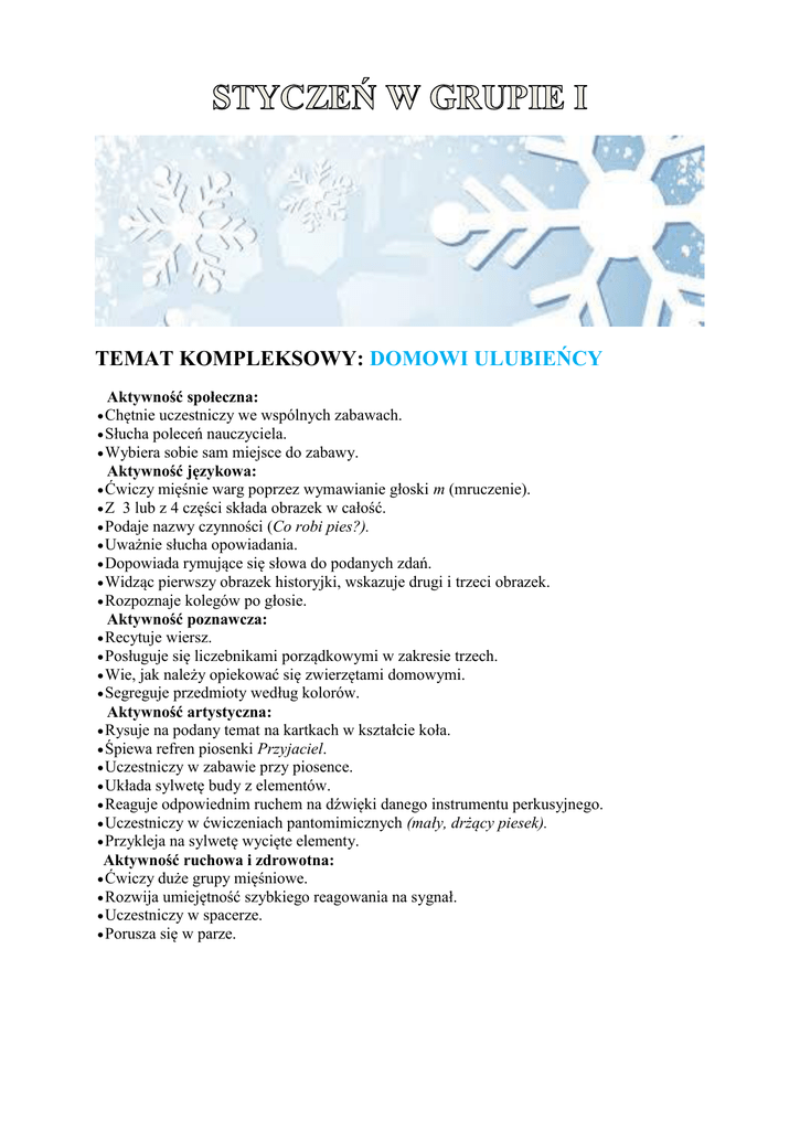 TEMAT KOMPLEKSOWY: DOMOWI ULUBIEŃCY Aktywność społeczna: Chętnie uczestniczy we wspólnych zabawach. Słucha poleceń nauczyciela. Wybiera sobie sam miejsce do zabawy. Aktywność językowa: Ćwiczy mięśnie warg poprzez wymawianie głoski m (mruczenie). Z 3 lub z 4 części składa obrazek w całość. Podaje nazwy czynności (Co robi pies?). Uważnie słucha opowiadania. Dopowiada rymujące się słowa do podanych zdań. Widząc pierwszy obrazek historyjki, wskazuje drugi i trzeci obrazek. Rozpoznaje kolegów po głosie. Aktywność poznawcza: Recytuje wiersz. Posługuje się liczebnikami porządkowymi w zakresie trzech. Wie, jak należy opiekować się zwierzętami domowymi. Segreguje przedmioty według kolorów. Aktywność artystyczna: Rysuje na podany temat na kartkach w kształcie koła. Śpiewa refren piosenki Przyjaciel. Uczestniczy w zabawie przy piosence. Układa sylwetę budy z elementów. Reaguje odpowiednim ruchem na dźwięki danego instrumentu perkusyjnego. Uczestniczy w ćwiczeniach pantomimicznych (mały, drżący piesek). Przykleja na sylwetę wycięte elementy. Aktywność ruchowa i zdrowotna: Ćwiczy duże grupy mięśniowe. Rozwija umiejętność szybkiego reagowania na sygnał. Uczestniczy w spacerze. Porusza się w parze. TEMAT KOMPLEKSOWY:ZWIERZĘTA SĄ GŁODNE Aktywność społeczna: Uczestniczy w zabawie tematycznej, przyjmując odpowiednią rolę. Wie, na czym polega praca leśnika. Aktywność językowa: Naśladuje glosy ptaków. Dzieli razem z nauczycielem słowa na sylaby. Wydłuża poprzez ćwiczenia fazę wydechową. Wypowiada się na temat dokarmiania ptaków. Uważnie słucha opowiadania. Aktywność poznawcza: Rozpoznaje wróbla. Dokarmia ptaki. Określa, co zdarzyło się wcześniej, a co później. Rozumie określenia: na, w, pod. Wymienia nazwy pokarmu dla ptaków. Aktywność artystyczna: Nakleja elementy na kartkę. Wykonuje pracę techniką orgiami. Aktywność ruchowa i zdrowotna: Porusza się do tekstu rymowanki. Reaguje odpowiednim ruchem na sygnał. TEMAT KOMPLEKSOWY:BABCIA I DZIADEK Aktywność społeczna: Nazywa członków rodziny. Wymienia imiona babć i dziadków. Przestrzega reguł zabaw. Nie przerywa wypowiedzi innym, spokojnie czeka na swoją kolej. Uczestniczy w spotkaniu z babciami i dziadkami. Prezentuje swoje możliwości (śpiewa piosenki, recytuje wiersze). Ocenia zachowanie dzieci z obrazków względem ludzi starszych. Aktywność językowa: Wypowiada się na temat swojej babci i dziadka. Spokojnie słucha opowiadania. Porównuje swoją babcię z tymi przedstawionymi na obrazkach. Aktywność poznawcza: Recytuje wiersz D. Gellner Dla babci. Rozwiązuje zagadki. Porównuje długość wstążek. Wskazuje zdjęcia niepasujące tematycznie do pozostałych. Aktywność artystyczna: Buduje wieżę z niebieskich klocków. Nakleja skrawki materiałów na karton. Śpiewa piosenkę Babcia i dziadek. Przykleja wycięte kwiaty na sylwecie serduszka. Rysuje kwiaty dla babci i dziadka w polu oznaczonym ramką. Aktywność ruchowa i zdrowotna: Maszeruje w rytmie wierszyka. Ilustruje ruchem tekst wiersza. Reaguje odpowiednim ruchem na podane hasła. Biega w parze. Reaguje na podane sygnały: słuchowe, wzrokowe. TEMAT KOMPLEKSOWY:ZIMO BAW SIĘ Z NAMI Aktywność społeczna: Uczestniczy we wspólnych zabawach. Składa ubrania przed leżakowaniem. Odkłada prace do półek indywidualnych. Odpowiada na zadane pytania. Dzieli się swoimi przeżyciami. Aktywność językowa: Posługuje się nazwami: kulig, sanie. Składa w całość pocięte na sześć części obrazki. Naśladuje dźwięki: szu, wiu, skrzyp, dzyń. Wypowiada się prostymi zdaniami. Aktywność poznawcza: Układa ilustracje według kolejności zdarzeń w wysłuchanym wierszu. Recytuje wiersz I. R. Salach Śnieg. Łączy w pary obrazki przedstawiające sytuacje wcześniejsze i późniejsze. Rozumie określenia: przed, na, nad, za. Wie, z czego i w jakich warunkach powstaje lód. Określa ogólne właściwości fizyczne lodu. Aktywność artystyczna: Rysuje białą kredą na granatowym tle. Improwizuje ruchowo przy muzyce tanecznej. Porusza się w rytmie wystukiwanym na bębenku. Aktywność ruchowa i zdrowotna: Podskakuje obunóż w miejscu. Ilustruje tekst wiersza ruchem. Uczestniczy w zabawach z przyborem. PIOSENKI I. Ulepiła zima szalik kolorowy wszyscy się radują od samego ranka. III. Kolorową czapkę, dla dzieci bałwanka, oraz zaproszenie na konceert zimowy. Ref.: Tańczy, tańczy z nami tańczyć nagle z zimą bałwanek zaczyna. Ref.: Tańczy... mroźna pani zima, II. Stają dzieci w kole, piosenkę śpiewają, prezent dla bałwanka bardzo ładny mają. Ref.: Tańczy... III. Pozdrawiamy babcię, dziadka, całym sercem pozdrawiamy. Zaśpiewamy teraz głośno: Babciu, mocno Cię kochamy! Ref.:Wiwat, babciu, wiwat, dziadku, żyjcie w zdrowiu nam sto lat. Wiwat, babciu, wiwat, dziadku, niech wam śpiewa cały świat. IV. Pozdrawiamy babcię, dziadka, całym sercem pozdrawiamy. Zaśpiewamy teraz głośno: Dziadku, mocno Cię kochamy. Ref.:Wiwat... V. Dziadek wnuki swe przytuli, babcia zaraz da buziaka, a to bardzo ważna sprawa dla każdego przedszkolaka. Ref.:Wiwat... WIERSZE Śniegowe gwiazdki spadają, spadają, dzieci je w dłonie chwytają, chwytają. Gwiazdki przez chwilę się mienią, się mienią, zaraz się w wodę zamienią, zamienią. swobodnie opuszczają ręce uniesione w górę, naśladują łapanie śniegowych gwiazdek, ręce trzymają uniesione w górę, poruszają nimi w nadgarstkach, przechodzą do przysiadu, uderzają dłońmi o podłogę. Skacze wróbel po ulicy i jedzenia szuka. Chciałby owsa i pszenicy, w okno moje stuka. Nie ma owsa i pszenicy, tylko bułka pszenna. Zjedz ją sobie, przyjacielu, dam ci potem ziarna. skaczą obunóż w różnych kierunkach, ręce mają splecione z tyłu, kręcą pośladkami na boki, rozglądają się na boki, fruwają, wykonują skrętoskłony w jedną i w drugą stronę, w lekkim skłonie, wykonują przed sobą pa