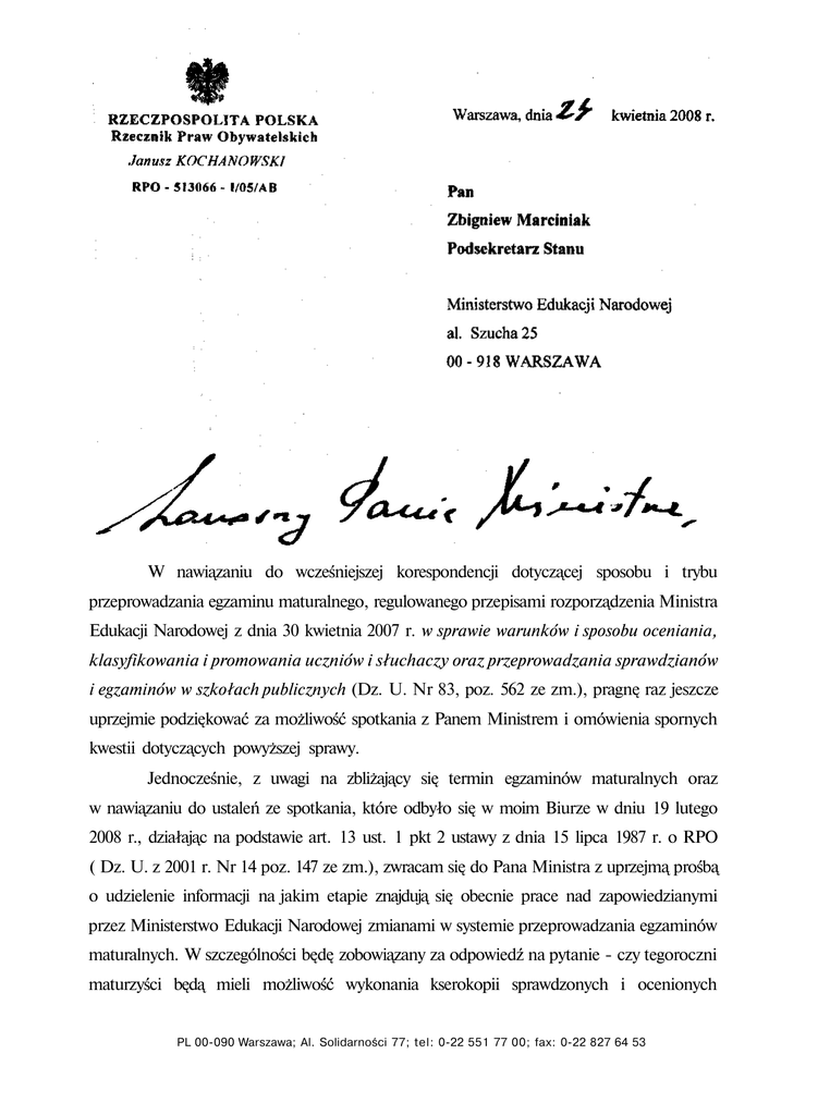 W nawiązaniu do wcześniejszej korespondencji dotyczącej sposobu i trybu przeprowadzania egzaminu maturalnego, regulowanego przepisami rozporządzenia Ministra Edukacji Narodowej z dnia 30 kwietnia 2007 r. w sprawie warunków i sposobu oceniania, klasyfikowania i promowania uczniów i słuchaczy oraz przeprowadzania sprawdzianów i egzaminów w szkołach publicznych (Dz. U. Nr 83, poz. 562 ze zm.), pragnę raz jeszcze uprzejmie podziękować za możliwość spotkania z Panem Ministrem i omówienia spornych kwestii dotyczących powyższej sprawy. Jednocześnie, z uwagi na zbliżający się termin egzaminów maturalnych oraz w nawiązaniu do ustaleń ze spotkania, które odbyło się w moim Biurze w dniu 19 lutego 2008 r., działając na podstawie art. 13 ust. 1 pkt 2 ustawy z dnia 15 lipca 1987 r. o RPO ( Dz. U. z 2001 r. Nr 14 poz. 147 ze zm.), zwracam się do Pana Ministra z uprzejmą prośbą o udzielenie informacji na jakim etapie znajdują się obecnie prace nad zapowiedzianymi przez Ministerstwo Edukacji Narodowej zmianami w systemie przeprowadzania egzaminów maturalnych. W szczególności będę zobowiązany za odpowiedź na pytanie - czy tegoroczni maturzyści będą mieli możliwość wykonania kserokopii sprawdzonych i ocenionych PL 00-090 Warszawa; Al. Solidarności 77; tel: 0-22 551 77 00; fax: 0-22 827 64 53 2 arkuszy egzaminacyjnych, a także, jakie kroki podjęto w celu ujednolicenia zasad udostępniania absolwentom szkół ponadgimnazjalnych sprawdzonych i ocenionych prac maturalnych.