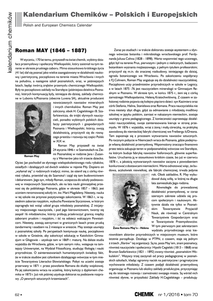 kalendarium chemików Kalendarium Chemików – Polskich i Europejskich Polish and European Chemists Calendar Roman MAY (1846 – 1887) W styczniu, 170 lat temu, przyszedł na świat chemik, wybitny działacz przemysłowy i społeczny Wielkopolski, który zaistniał na tym terenie w okresie pruskiego zaboru. Mimo stosunkowo krótkiego życia (41 lat) dał się poznać jako wielce zaangażowany w działalność naukową i patriotyczną, początkowo na terenie miasta Wrocławia i innych na południu, a następnie szkół poznańskich, oraz, w późniejszych latach, będąc twórcą zrębów przemysłu chemicznego Wielkopolski. Były to początkowo zakłady na Starołęce (późniejsza dzielnica Poznania), których kontynuacją były, istniejące do dzisiaj, zakłady chemiczne w Luboniu k/Poznania (obecnie Luvena SA), aktualnie producent nowoczesnych nawozów mineralnych i innych chemikaliów. Roman May jest zaliczony, obok H. Cegielskiego i B. Szafarkiewicza, do trójki słynnych nauczycieli, ponadto wybitnych polskich działaczy patriotycznych i gospodarczych Poznania i Wielkopolski, którzy, swoją działalnością, przyczynili się do rosnącego prestiżu i rozwoju tej części Polski w XIX w. Roman May przyszedł na świat 24 stycznia 1846 r. w Szamotułach na Ziemi Poznańskiej w rodzinie Jana i ZuzanRoman May ny z Wernerów jako ich trzecie dziecko. Ojciec Jan pochodził ze słynnego wielopokoleniowego rodu rybaków, osiadłych i działających od dwóch wieków w rejonie Piły. Dopiero on „wyłamał się” z rodzinnych tradycji; mimo, że ożenił się z córką również rybaka, przeniósł się do Szamotuł i zajął się tam budownictwem i dekarstwem. Jego syn, młody Roman, uczęszcza do szkoły podstawowej w miejscowych Szamotułach, ale na lata nauki gimnazjalnej przenosi się do pobliskiego Poznania, gdzie w okresie 1857 – 1863, jest uczniem renomowanej szkoły im. św. Marii Magdaleny. Niestety, nauka w tej szkole nie przynosi pozytywnego zakończenia. W 1863 r., w sąsiednim zaborze rosyjskim, wybucha Powstanie Styczniowe, w którym zapragnęła też wziąć udział grupa młodzieży poznańskiej. Z inicjatywy miejscowego nauczyciela, i pod jego kierownictwem, tworzy się zespół 16 młodzieńców, którzy próbują przekroczyć granicę między zaborami pruskim i rosyjskim, i iść na odsiecz walczącym Powstańcom. Niestety, zostają zatrzymani w granicznych lasach przez pruską żandarmerię i osadzeni na 2 miesiące w areszcie. May zostaje usunięty z poznańskiej szkoły. Po perypetiach kontynuuje naukę, początkowo w szkole w Gnieźnie, aby zakończyć edukację w Katolickim Gimnazjum w Głogowie – uzyskuje tam w 1869 r. maturę. Na dalsze studia wyjeżdża do Wrocławia, gdzie, w tym samym roku, wstępuje na tamtejszy Uniwersytet, na Wydział Filozoficzny, studiując filologię i nauki przyrodnicze. O zainteresowaniach humanistycznych świadczy fakt, że w trakcie studiów jest członkiem działającego wówczas w tym mieście Towarzystwa Literacko–Słowiańskiego. Pobyt na uczelni zostaje przerwany w 1871 r. przez powołanie Romana do służby wojskowej. Po jej zakończeniu wraca na uczelnię, którą kończy z dyplomem chemika w 1873 r. Już rok później uzyskuje doktorat na podstawie rozprawy „O pewnych sztucznych krzemianach”. 62 • Zaraz po studiach i w trakcie doktoratu zostaje asystentem u słynnego wówczas botanika i mikrobiologa wrocławskiego prof. Ferdynanda Juliusa Cohna (1828 – 1898). Warto wspomnieć tego uczonego, gdyż był na terenie Prus, pierwszym i jednym z nielicznych, badaczem botanikiem wyznania mojżeszowego, z pełnym tytułem profesorskim; przyczynił się m.in. do znacznej rozbudowy, istniejącego do dzisiaj, ogrodu botanicznego we Wrocławiu. Po zakończeniu współpracy z F.J.Cohnem, Roman May angażuje się do działalności nauczycielskiej. Początkowo uczy przedmiotów przyrodniczych w szkole w Legnicy, a w latach 1875 -76 jest nauczycielem mineralogii w Gimnazjum Realnym w Poznaniu. W okresie tym, w końcu 1875 r., żeni się z córką zamożnego Wielkopolanina, Heleną Kratochwilówną. Z czasem w założonej rodzinie pojawia się kolejno pięcioro dzieci: syn Kazimierz oraz córki Stefania, Halina, Stanisława oraz Romana. Praca nauczycielska nie trwa niestety zbyt długo, gdyż za odmawianie z młodzieżą modlitwy szkolnej w języku polskim, zamiast w nakazanym niemieckim, zostaje usunięty z grona pedagogicznego. Z konieczności zaprzestając działalności nauczycielskiej, swoje zainteresowania kieruje w stronę przemysłu. W 1876 r. wyjeżdża, wraz z żoną i małą córeczką, na praktykę zawodową do niemieckiej fabryki chemicznej we Freibergu k/Drezna. Tam zapoznaje się z procesem wytwarzania nawozów sztucznych. Po rocznym pobycie w Niemczech wraca do Poznania, gdzie podejmuje własną działalność przemysłową. Wspomożony znacząco finansowo przez teścia zakupuje teren w podpoznańskiej wówczas wsi Starołęce, na którym buduje fabrykę nawozów fosforowych, głównie superfosfatów. Uruchamia ją w stosunkowo krótkim czasie, bo już w czerwcu 1878 r., a jakością wytwarzanych nawozów zaczyna z powodzeniem konkurować z dostawcami niemieckimi. Warto odnotować więc, że budowa, aczkolwiek niewielkiej, ale fabryki chemicznej, trwała jedynie rok. Obok zakładów, R. May wybudował dużą willę, w której na długie lata zamieszkała Jego rodzina. Równolegle do prowadzonej działalności przemysłowej, w coraz szerszym zakresie udziela się pracom społecznym i naukowym. Aktywnie działa nie tylko w Poznańskim Towarzystwie Przyjaciół Nauk, ale również w Centralnym Towarzystwie Gospodarczym oraz w Towarzystwie Przemysłowców. W tym pierwszym jest sekretarzem Żona Romana May’a – Helena wydziału przyrodniczego oraz kierownikiem zbiorów przyrodniczych w miejscowym muzeum, które istotnie porządkuje. Działając w PTPN, z czasem, staje się jednym z trzech „filarów” tej organ