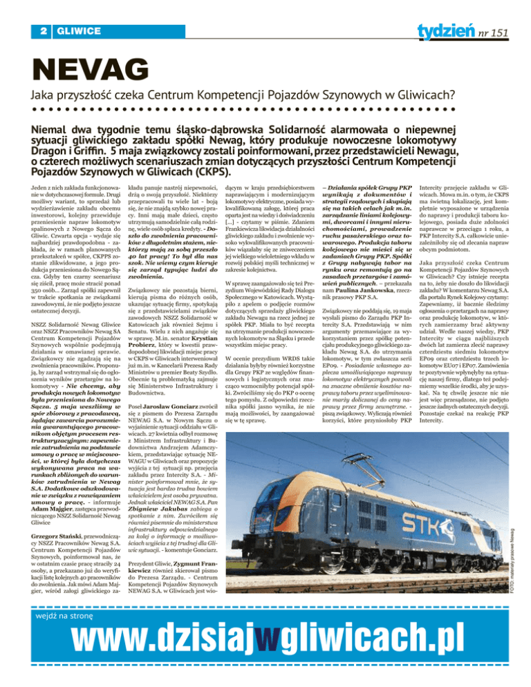 2 GLIWICE nr 151 NEVAG Jaka przyszłość czeka Centrum Kompetencji Pojazdów Szynowych w Gliwicach? .................................................... Niemal dwa tygodnie temu śląsko-dąbrowska Solidarność alarmowała o niepewnej sytuacji gliwickiego zakładu spółki Newag, który produkuje nowoczesne lokomotywy Dragon i Griffin. 5 maja związkowcy zostali poinformowani, przez przedstawicieli Newagu, o czterech możliwych scenariuszach zmian dotyczących przyszłości Centrum Kompetencji Pojazdów Szynowych w Gliwicach (CKPS). NSZZ Solidarność Newag Gliwice oraz NSZZ Pracowników Newag SA Centrum Kompetencji Pojazdów Szynowych wspólnie podejmują działania w omawianej sprawie. Związkowcy nie zgadzają się na zwolnienia pracowników. Proponują, by zarząd wstrzymał się do ogłoszenia wyników przetargów na lokomotywy - Nie chcemy, aby produkcja nowych lokomotyw była przeniesiona do Nowego Sącza. 5 maja weszliśmy w spór zbiorowy z pracodawcą, żądając zawarcia porozumienia gwarantującego pracownikom objętym procesem restrukturyzacyjnym: zapewnienie zatrudnienia na podstawie umowy o pracę w miejscowości, w której była dotychczas wykonywana praca na warunkach zbliżonych do warunków zatrudnienia w Newag S.A. Dodatkowe odszkodowanie w związku z rozwiązaniem umowy o pracę. - informuje Adam Majgier, zastępca przewodniczącego NSZZ Solidarność Newag Gliwice Grzegorz Stański, przewodniczący NSZZ Pracowników Newag S.A. Centrum Kompetencji Pojazdów Szynowych, poinformował nas, że w ostatnim czasie pracę straciły 24 osoby, a przekazano już do weryfikacji listę kolejnych 40 pracowników do zwolnienia. Jak mówi Adam Majgier, wśród załogi gliwickiego za- wejdź na stronę kładu panuje nastrój niepewności, drżą o swoją przyszłość. Niektórzy przepracowali tu wiele lat - boją się, że nie znajdą szybko nowej pracy. Inni mają małe dzieci, często utrzymują samodzielnie całą rodzinę, wiele osób spłaca kredyty. - Doszło do zwolnienia pracowników z długoletnim stażem, niektórzy mają za sobą przeszło 40 lat pracy! To był dla nas szok. Nie wiemy czym kieruje się zarząd typując ludzi do zwolnienia. Związkowcy nie pozostają bierni, kierują pisma do różnych osób, ukazując sytuację firmy, spotykają się z przedstawicielami związków zawodowych NSZZ Solidarność w Katowicach jak również Sejmu i Senatu. Wielu z nich angażuje się w sprawę. M.in. senator Krystian Probierz, który w kwestii prawdopodobnej likwidacji miejsc pracy w CKPS w Gliwicach interweniował już m.in. w Kancelarii Prezesa Rady Ministrów u premier Beaty Szydło. Obecnie tą problematyką zajmuje się Ministerstwo Infrastruktury i Budownictwa. Poseł Jarosław Gonciarz zwrócił się z pismem do Prezesa Zarządu NEWAG S.A. w Nowym Sączu o wyjaśnienie sytuacji oddziału w Gliwicach. 27 kwietnia odbył rozmowę z Ministrem Infrastruktury i Budownictwa Andrzejem Adamczykiem, przedstawiając sytuację NEWAGU w Gliwicach oraz propozycje wyjścia z tej sytuacji np. przejęcia zakładu przez Intercity S.A. - Minister poinformował mnie, że sytuacja jest bardzo trudna bowiem właścicielem jest osoba prywatna. Jednak właściciel NEWAG S.A. Pan Zbigniew Jakubas zabiega o spotkanie z nim. Zwróciłem się również pisemnie do ministerstwa infrastruktury odpowiedzialnego za kolej o informację o możliwościach wyjścia z tej trudnej dla Gliwic sytuacji. - komentuje Gonciarz. dącym w kraju przedsiębiorstwem naprawiającym i modernizującym lokomotywy elektryczne, posiada wykwalifikowaną załogę, której praca oparta jest na wiedzy i doświadczeniu [...] - czytamy w piśmie. Zdaniem Frankiewicza likwidacja działalności gliwickiego zakładu i zwolnienie wysoko wykwalifikowanych pracowników wiązałaby się ze zniweczeniem jej wielkiego wieloletniego wkładu w rozwój polskiej myśli technicznej w zakresie kolejnictwa. W sprawę zaangażowało się też Prezydium Wojewódzkiej Rady Dialogu Społecznego w Katowicach. Wystąpiło z apelem o podjęcie rozmów dotyczących sprzedaży gliwickiego zakładu Newagu na rzecz jednej ze spółek PKP. Miała to być recepta na utrzymanie produkcji nowoczesnych lokomotyw na Śląsku i przede wszystkim miejsc pracy. W ocenie prezydium WRDS takie działania byłyby również korzystne dla Grupy PKP ze względów finansowych i logistycznych oraz znacząco wzmocniłyby potencjał spółki. Zwróciliśmy się do PKP o ocenę tego pomysłu. Z odpowiedzi rzecznika spółki jasno wynika, że nie mają możliwości, by zaangażować się w tę sprawę. – Działania spółek Grupy PKP wynikają z dokumentów i strategii rządowych i skupiają się na takich celach jak m.in. zarządzanie liniami kolejowymi, dworcami i innymi nieruchomościami, prowadzenie ruchu pasażerskiego oraz towarowego. Produkcja taboru kolejowego nie mieści się w zadaniach Grupy PKP. Spółki z Grupy nabywają tabor na rynku oraz remontują go na zasadach przetargów i zamówień publicznych. – przekazała nam Paulina Jankowska, rzecznik prasowy PKP S.A. Związkowcy nie poddają się, 19 maja wysłali pismo do Zarządu PKP Intercity S.A. Przedstawiają w nim argumenty przemawiające za wykorzystaniem przez spółkę potencjału produkcyjnego gliwickiego zakładu Newag S.A. do utrzymania lokomotyw, w tym zwłaszcza serii EP09. - Posiadanie własnego zaplecza umożliwiającego naprawy lokomotyw elektrycznych pozwoli na znaczne obniżenie kosztów naprawy taboru przez wyeliminowanie marży doliczanej do ceny naprawy przez firmy zewnętrzne. piszą związkowcy. Wyliczają również korzyści, które przyniosłoby PKP Intercity przejęcie zakładu w Gliwicach. Mowa m.in. o tym, że CKPS ma świetną lokalizację, jest kompletnie wyposażone w urządzenia do naprawy i produkcji taboru kolejowego, posiada duże zdolności naprawcze w przeciągu 1 roku, a PKP Intercity S.A. całkowicie uniezależniłoby się od zlecania napraw obcym podmiotom. Jaka przy