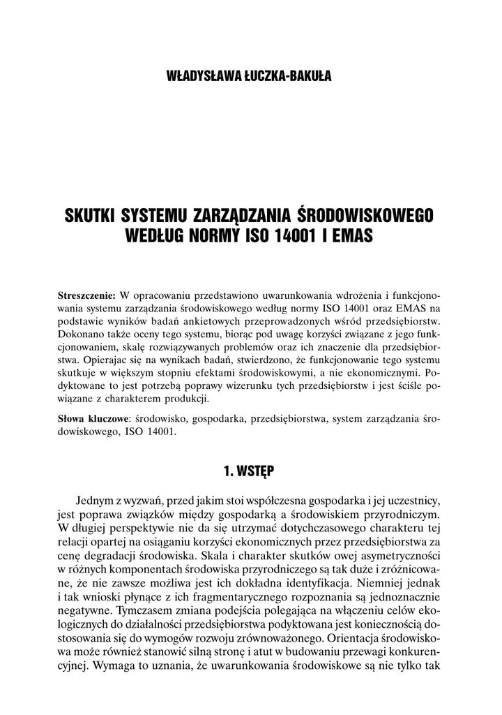 WŁADYSŁAWA ŁUCZKA−BAKUŁA SKUTKI SYSTEMU ZARZĄDZANIA ŚRODOWISKOWEGO WEDŁUG NORMY ISO 14001 I EMAS Streszczenie: W opracowaniu przedstawiono uwarunkowania wdrożenia i funkcjonowania systemu zarządzania środowiskowego według normy ISO 14001 oraz EMAS na podstawie wyników badań ankietowych przeprowadzonych wśród przedsiębiorstw. Dokonano także oceny tego systemu, biorąc pod uwagę korzyści związane z jego funkcjonowaniem, skalę rozwiązywanych problemów oraz ich znaczenie dla przedsiębiorstwa. Opierajac się na wynikach badań, stwierdzono, że funkcjonowanie tego systemu skutkuje w większym stopniu efektami środowiskowymi, a nie ekonomicznymi. Podyktowane to jest potrzebą poprawy wizerunku tych przedsiębiorstw i jest ściśle powiązane z charakterem produkcji. Słowa kluczowe: środowisko, gospodarka, przedsiębiorstwa, system zarządzania środowiskowego, ISO 14001. 1. WSTĘP Jednym z wyzwań, przed jakim stoi współczesna gospodarka i jej uczestnicy, jest poprawa związków między gospodarką a środowiskiem przyrodniczym. W długiej perspektywie nie da się utrzymać dotychczasowego charakteru tej relacji opartej na osiąganiu korzyści ekonomicznych przez przedsiębiorstwa za cenę degradacji środowiska. Skala i charakter skutków owej asymetryczności w różnych komponentach środowiska przyrodniczego są tak duże i zróżnicowane, że nie zawsze możliwa jest ich dokładna identyfikacja. Niemniej jednak i tak wnioski płynące z ich fragmentarycznego rozpoznania są jednoznacznie negatywne. Tymczasem zmiana podejścia polegająca na włączeniu celów ekologicznych do działalności przedsiębiorstwa podyktowana jest koniecznością dostosowania się do wymogów rozwoju zrównoważonego. Orientacja środowiskowa może również stanowić silną stronę i atut w budowaniu przewagi konkurencyjnej. Wymaga to uznania, że uwarunkowania środowiskowe są nie tylko tak 112 Władysława Łuczka−Bakuła samo ważne jak pozostałe elementy składowe otoczenia przedsiębiorstwa, ale są również czynnikiem sprawczym przedsięwzięć prorozwojowych. Stan zmian środowiskowych wywołanych wysoką dynamiką procesów gospodarczych stanowi wystarczającą podstawę do tego, aby podejmować działania zmierzające nie tylko do zwiększenia skuteczności istniejących instrumentów polityki ekologicznej, ale również do uruchomienia mechanizmów służących ich upowszechnieniu1. Na przykład poprawa aspektów środowiskowych w zdecydowanej większość małych i średnich przedsiębiorstw napotyka na szereg różnego typu trudności poczynając od organizacyjnych i finansowych, a skończywszy na technologicznych. W tym przypadku wskazana jest w pierwszym rzędzie pomoc doradczo-szkoleniowa ukierunkowana na zdobycie przez sektor MSP większych umiejętności w zakresie identyfikacji aspektów środowiskowych działalności. Ich rozpoznanie jest wstępnym warunkiem ewentualnej zmiany podejścia do rozwiązywania problemów środowiskowych wynikających z działalności gospodarczej tych przedsiębiorstw. W lepszej sytuacji pod tym względem są duże przedsiębiorstwa, których wyposażenie w zasoby ludzkie i kapitałowe stwarza większe szanse nie tylko na korektę pewnych aspektów środowiskowych działalności, ale na systemowe podejście do ochrony środowiska. Potwierdza to między innymi zainteresowanie tych przedsiębiorstw wdrażaniem systemu zarządzania środowiskowego według normy ISO 14001 i EMAS, które są przejawem sformalizowanej i wysoce aktywnej realizacji zadań środowiskowych przez przedsiębiorstwa. 2. ROZWÓJ SYSTEMU ZARZĄDZANIA ŚRODOWISKOWEGO WEDŁUG NORMY ISO 14001 I EMAS Skala obciążenia środowiska przyrodniczego działalnością gospodarczą świadczy o tym, że incydentalne działania przedsiębiorstw ukierunkowane na jej zmniejszenie nie przynoszą oczekiwanych rezultatów. Dlatego rozwiązywanie rosnących problemów środowiskowych powiązanych z działalnością przedsiębiorstw wymaga zastosowania podejścia systemowego obejmującego w sposób kompleksowy wszystkie elementy procesów zarządczych ukierunkowanych na zmniejszenie owego obciążenia. Przejawia się ono w stosowaniu systemów zarządzania środowiskowego, które mogą mieć sformalizowany lub niesformalizowany charakter. Istnieją dwa sformalizowane systemy zarządzania środowiskowego: jeden wynika z międzynarodowej normy ISO 14001, drugi natomiast ze wspólnotowego Rozporządzenia EMAS. Pierwsze regulacje dotyczące tych systemów zostały przyjęte w latach 90. ubiegłego wieku, a następnie znowelizowane, norma ISO 14001 w 2004 r., a EMAS w 2001 r. (tzw. EMAS II). Obecnie są to najważniejsze 1 M. Burchard-Dziubińska, Ekologiczne i ekonomiczne aspekty restrukturyzacji przemysłu, Wyd. Ekonomia i Środowisko, Białystok 1998, s. 74–80. Skutki systemu zarządzania środowiskowego według normy ISO 14001 i EMAS 113 uregulowania w tej dziedzinie o międzynarodowym i unijnym zasięgu. Rozporządzenie EMAS dotyczy państw członkowskich Unii Europejskiej i zostało przyjęte z myślą o legislacyjnym wsparciu przedsiębiorstw w działaniach środowiskowych i zachęceniu do upowszechniania informacji na ten temat. System zarządzania środowiskowego według normy ISO 14001 jest integralną częścią ogólnego systemu zarządzania obejmującą strukturę organizacyjną, planowanie, odpowiedzialność, zasady postępowania, procedury, procesy i środki potrzebne do opracowania, wdrożenia, realizacji, przeglądu i utrzymania polityki środowiskowej. EMAS jest pod wieloma względami systemem podobnym, ponieważ jego wdrożenie jest uwarunkowane posiadaniem funkcjonującego systemu zarządzania według normy ISO 14001. Dlatego w praktyce organizacje posiadające system oparty na normie ISO 14001 spełniają podstawowe standardy wynikające z rozporządzenia EMAS. Ten ostatni jest jednak poszerzony o szereg dodatkowych wymagań, w szczególności związanych z re